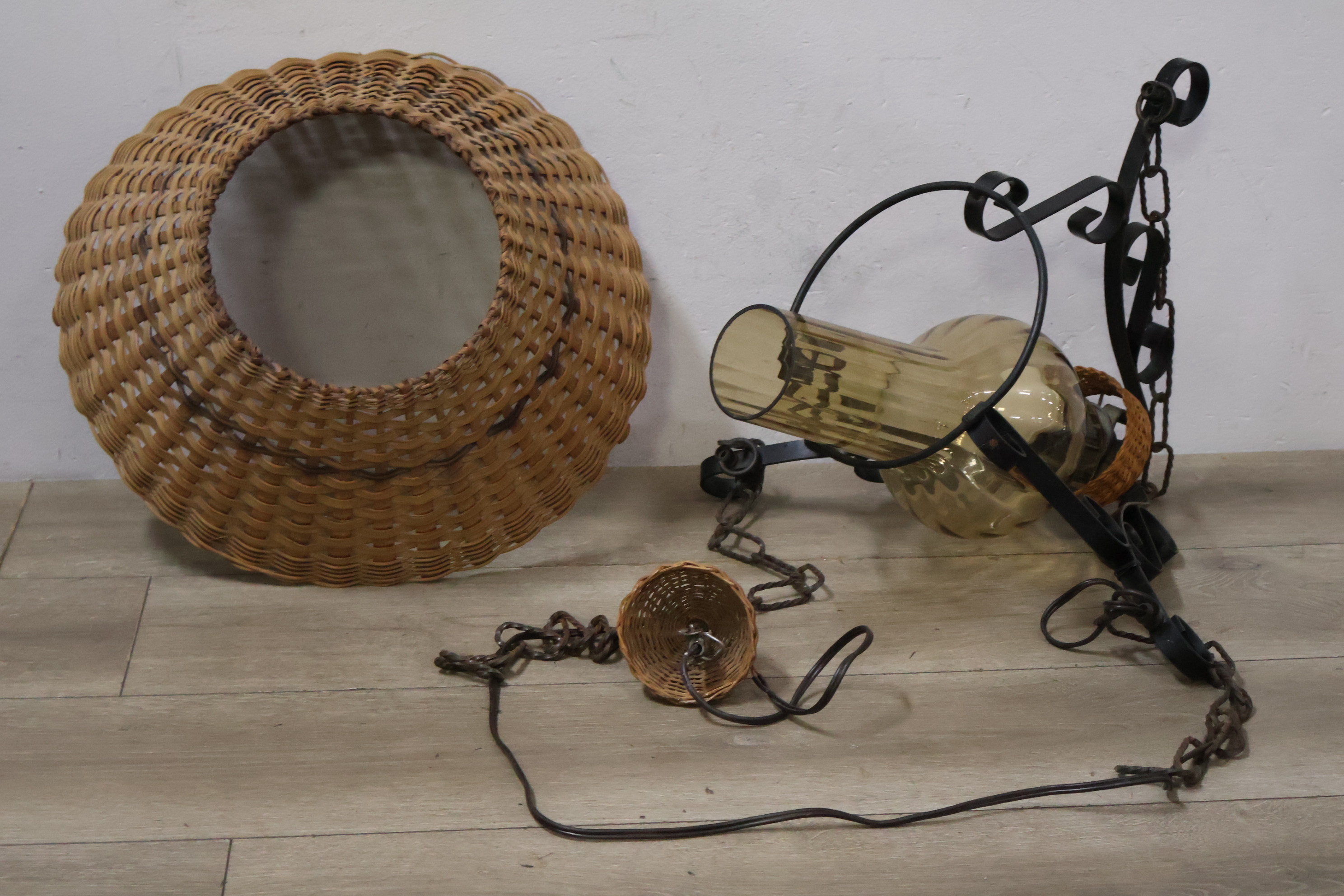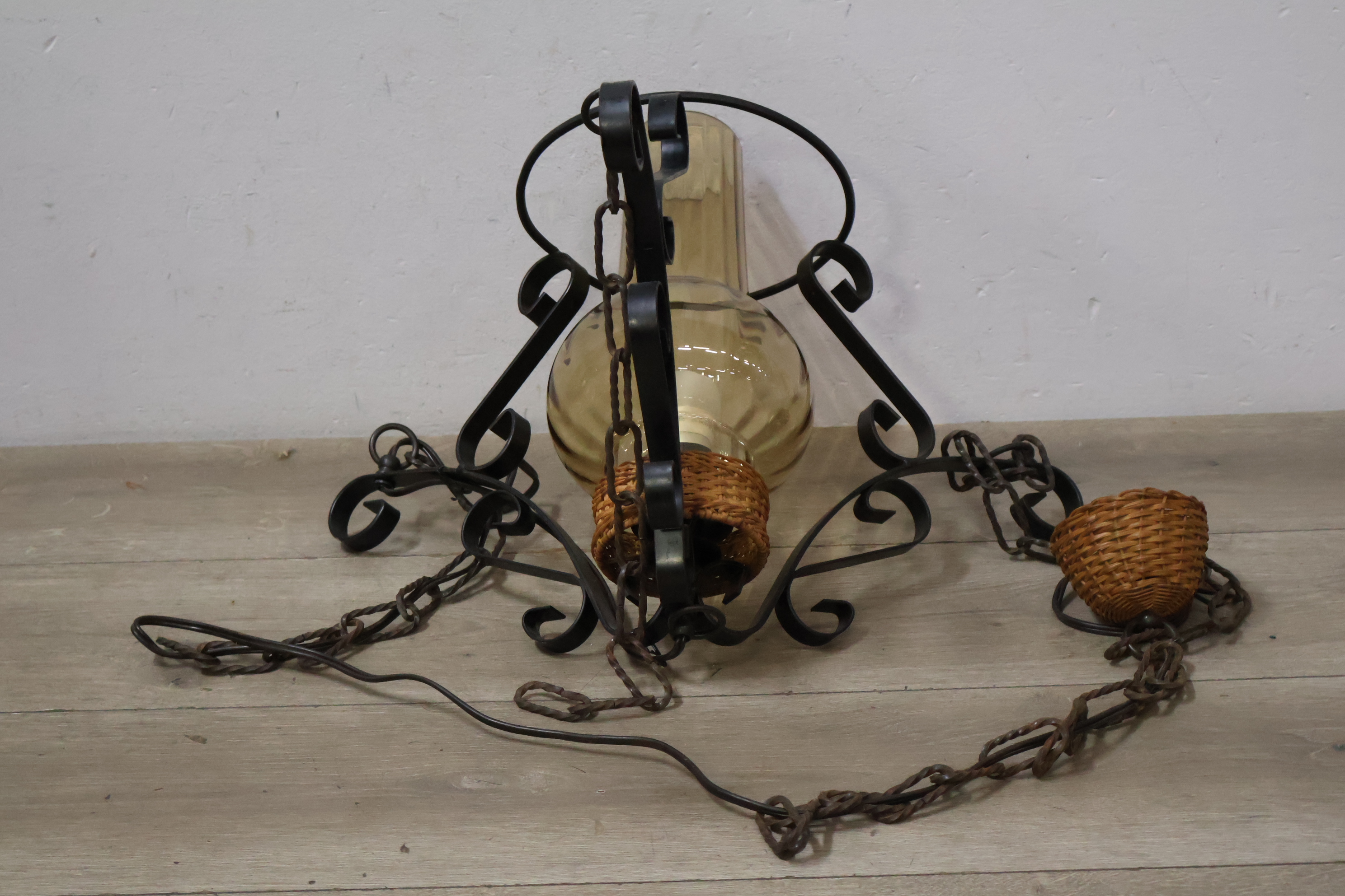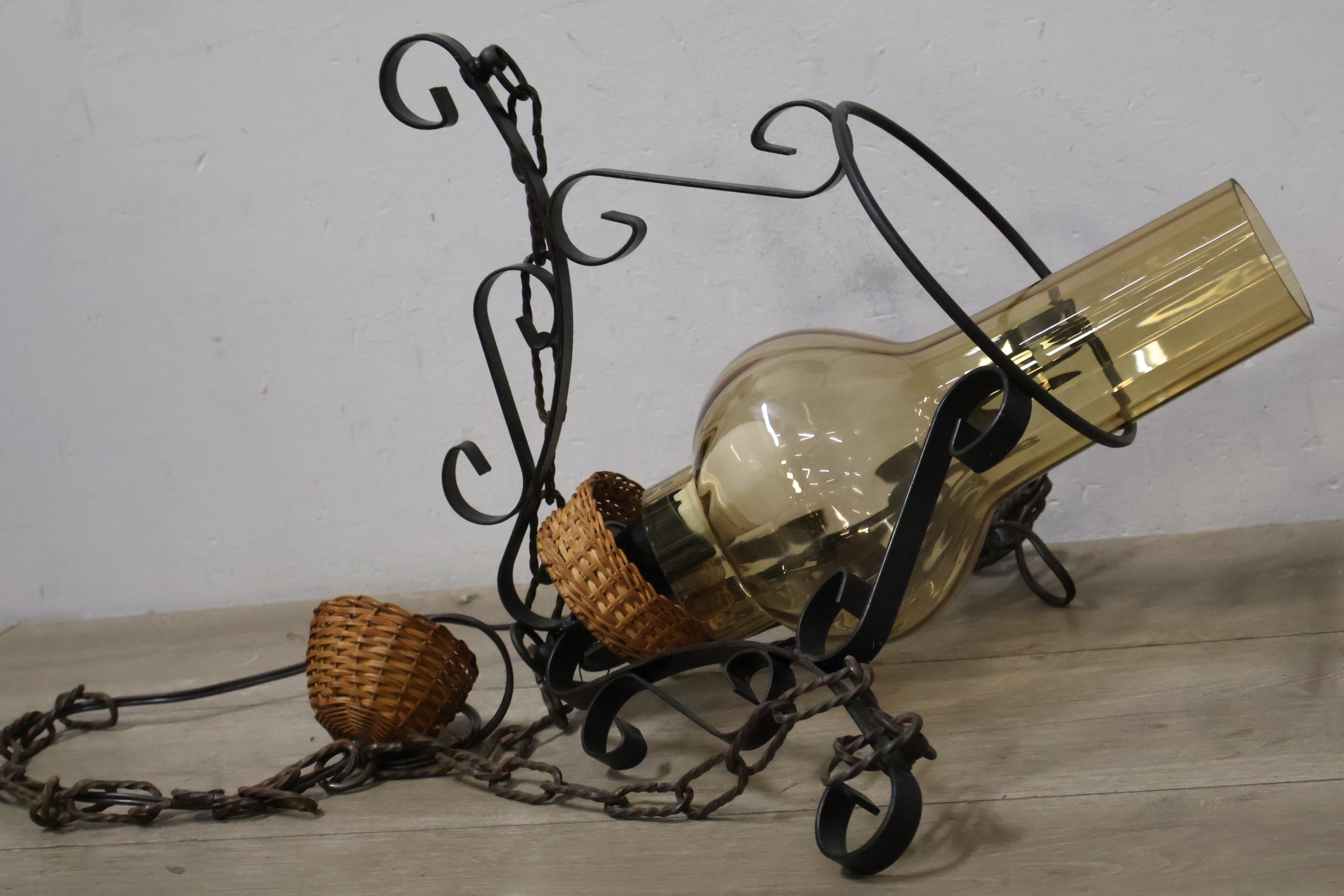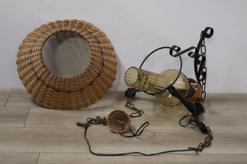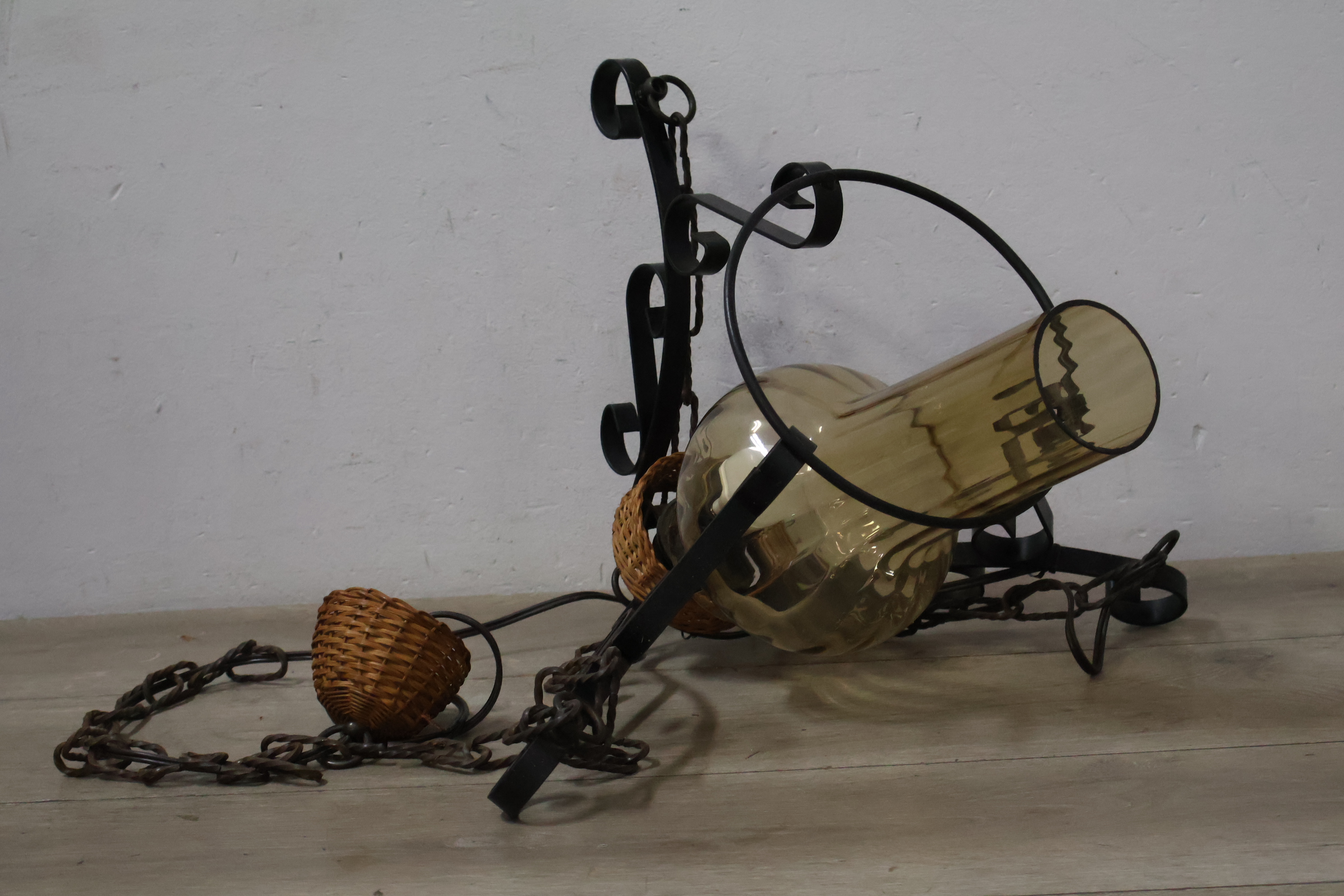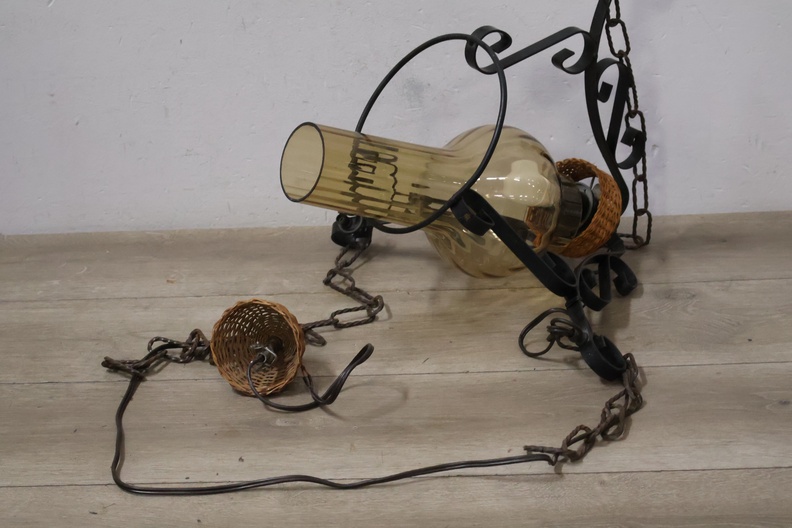 Vintage Smeedijzeren Hanglamp met Rotan Kap''