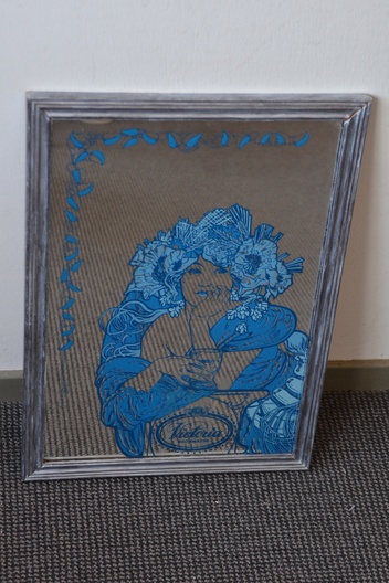 Fraaie reclamespiegel met een vrouw zichtbaar en de tekst eronder. In goede staat.