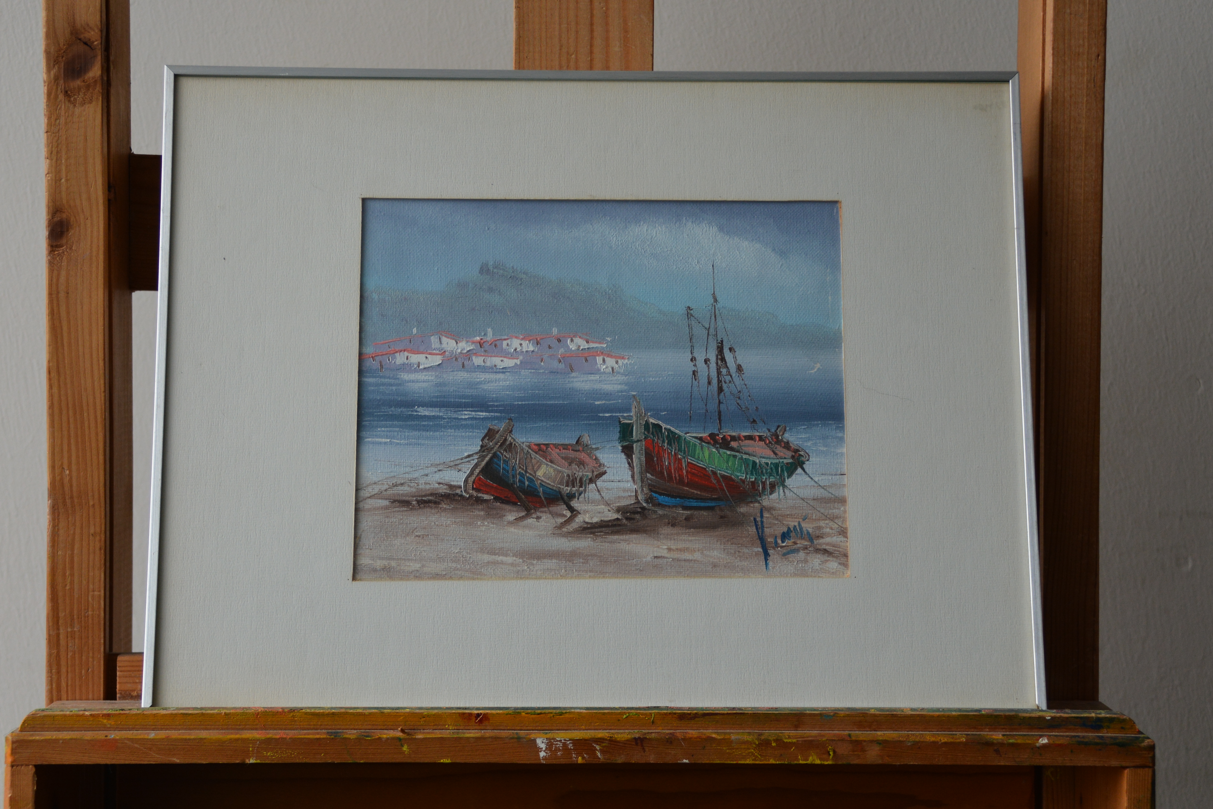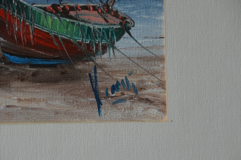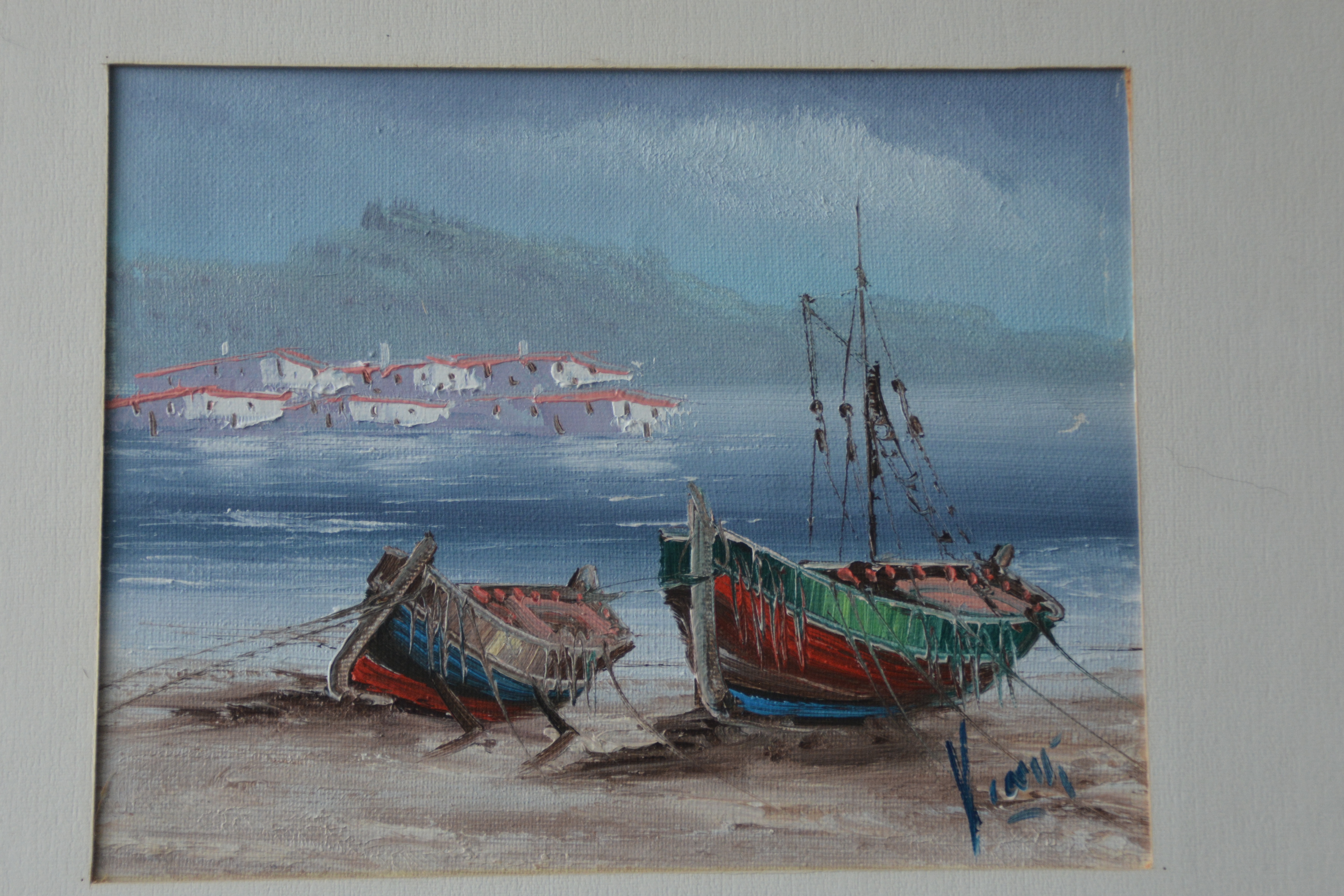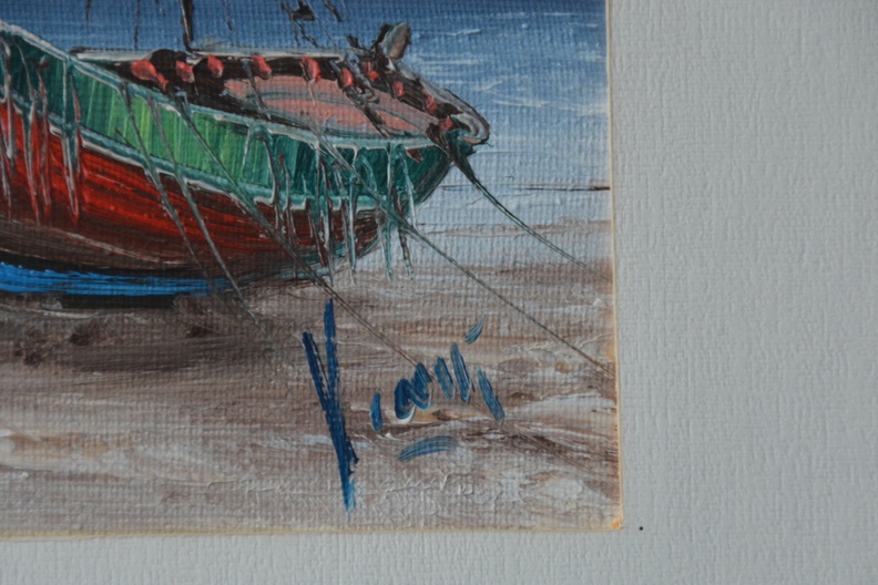Ingelijst schilderijtje: Boten op het strand van V. Ically
