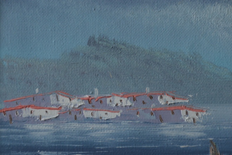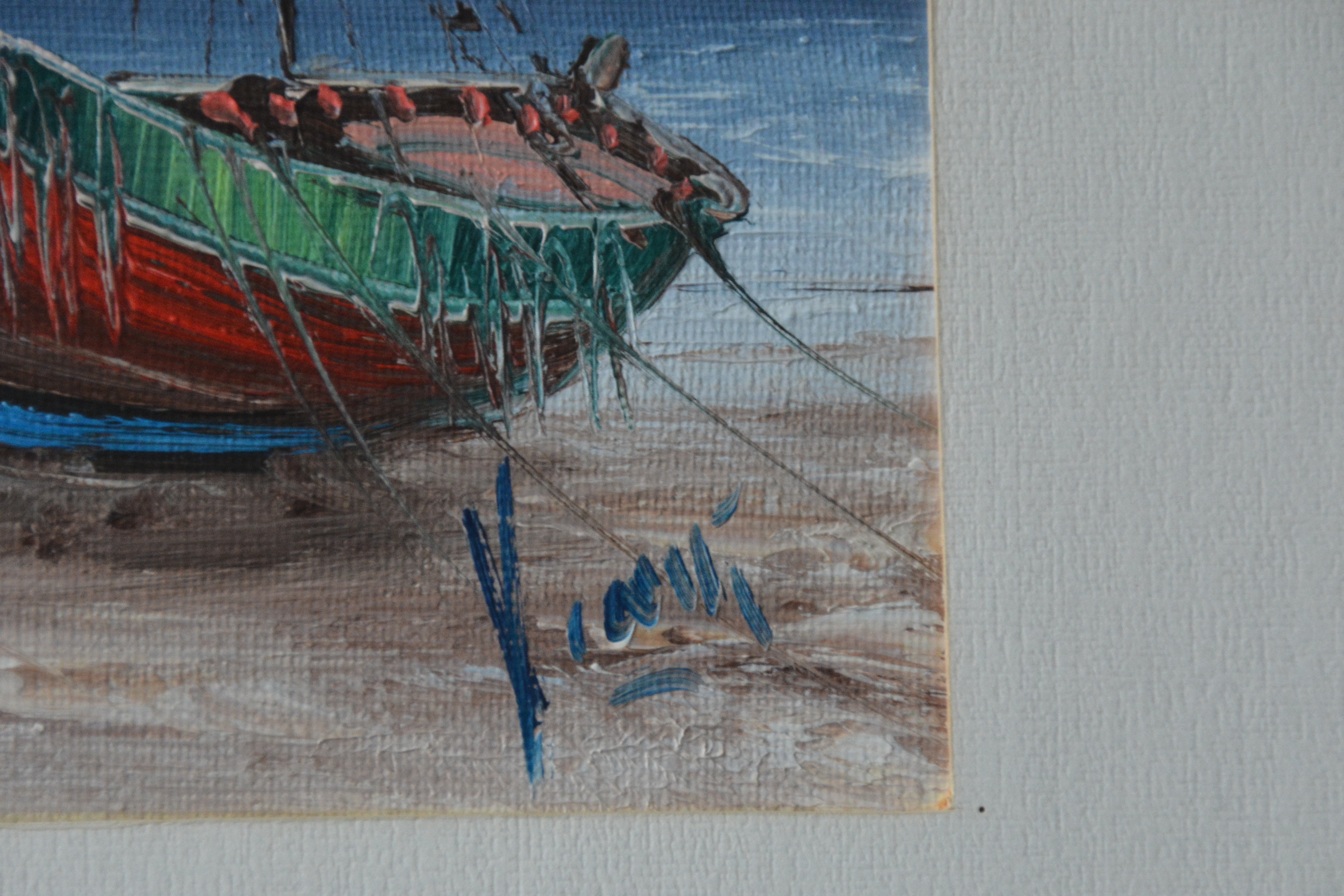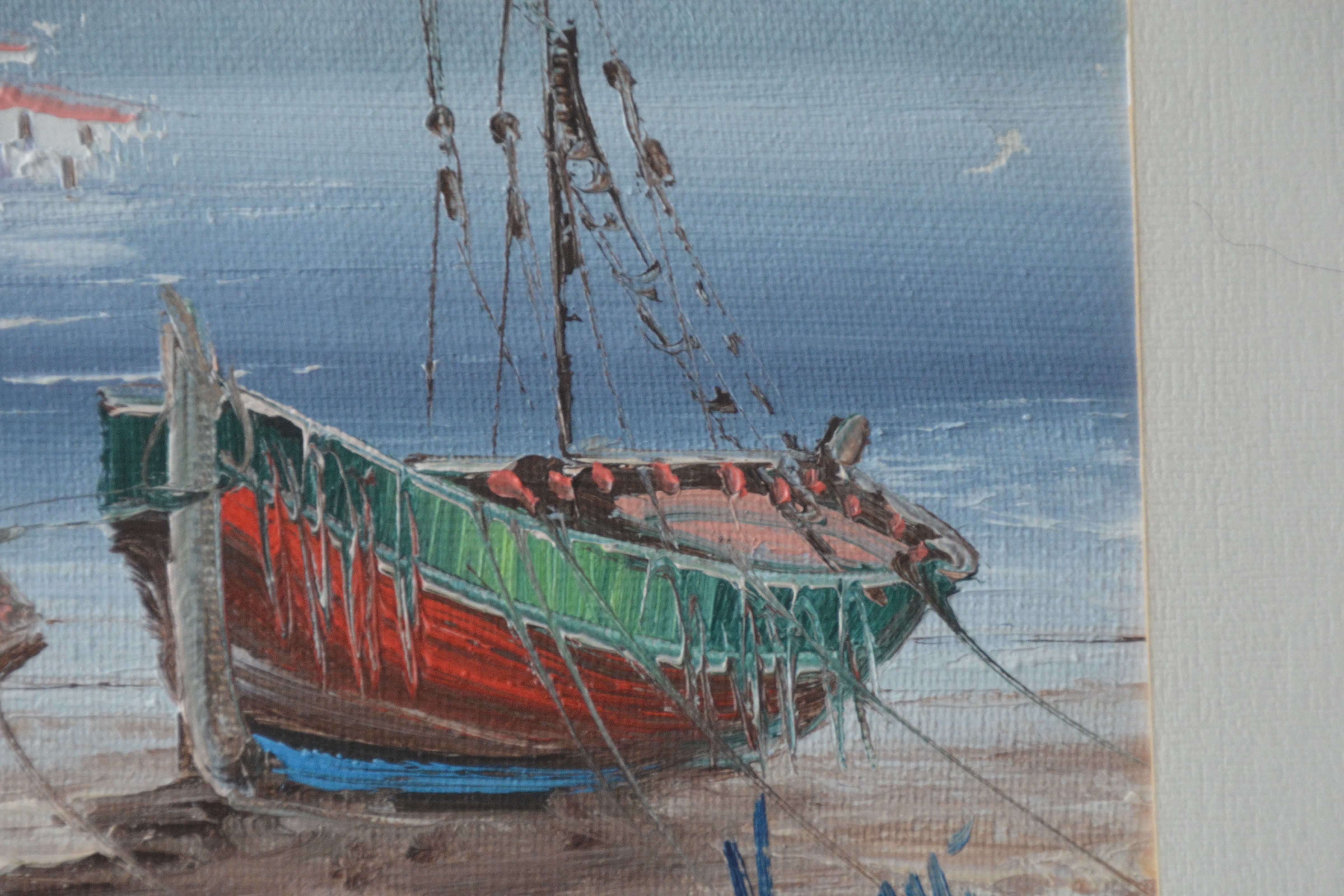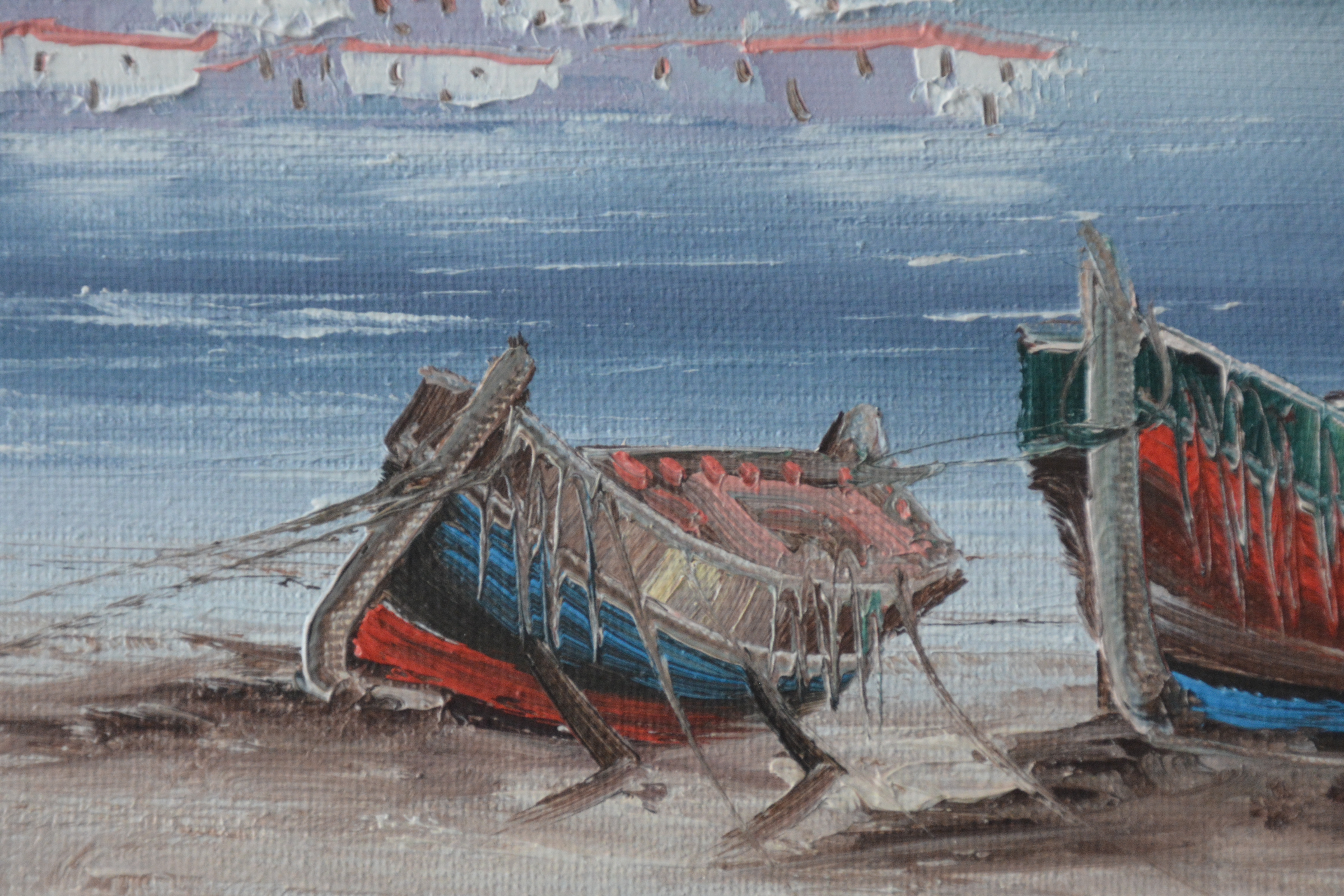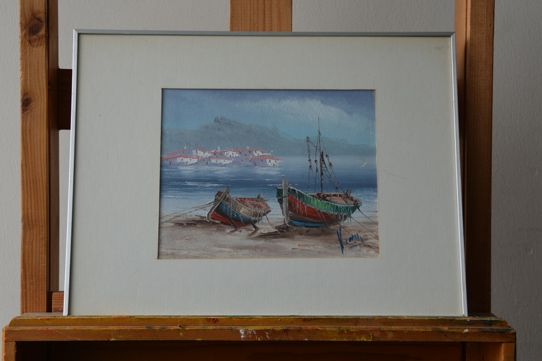 Romantisch schilderijtjevan boten aan het strand in een idyllisch landschap. Geschilderd op doek en afgezet met een paneel. In goede staat.