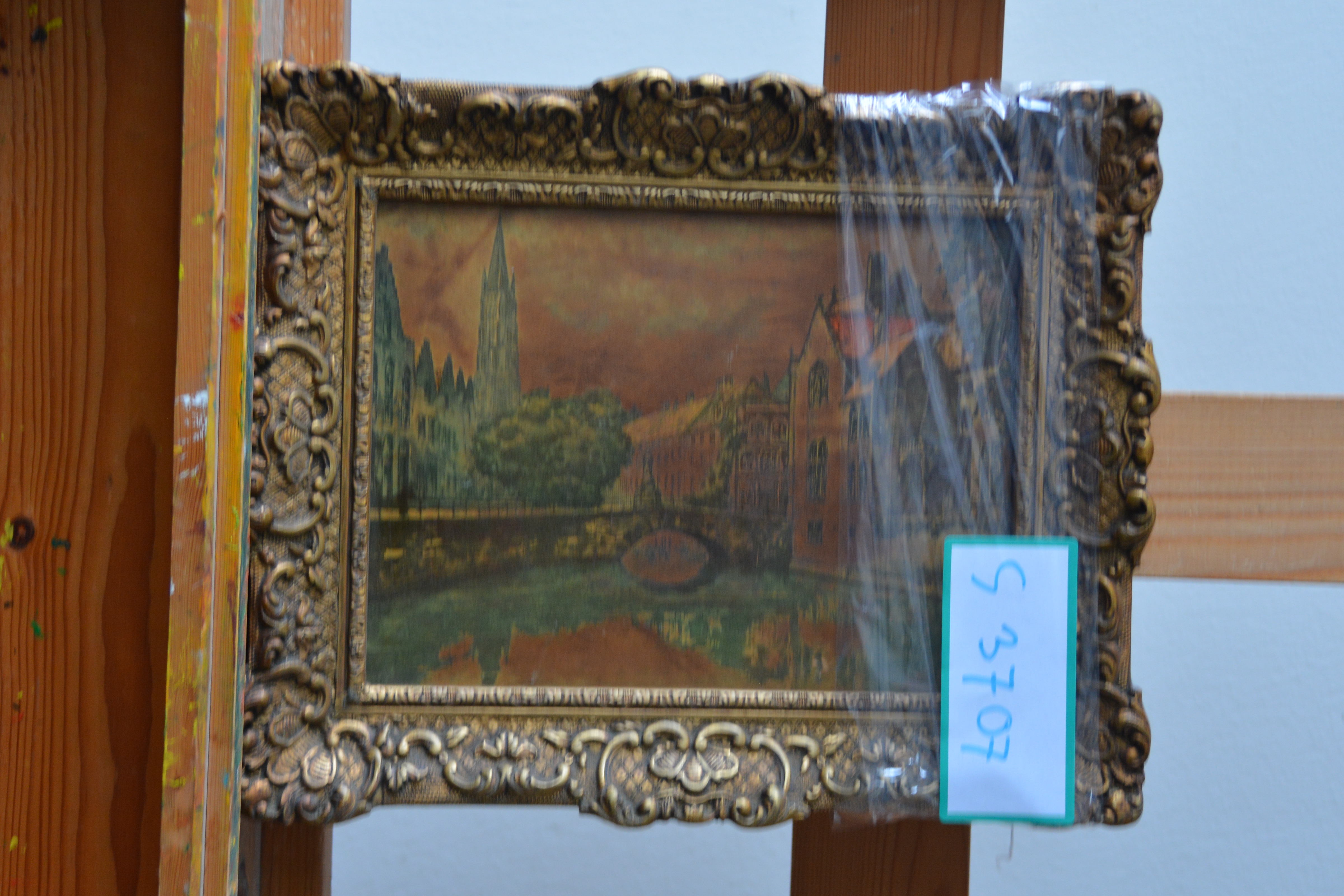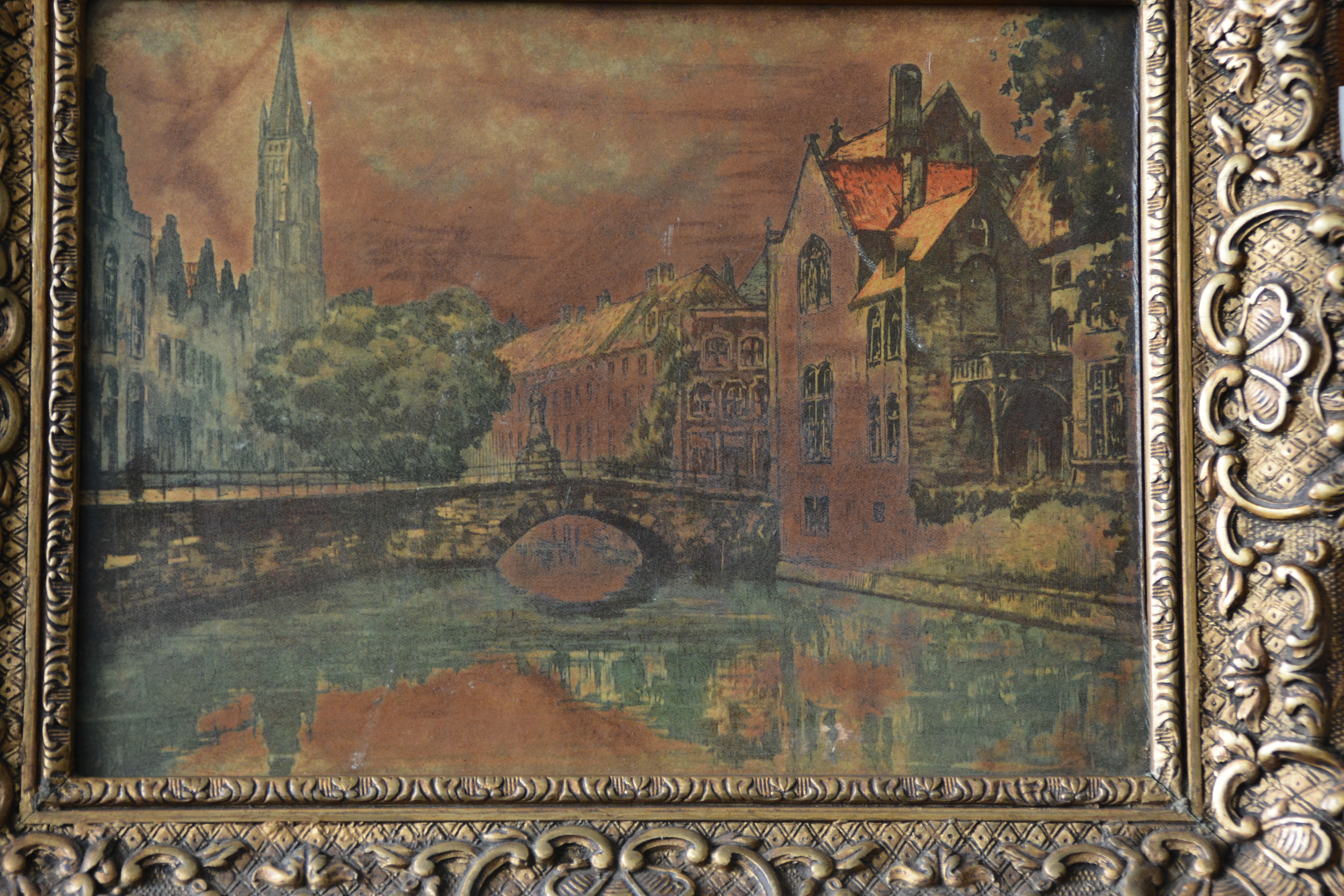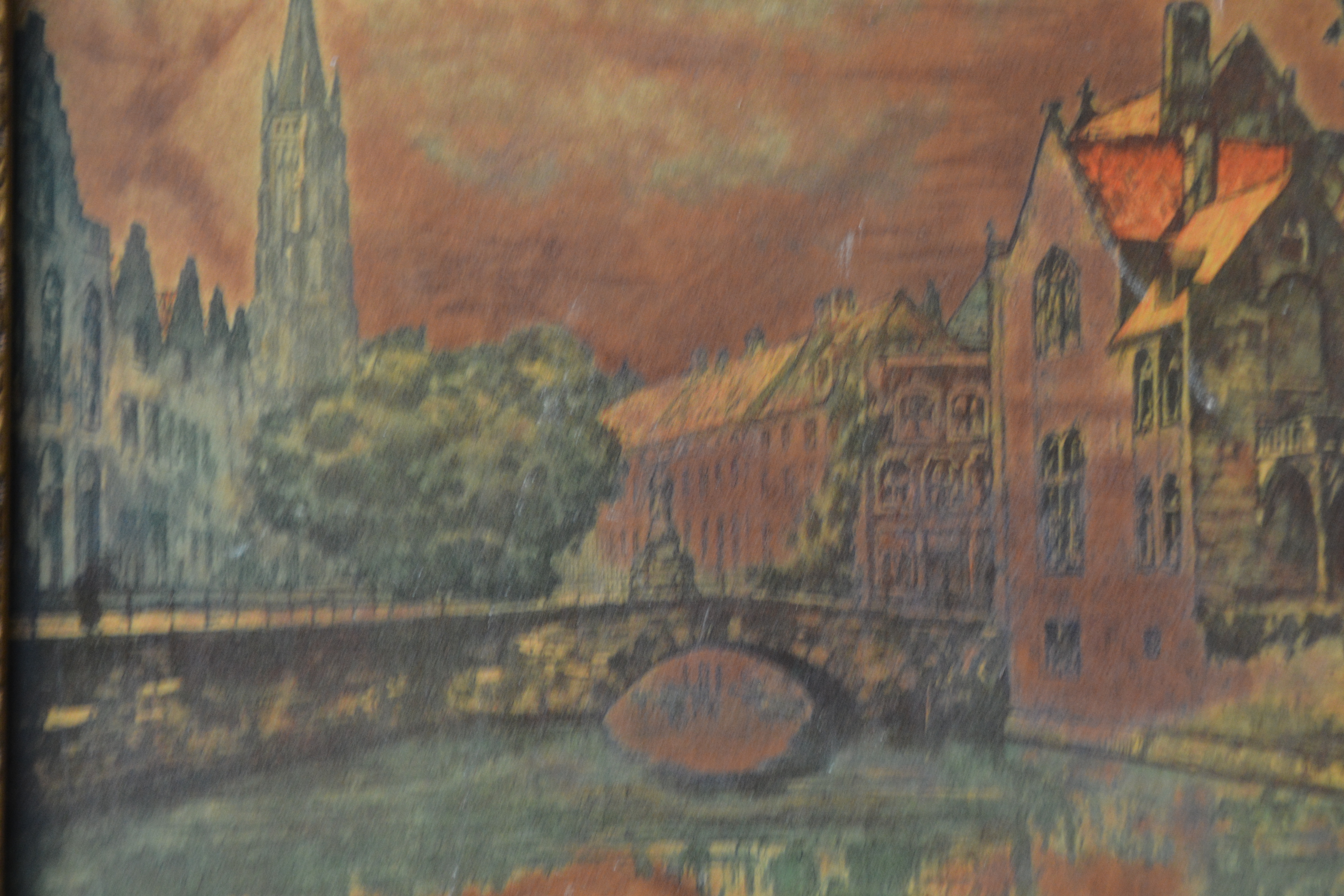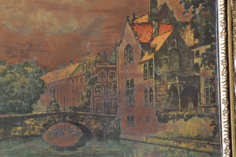 Deels geschilderd en deels ingebrand. In avondkleuren zien we wat grachtenhuizen en een kerk en bruggetje in Amsterdam. Met weelderige ljst er om heen. Verf op paneel. In goede staat. Niet zichtbaar gesigneerd.