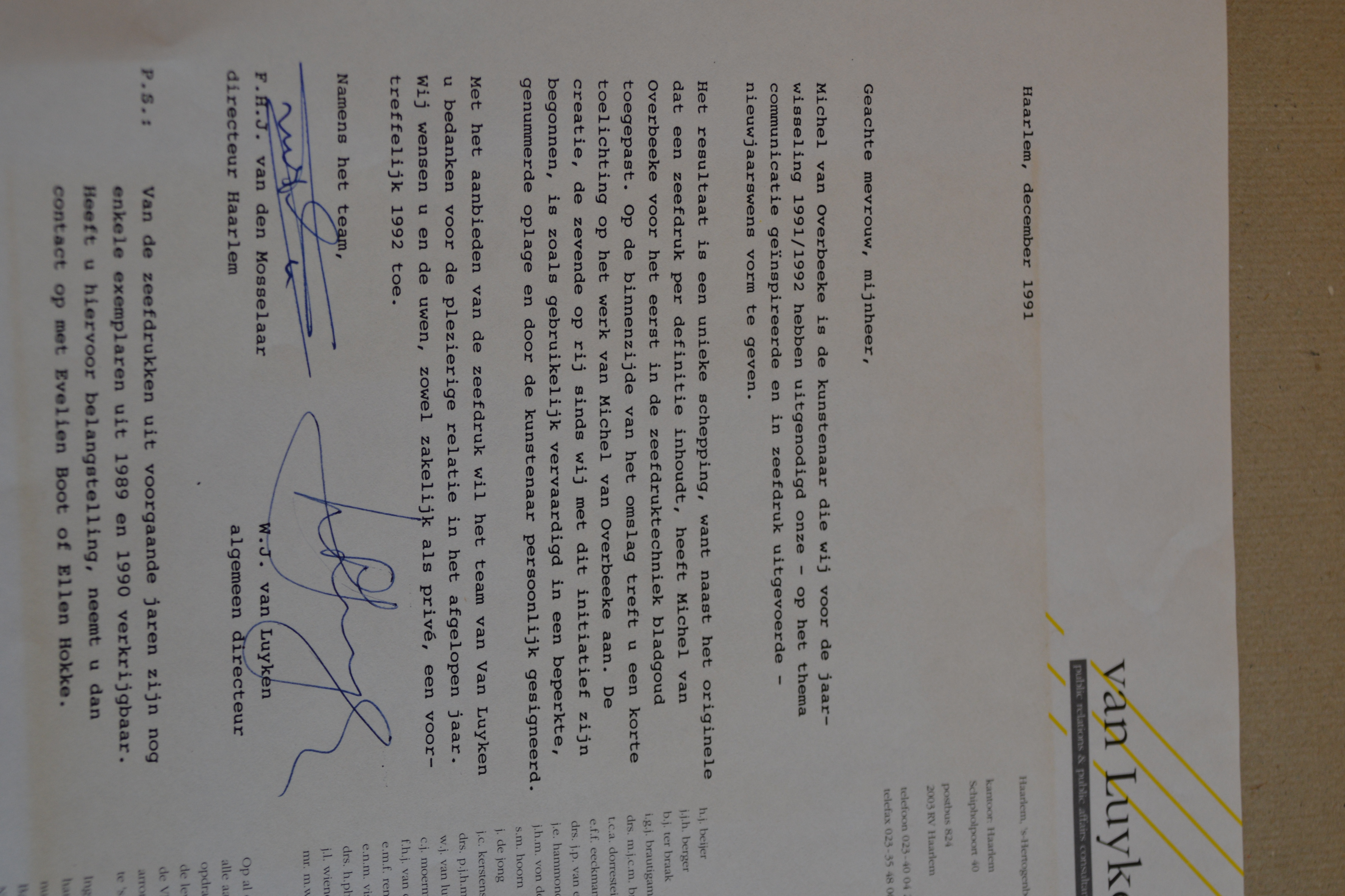 Michel van Overbeeke staat bekend om zijn glazen kroonluchters in het provinciehuis Paviljoen Welgelegen en zijn glas-in-loodraam in de Grote of St. Bavokerk te Haarlem, maar hij deed veel meer dan dat. Michel was schilder, tekenaar, fotograaf, filmer en keramist. Hij werkte graag met gemengde technieken. “In ieder medium kun je op een andere manier iets uitdrukken.”