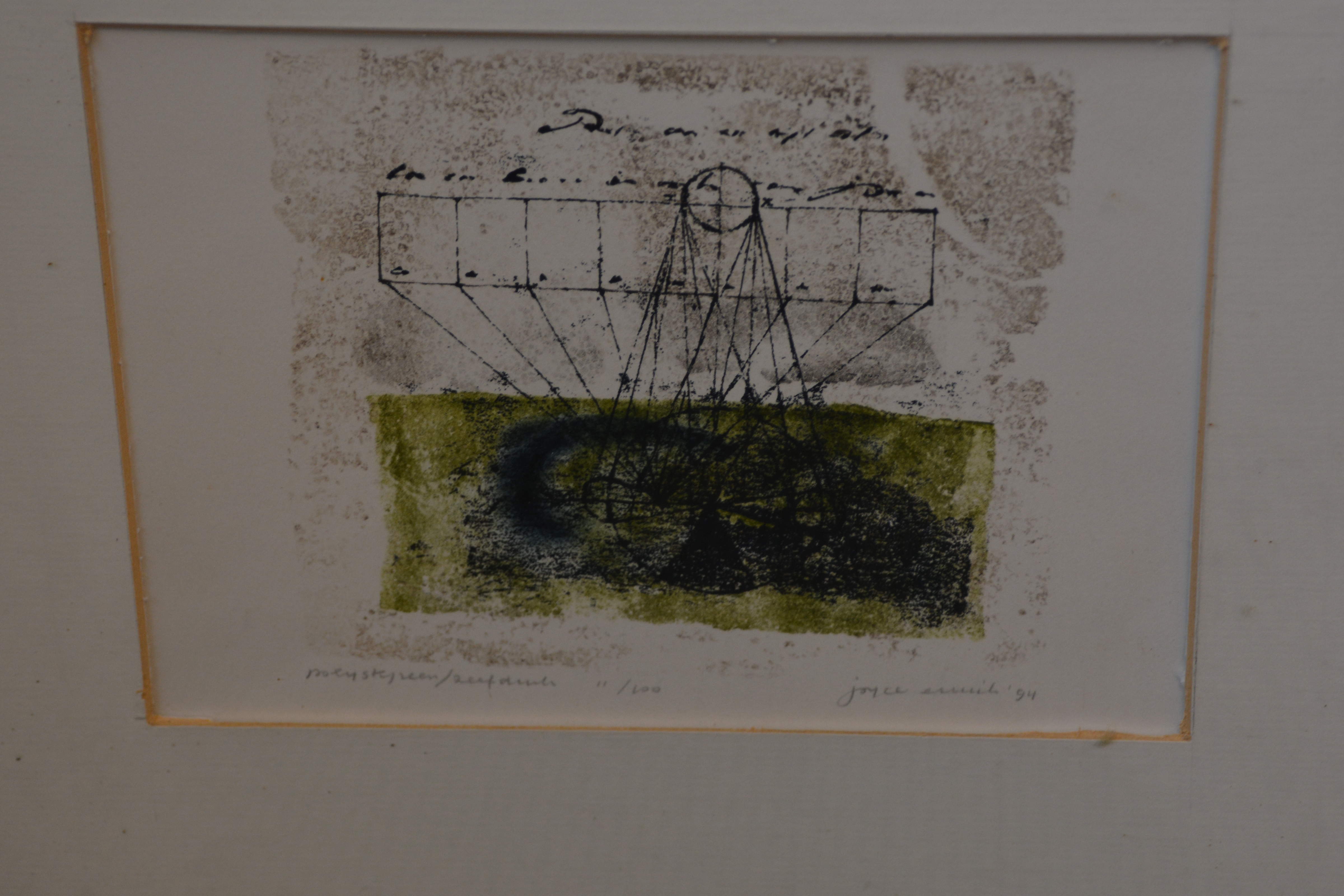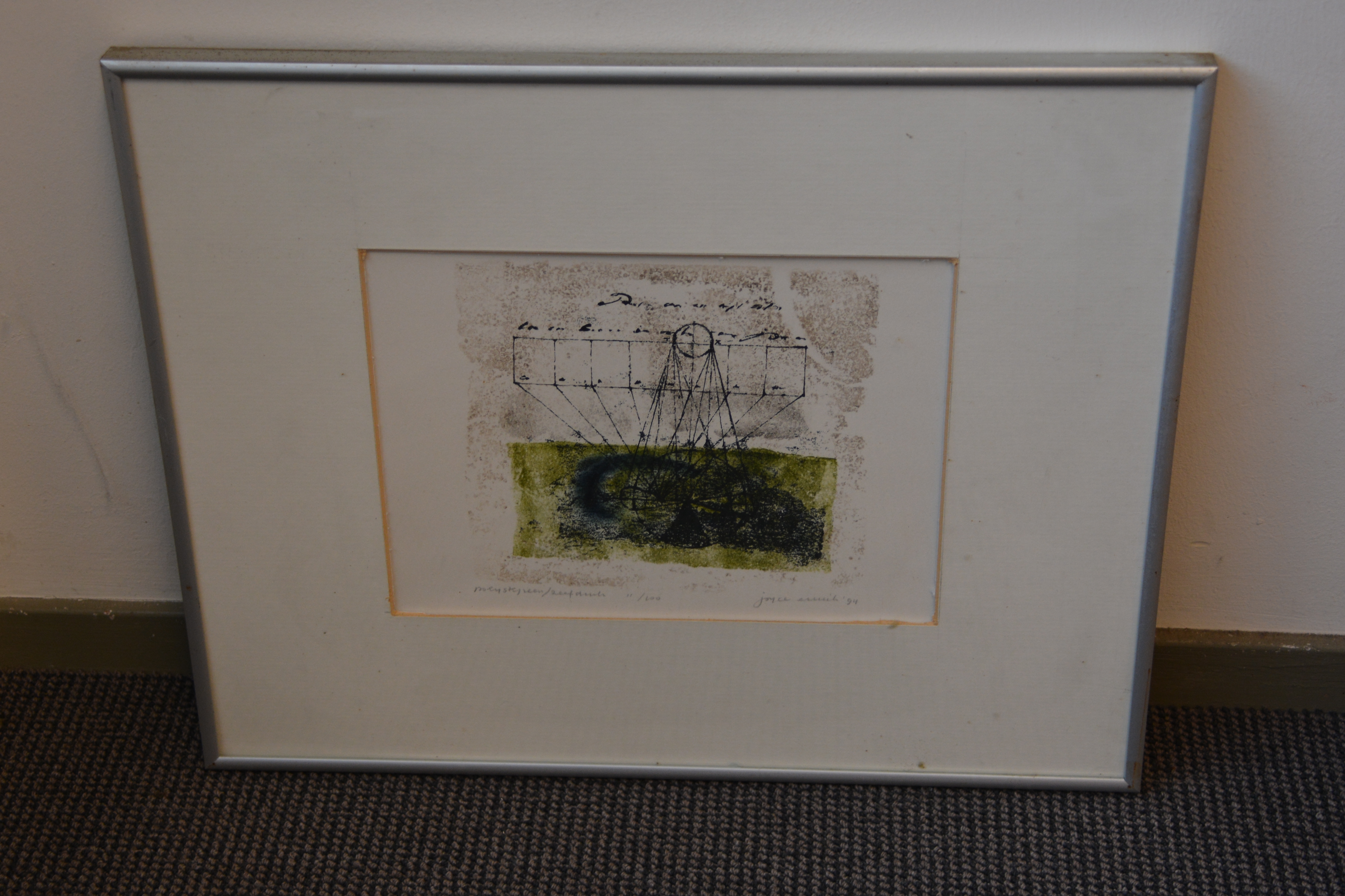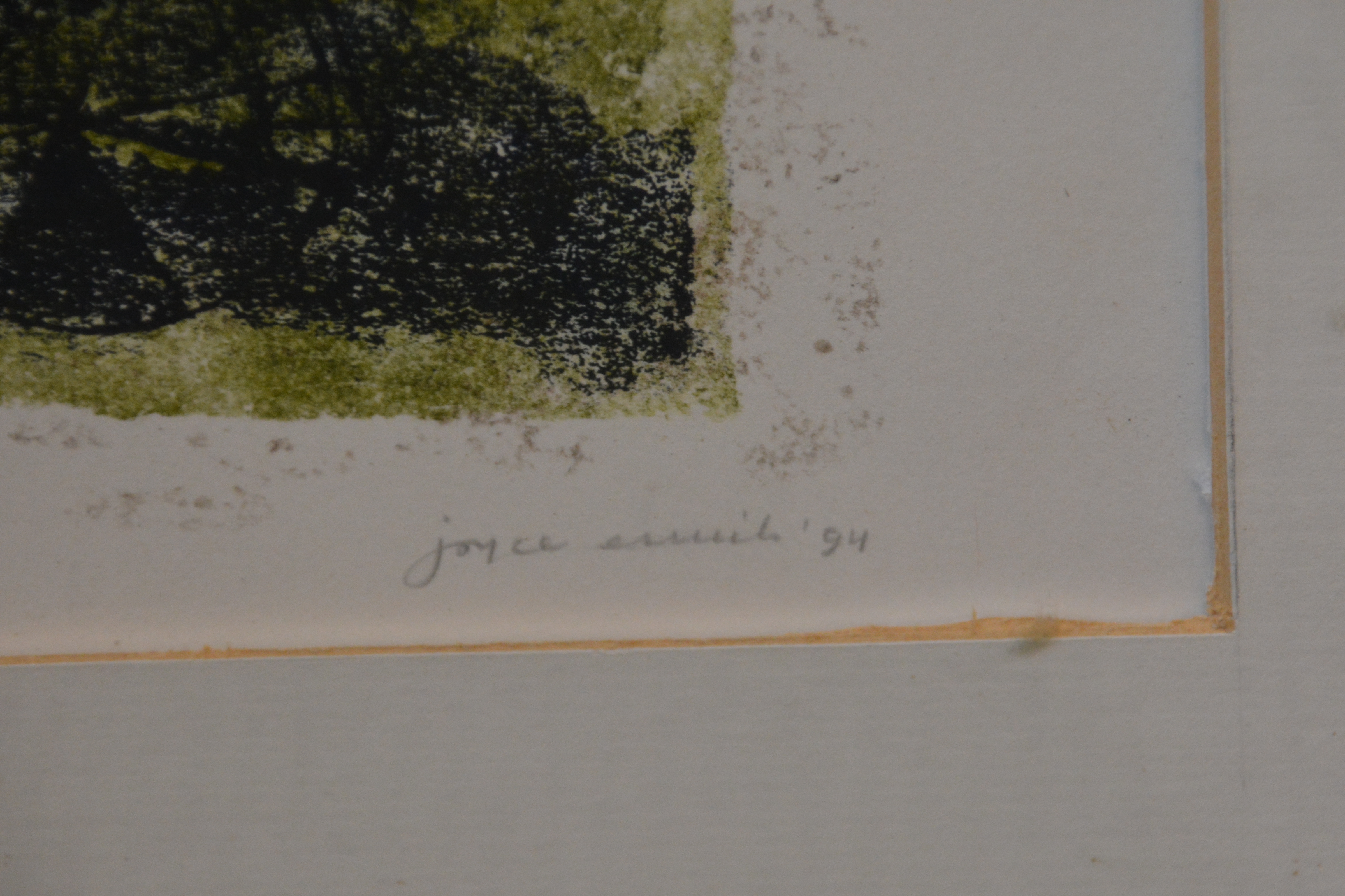 Gesigneerd met ‘Joyce (?…Niet goed leesbaar)’. Uit 1994. Ingelijst en in goede staat.