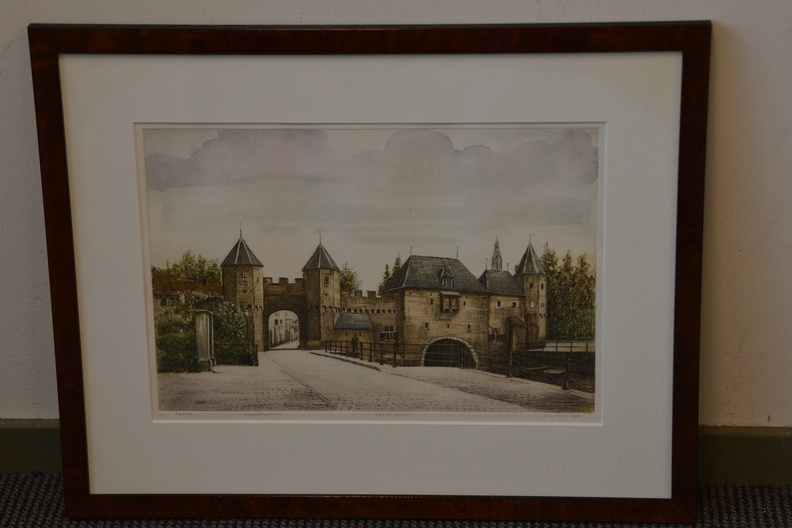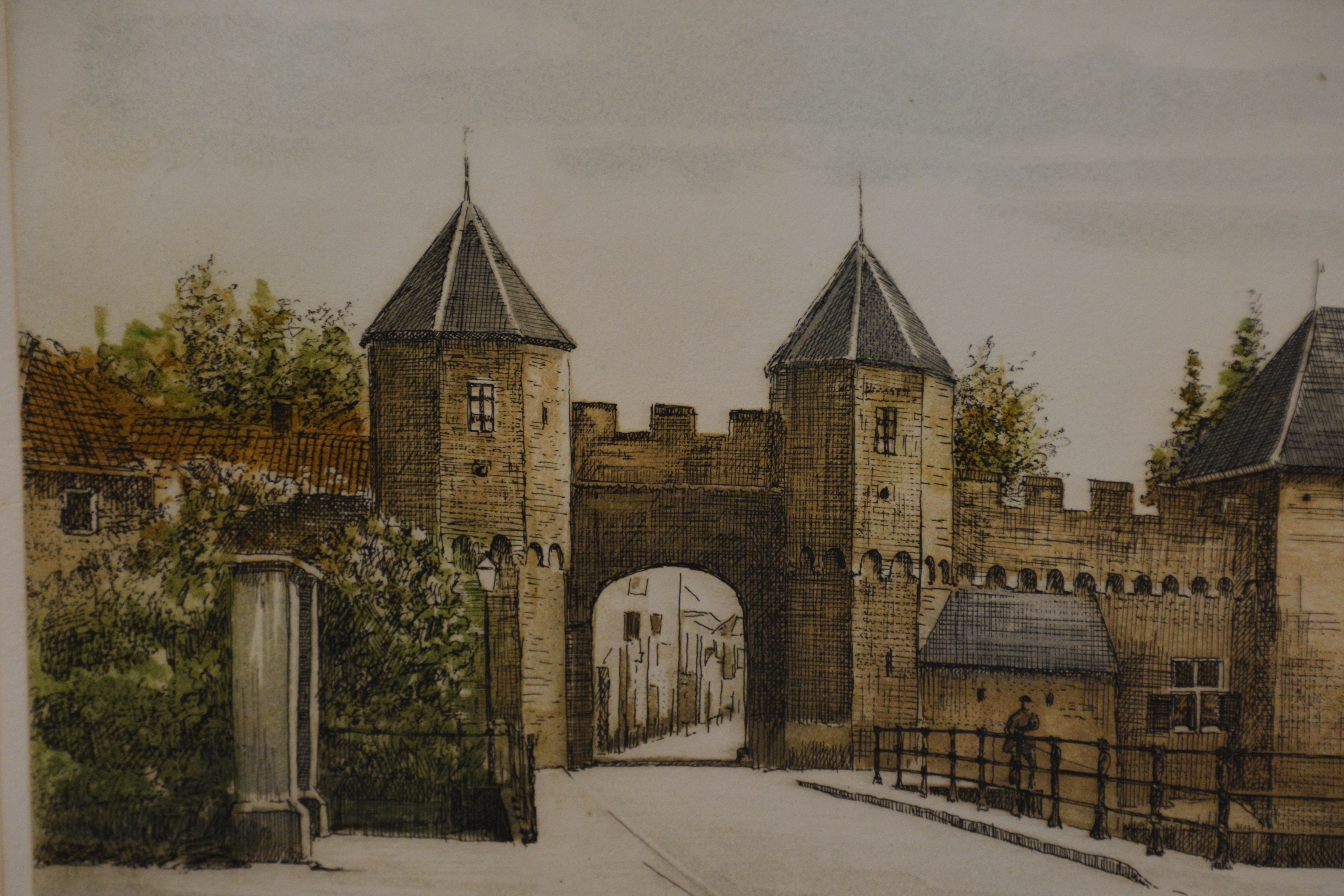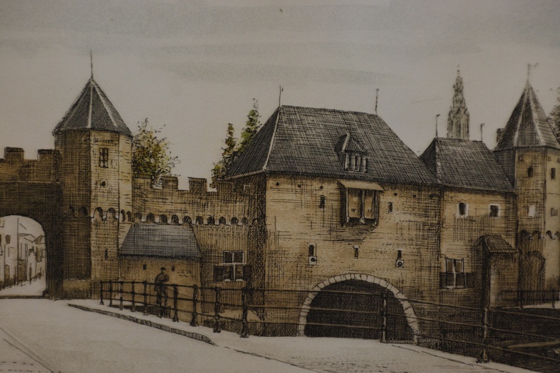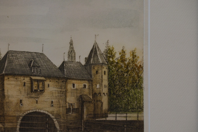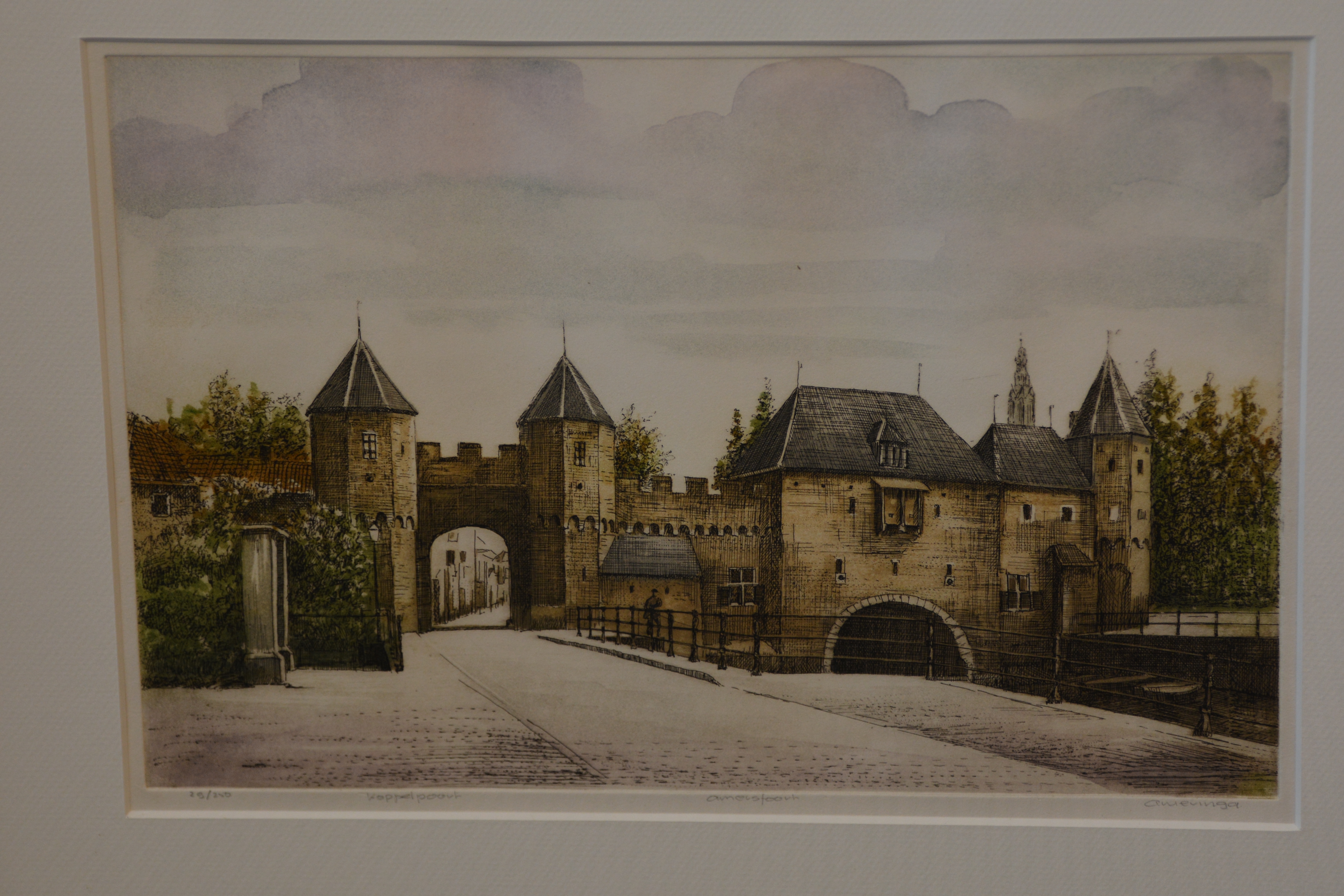 Ingekleurde ets van A. Wieringa: 'Amersfoort, Koppelpoort'