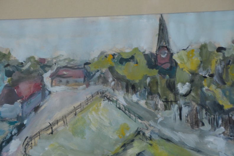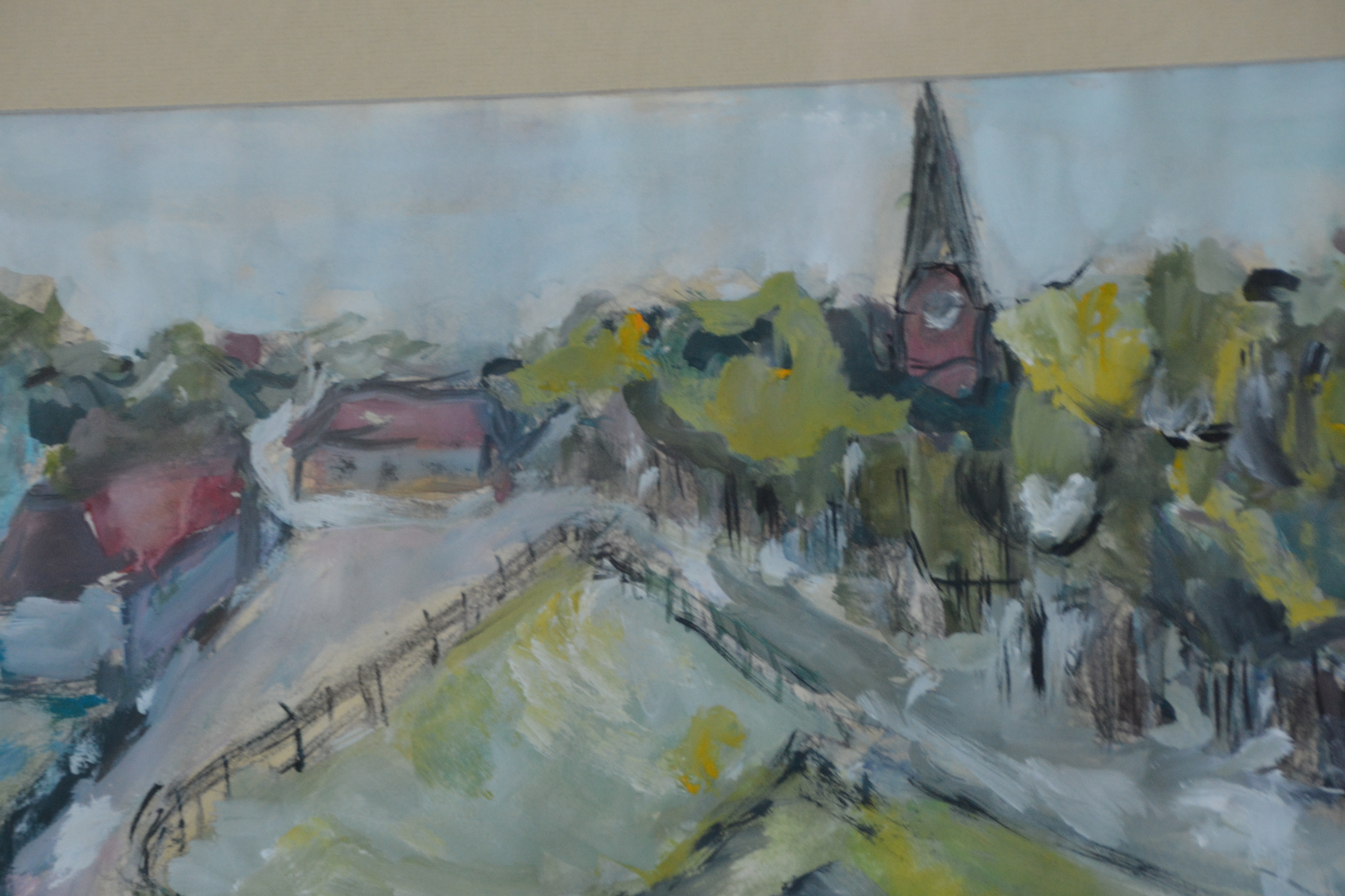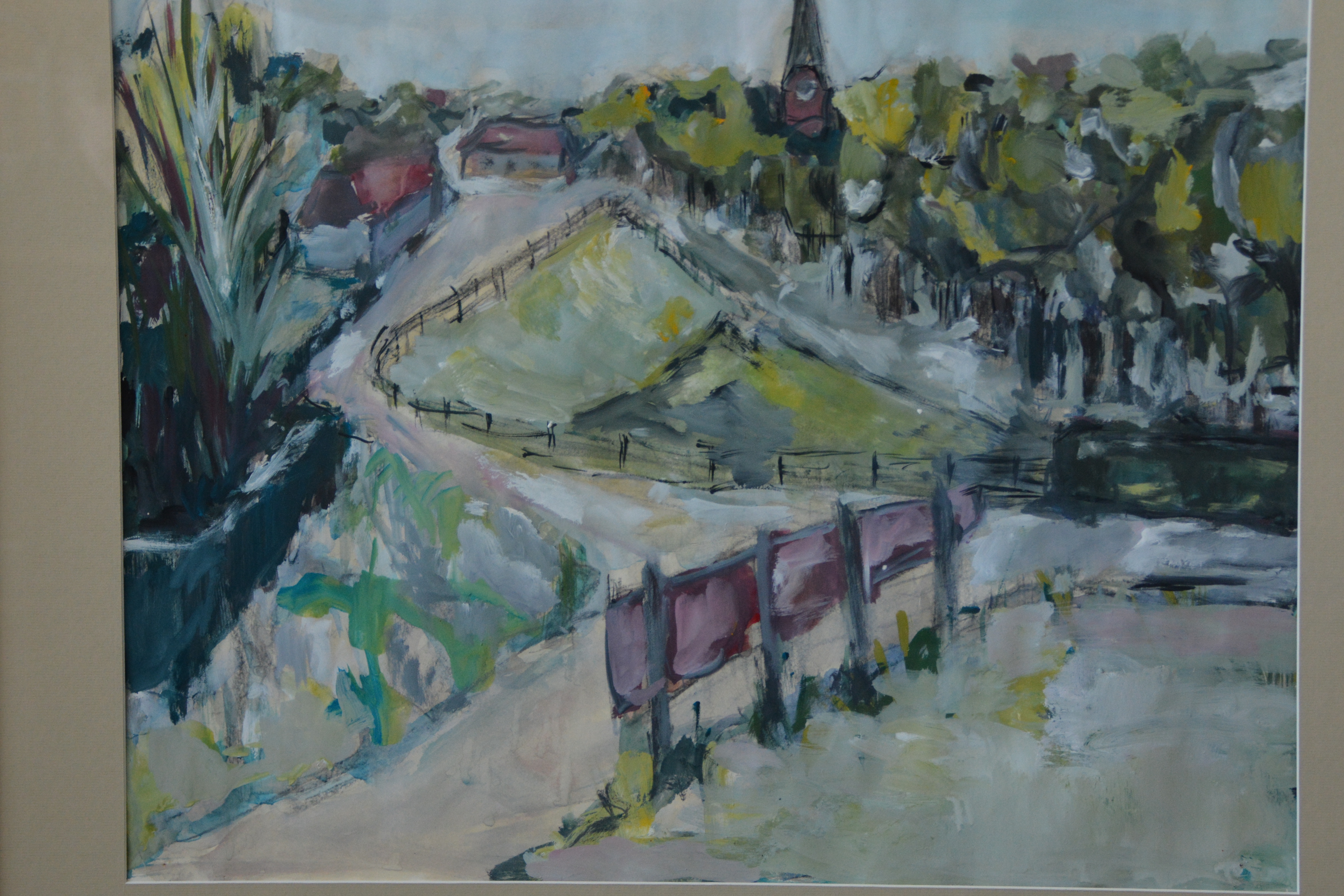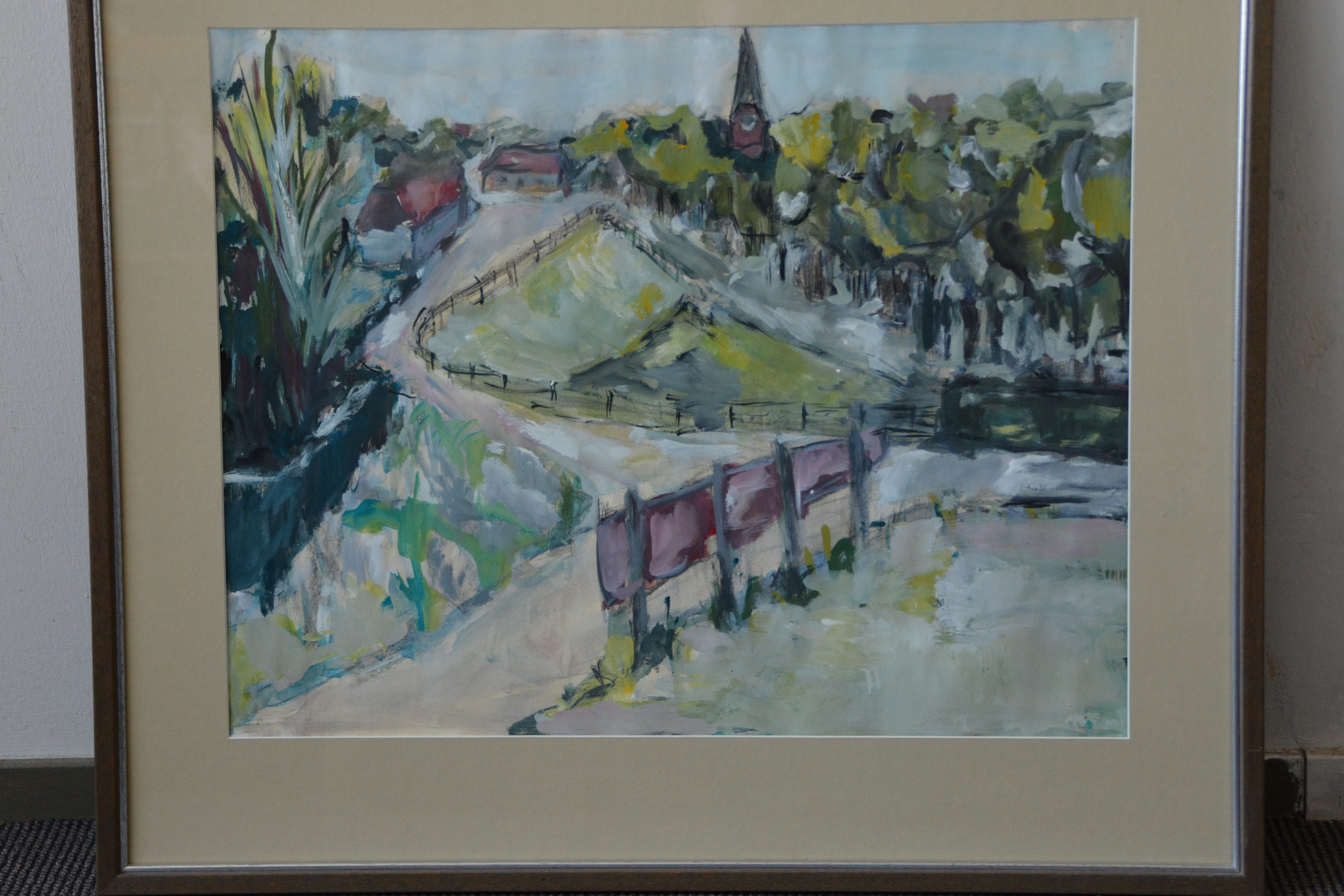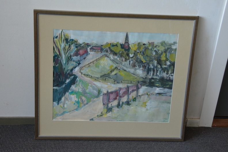 Ingelijste aquarel van een dorpsbrink''