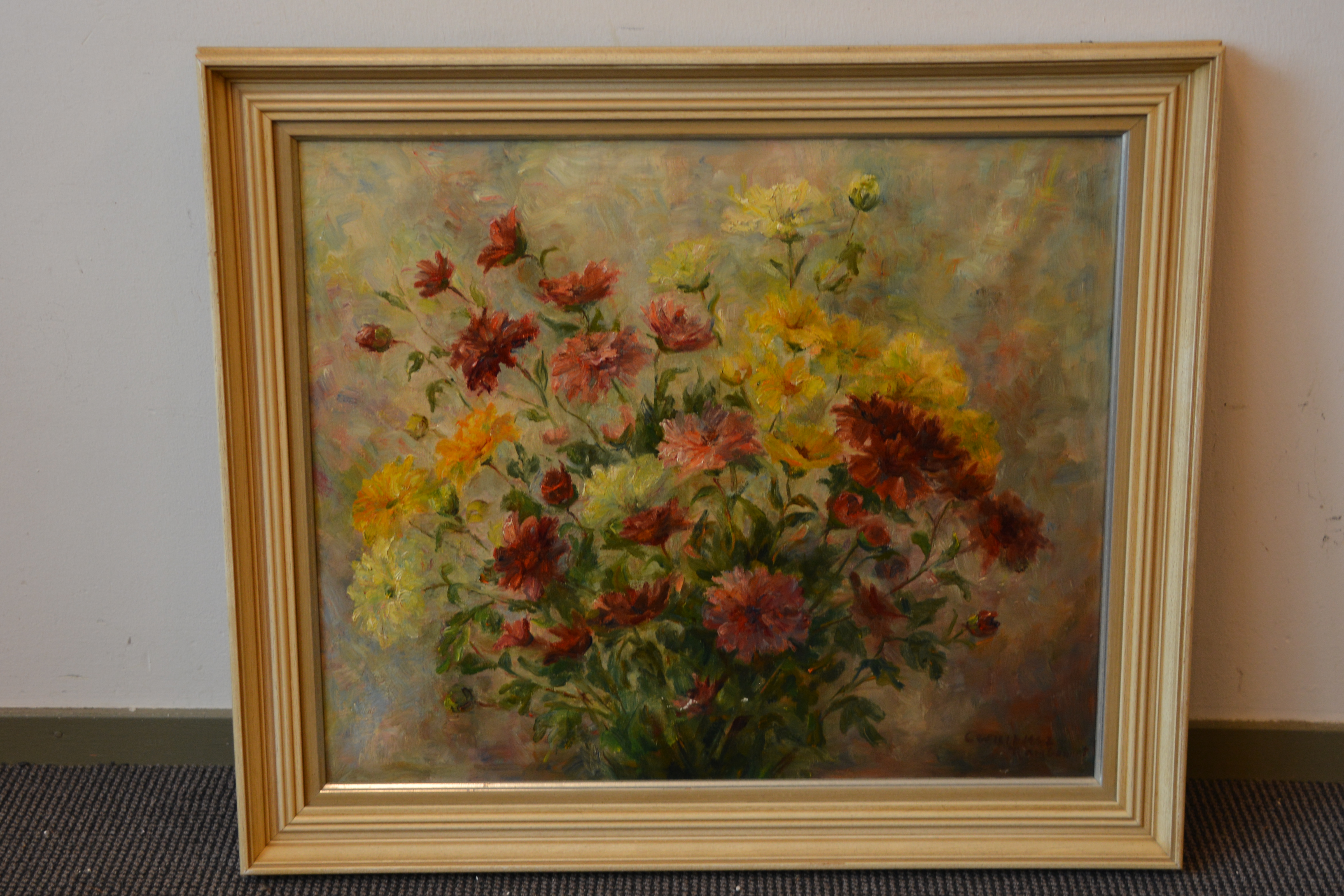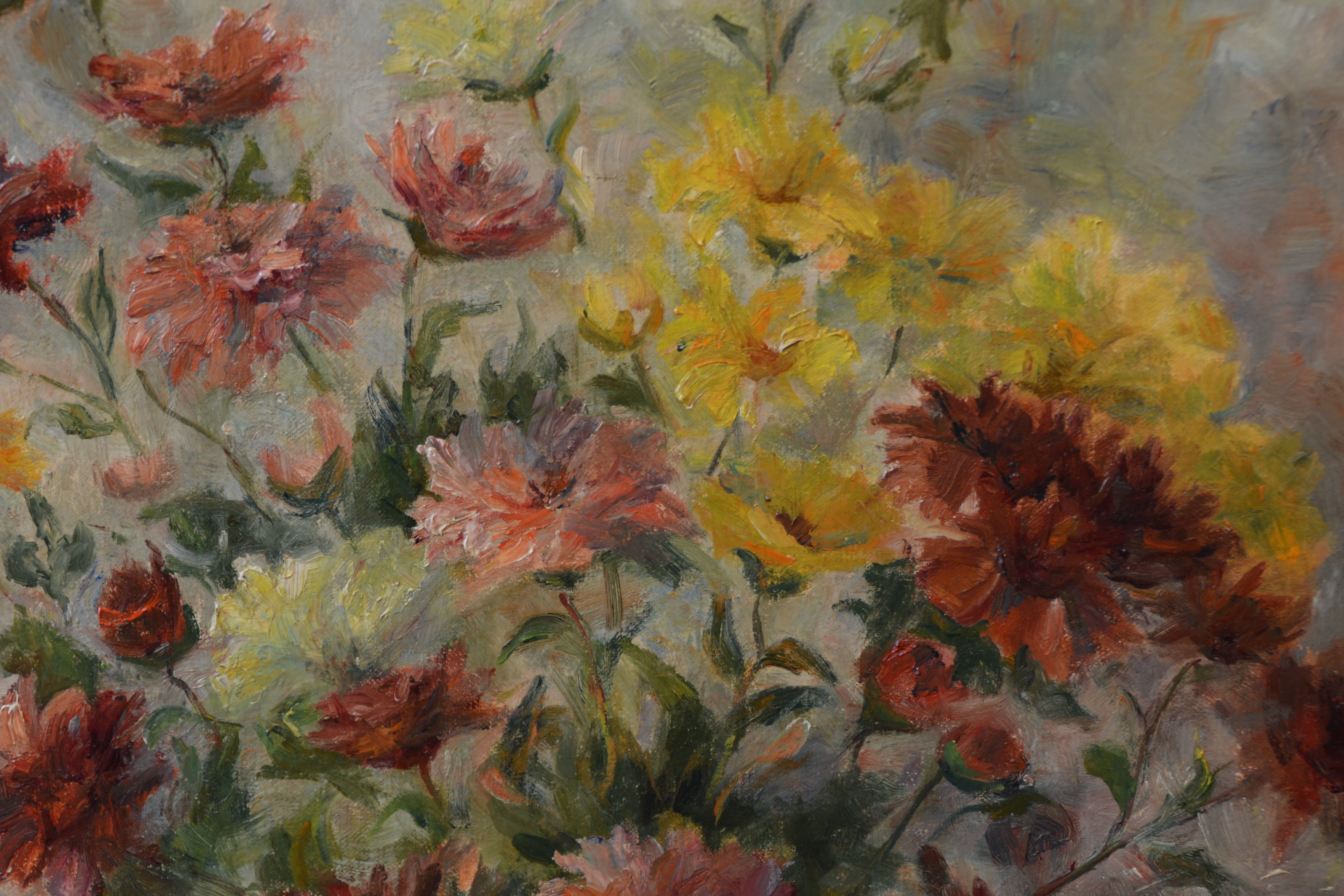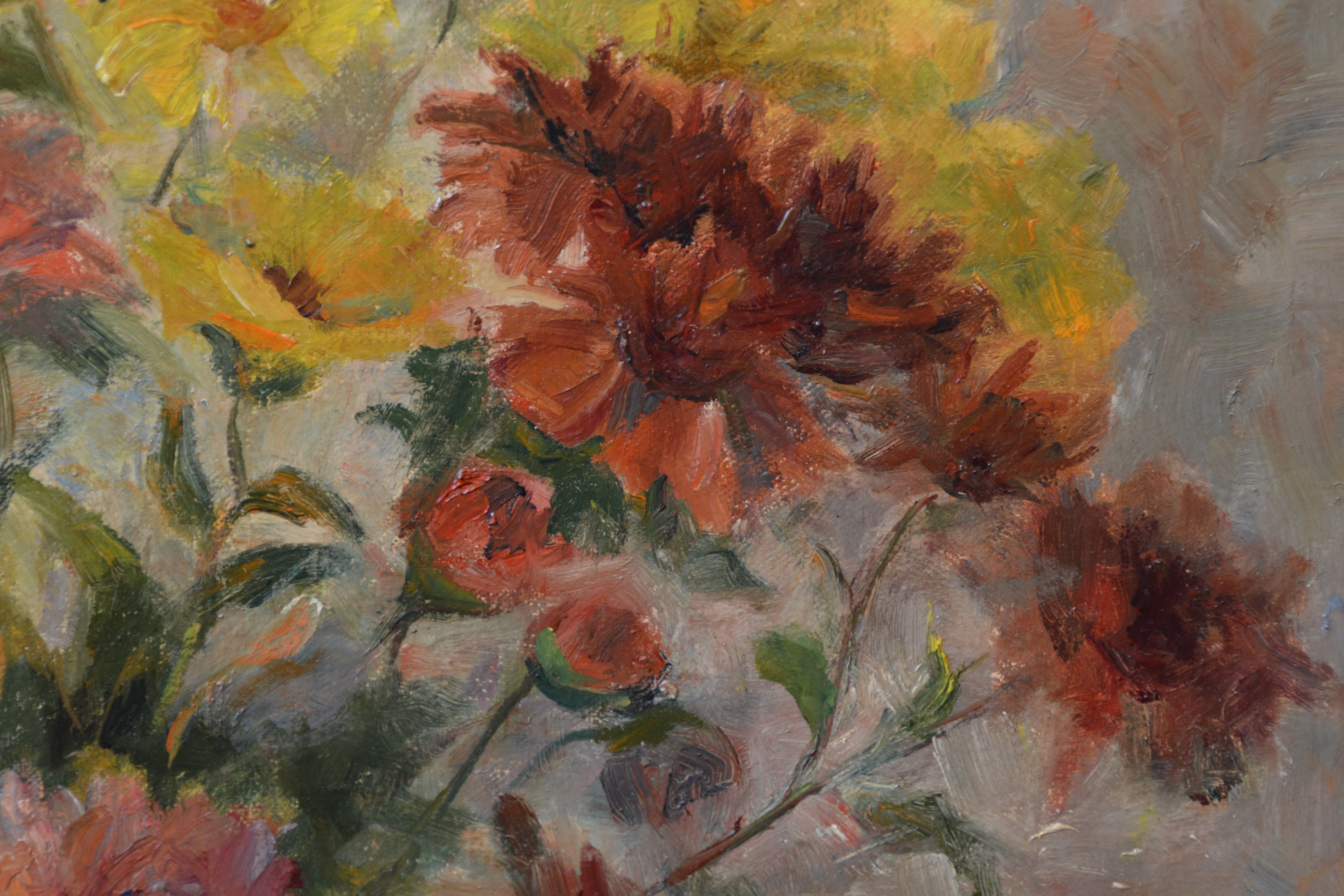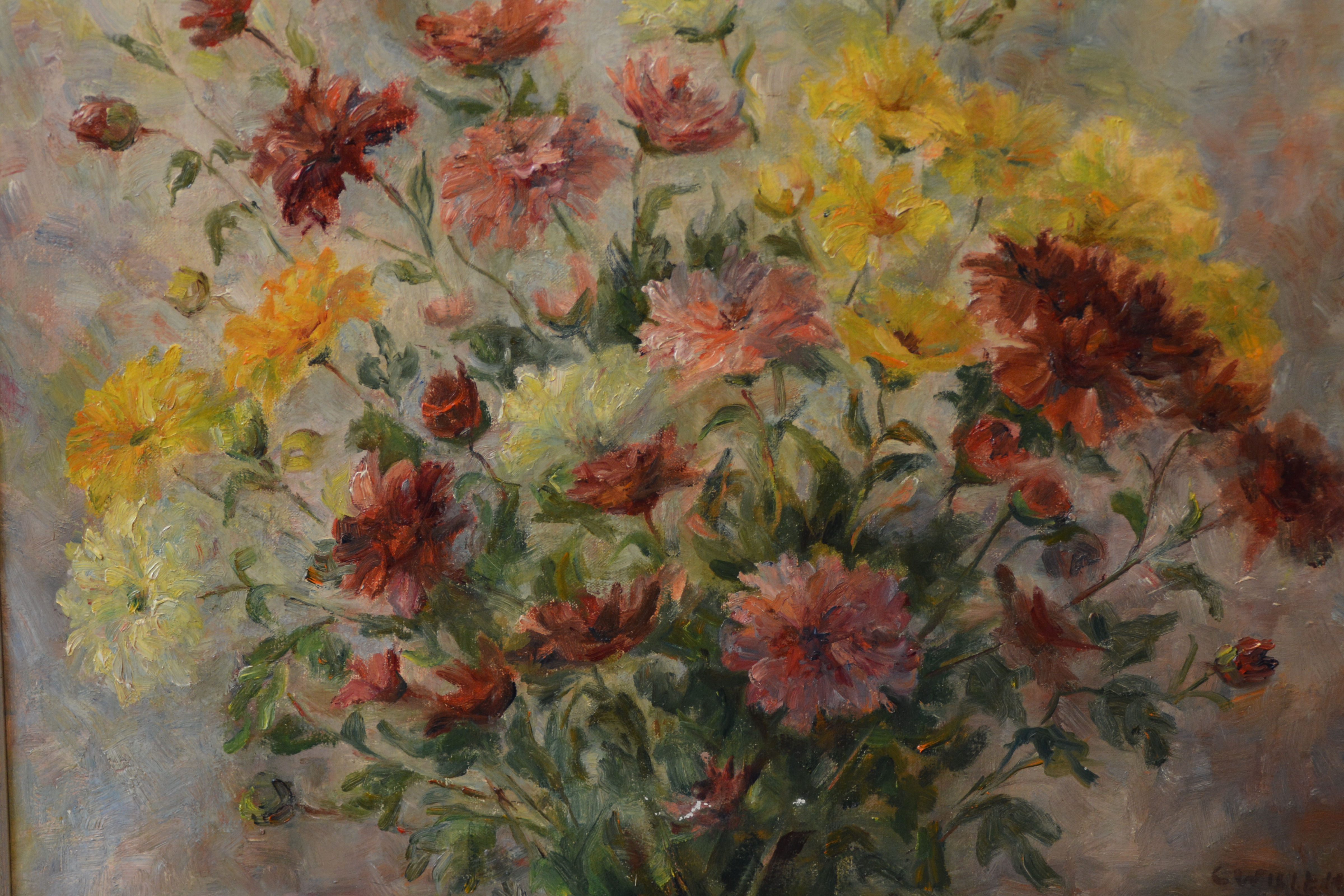 Ingelijst olieverfschilderij van Cornelia Willemsz-Rambonnet (1892-1981), kunstenaar en schilder en gehuwd met Melle Willemsz, ook kunstenaar. Ze werken veel samen. Fraai kleurig boeket bloemen. In goede staat.