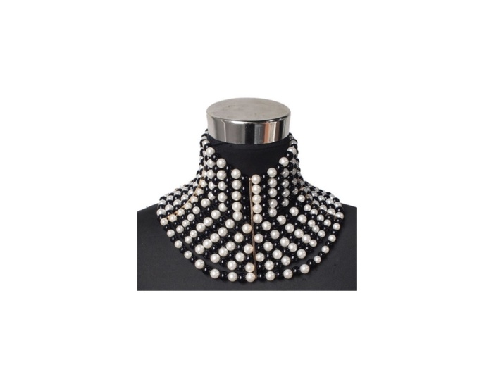 Deze waanzinnige statement ketting mag niet ontbreken in jouw collectie! De kralenketting lijkt op een parelketting en is zwart / wit van kleur. De halsketting heeft een hoge hals. Zeer elegant, maar tegelijkertijd ook erg sexy! Combineer dit collier bijvoorbeeld met één van onze sexy korsetten of draag deze halsketting met een prachtige blouse. Ook zeer geschikt als lichaamsieraad.