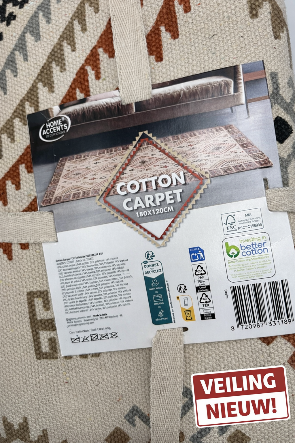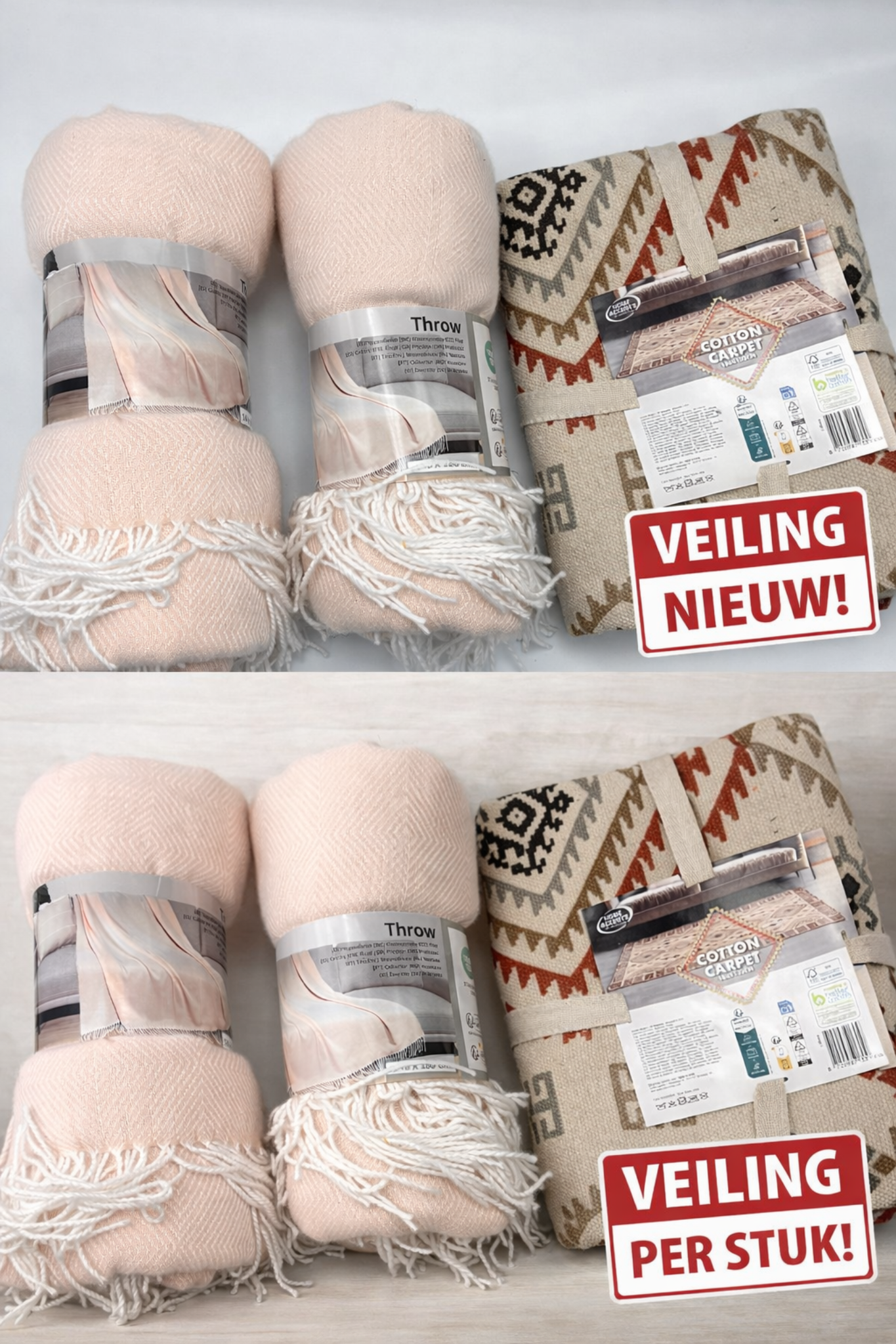 Te koop aangeboden: een mooie nieuwe partij woondecoratie bestaande uit zachte plaids en een stijlvol katoenen kleed.