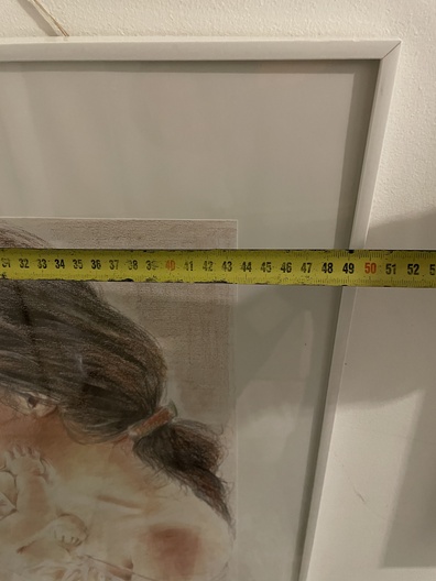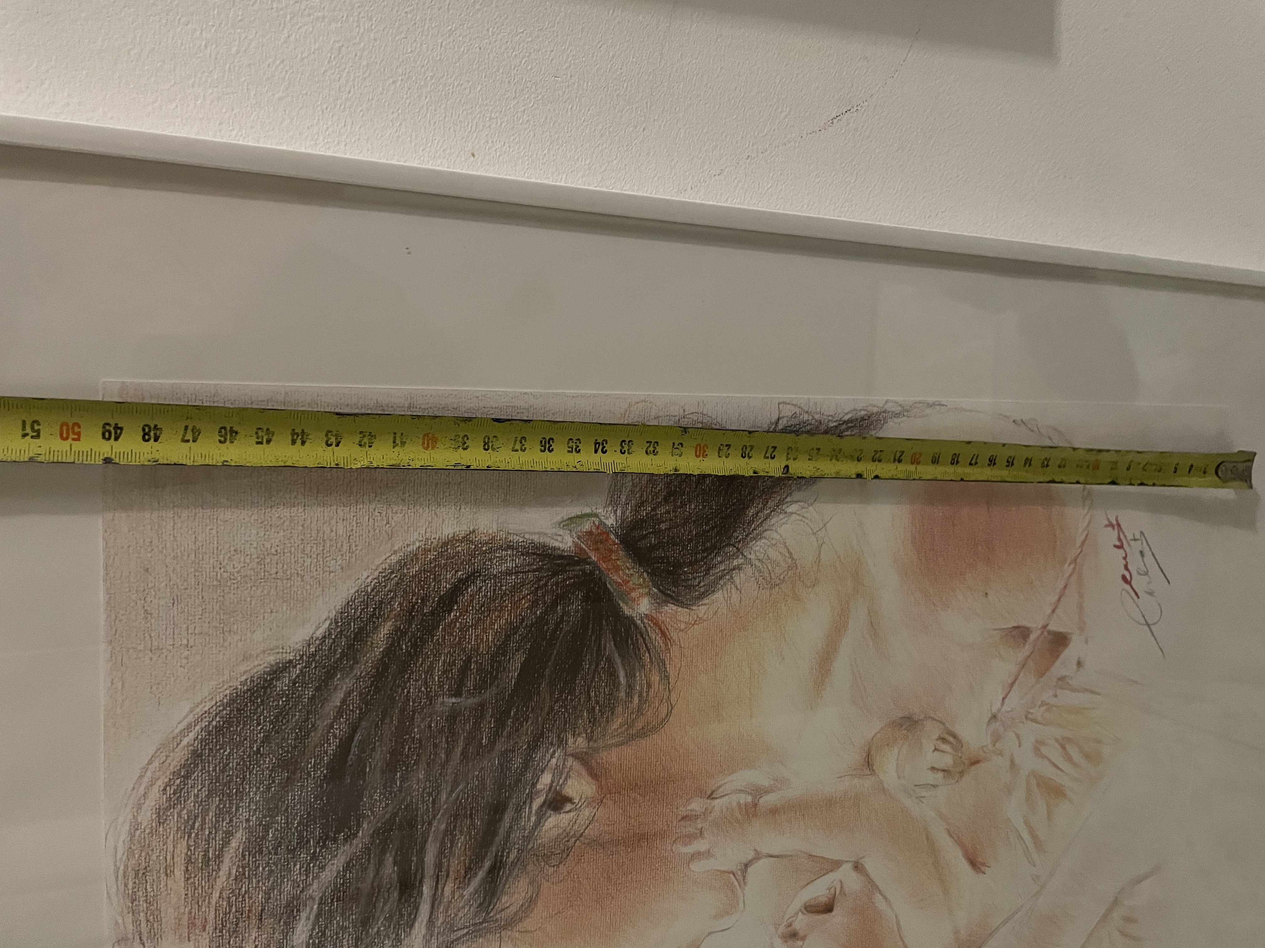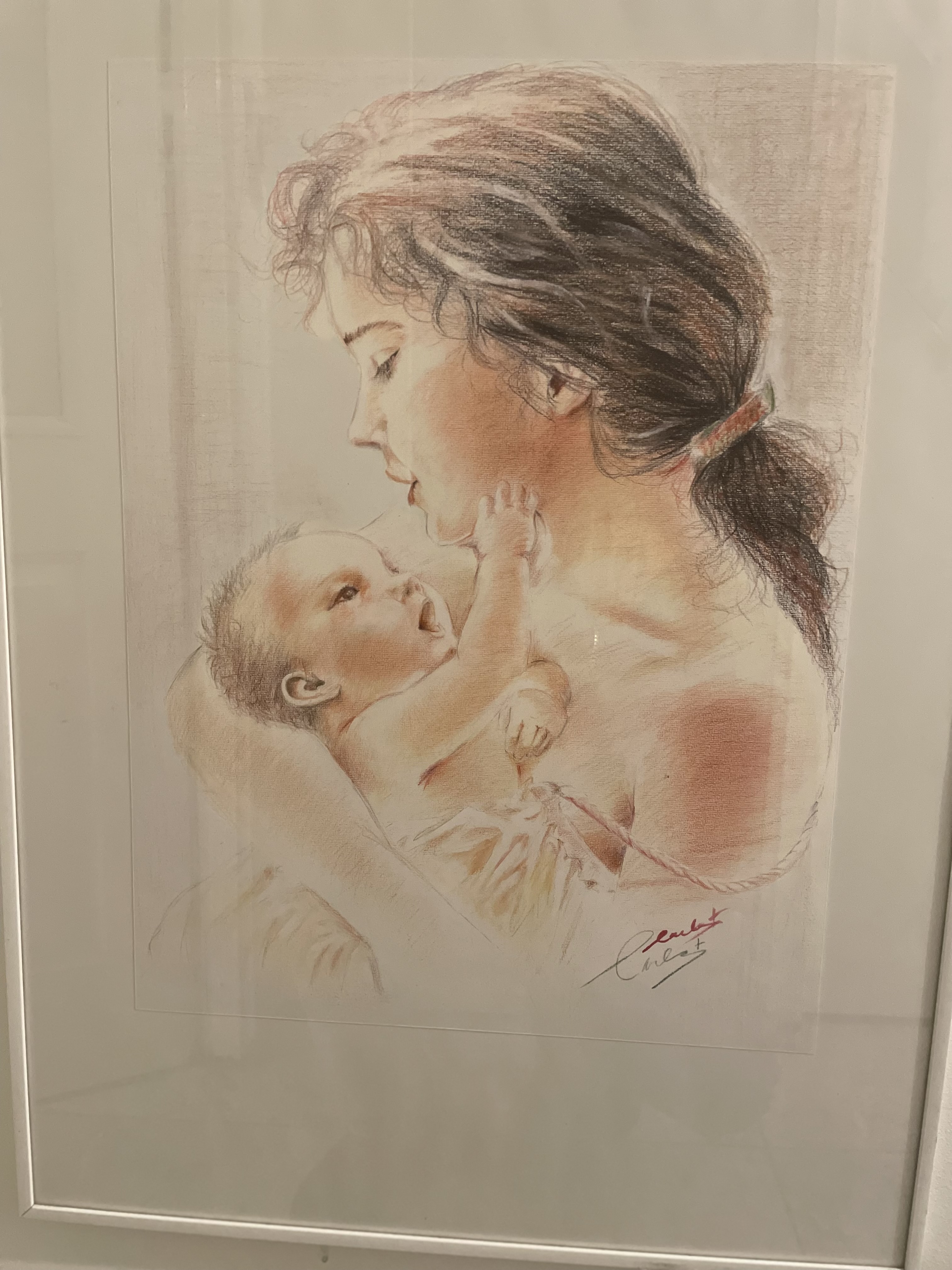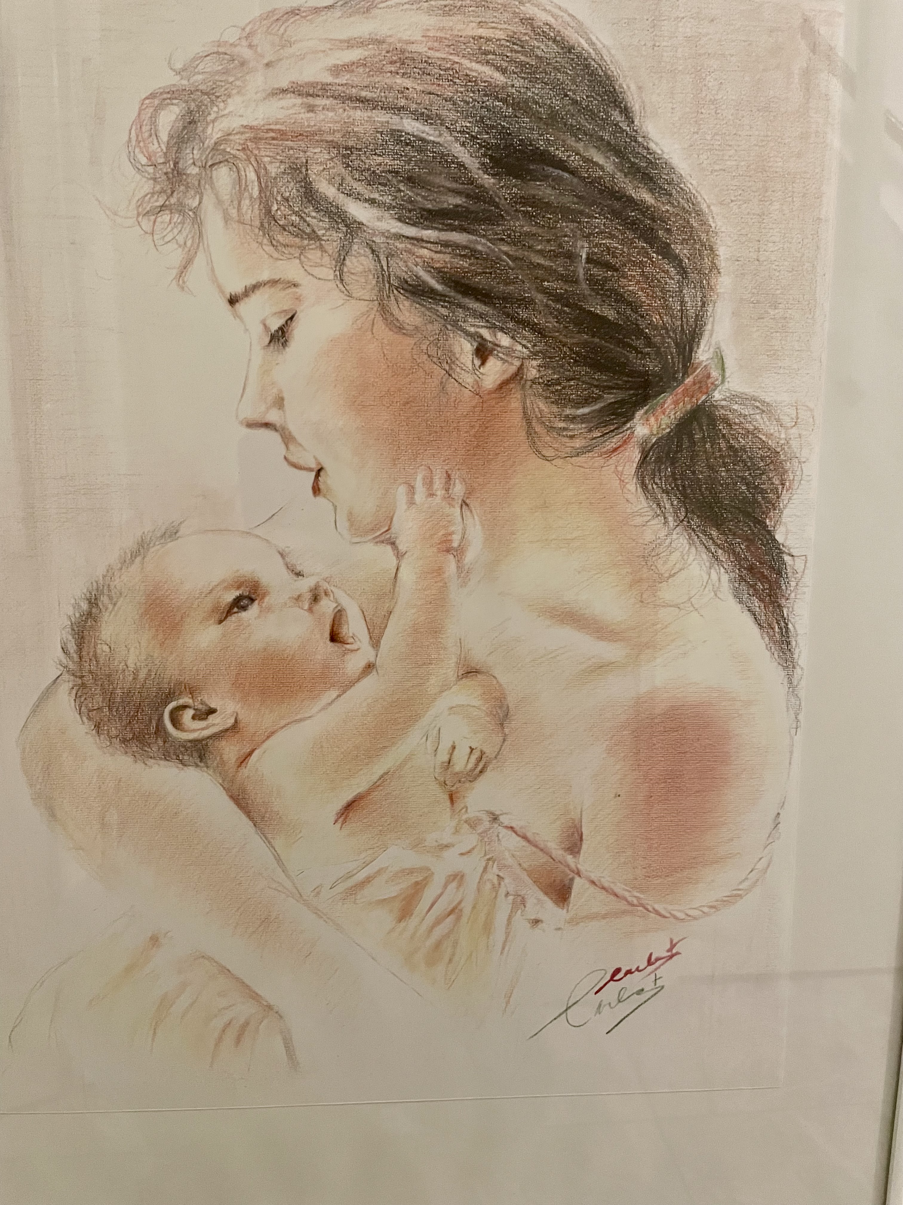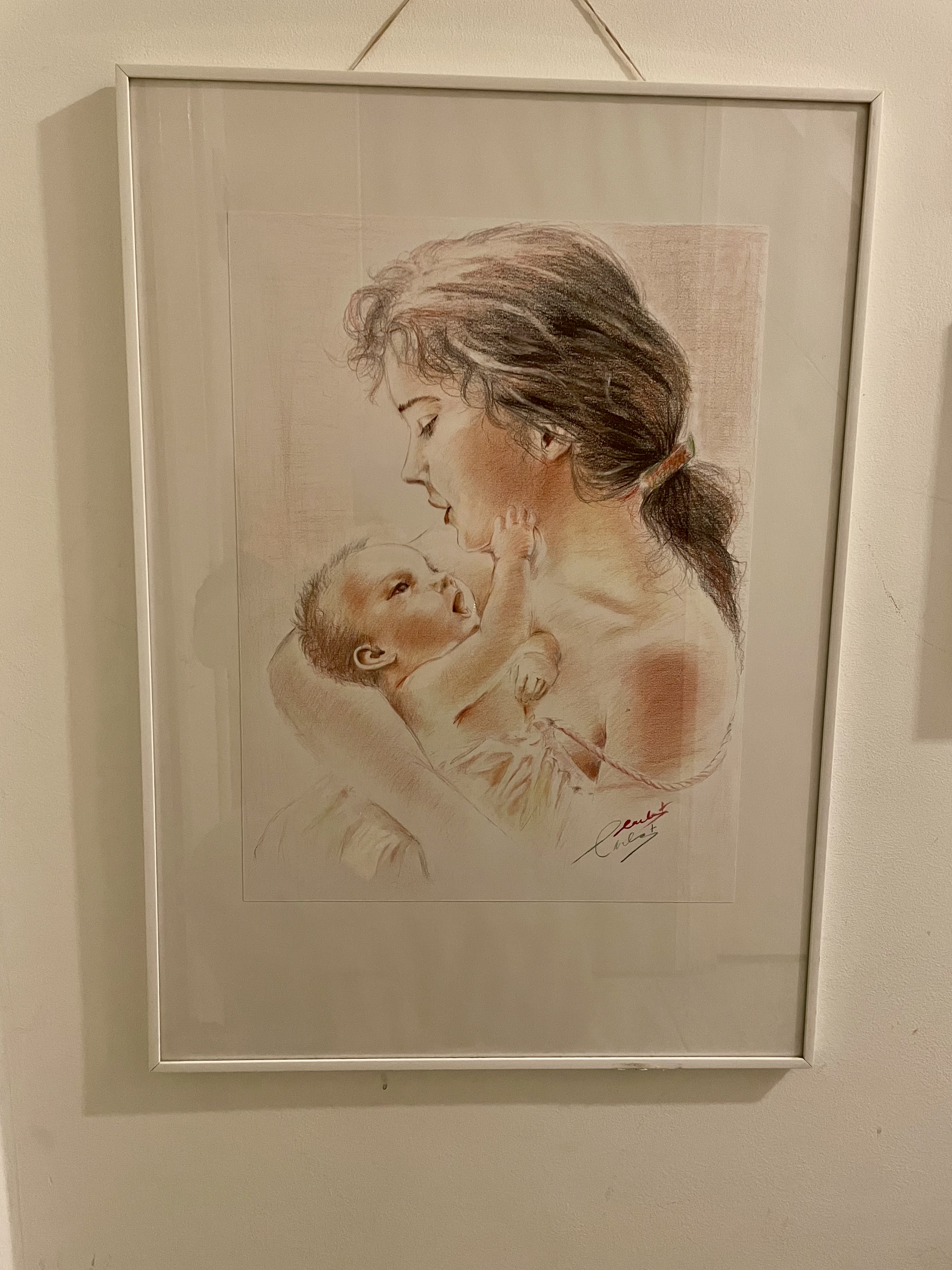 Moeder met kind, mooie schilderij met acryl potlood op canvas papier