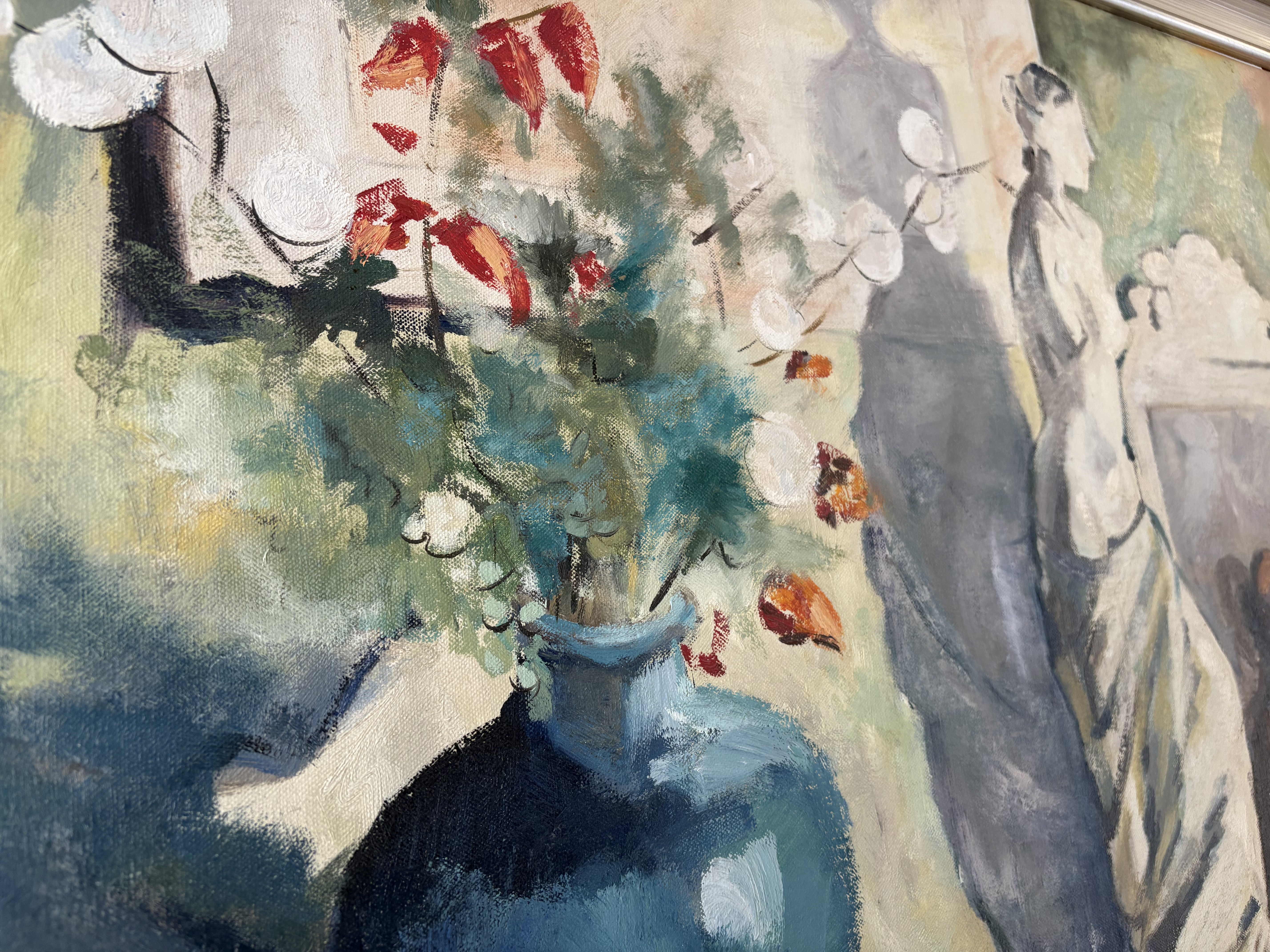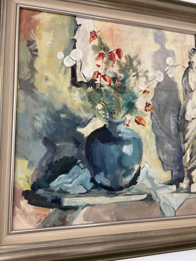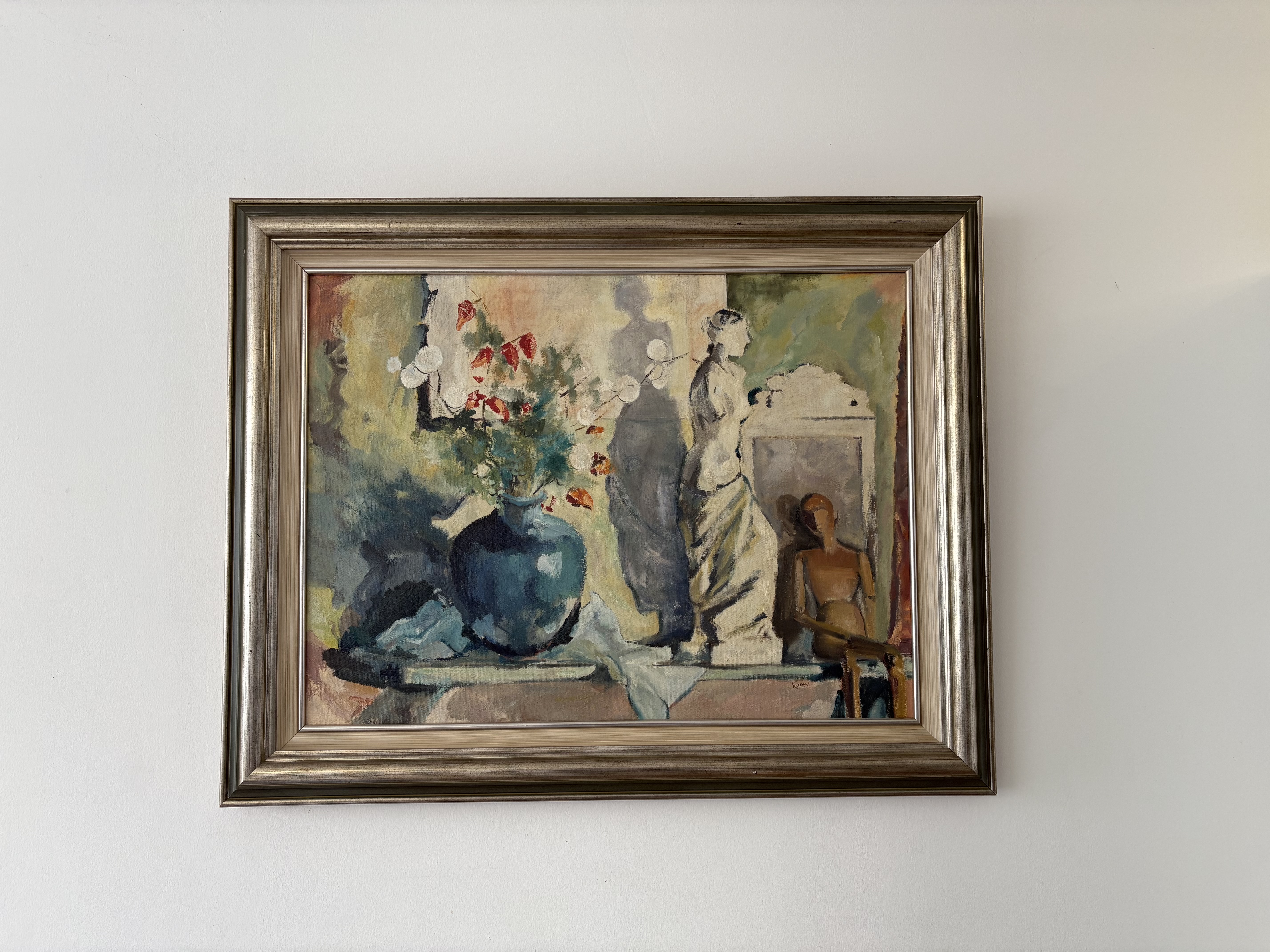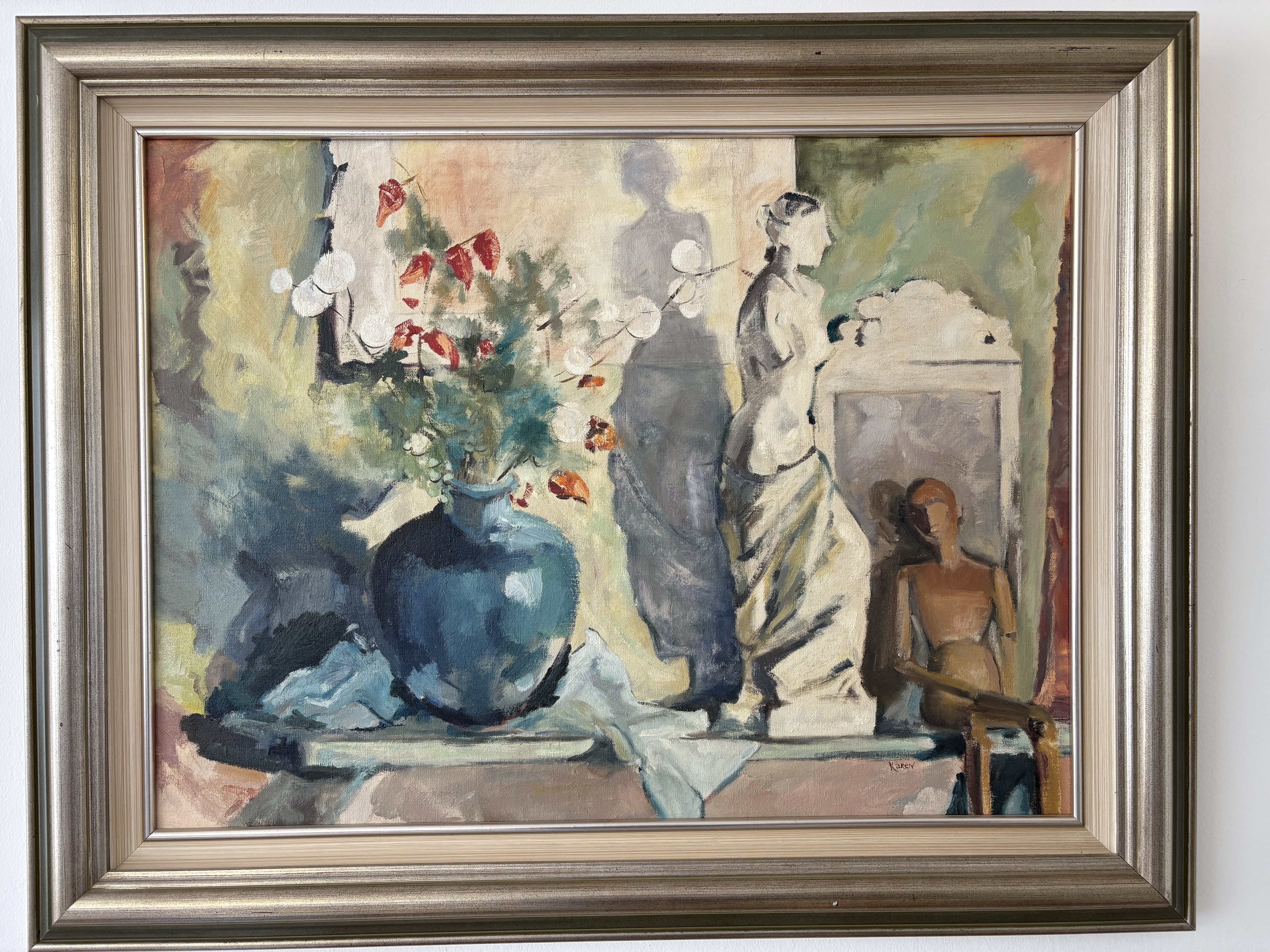 Het schilderij is een stilleven met een blauwe vaas met bloemen, een wit beeld van vrouw en een paspop.