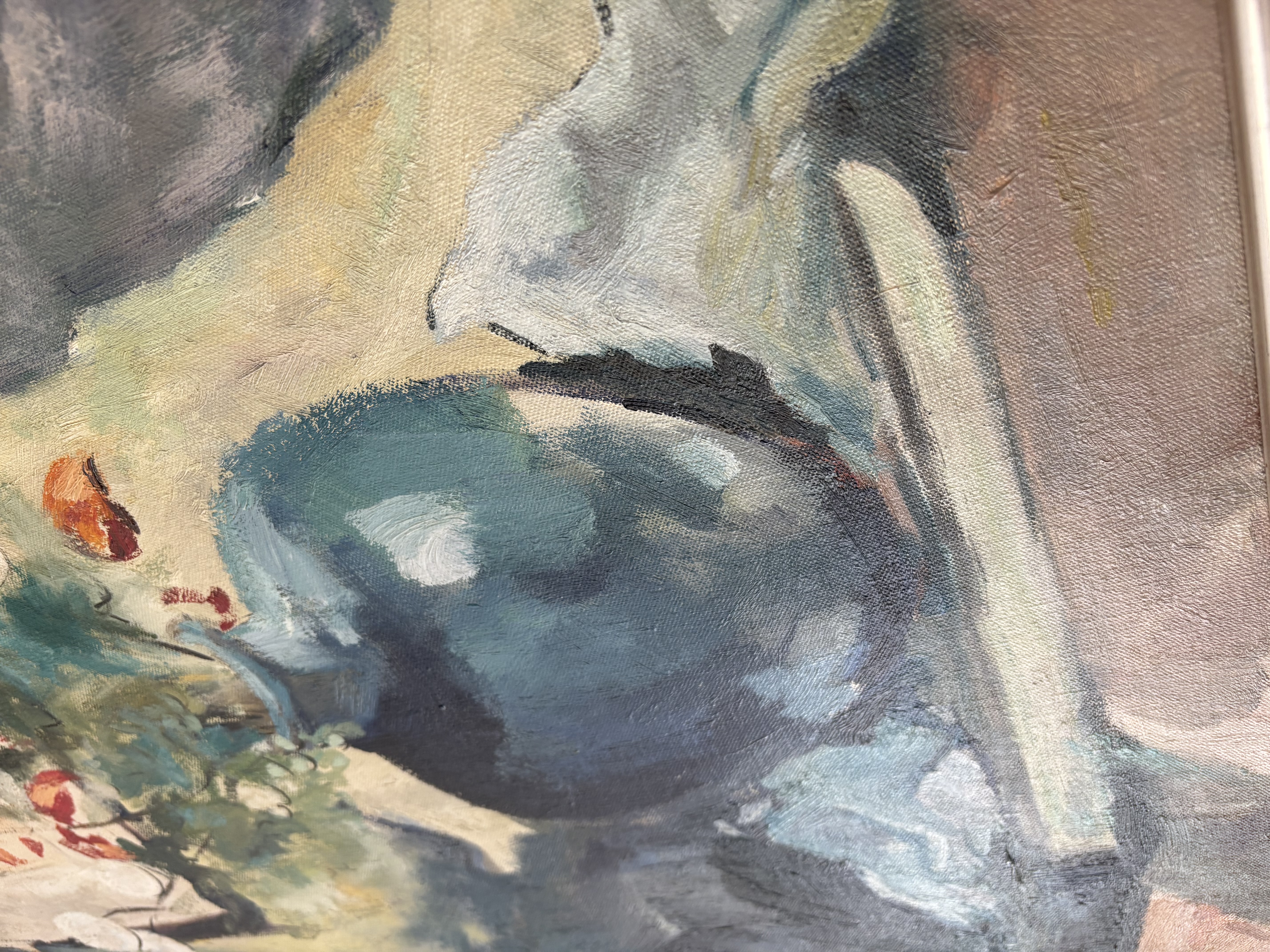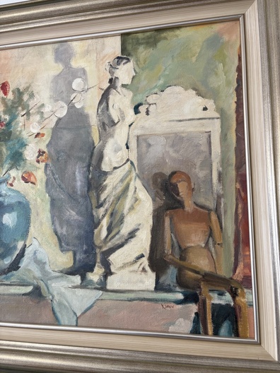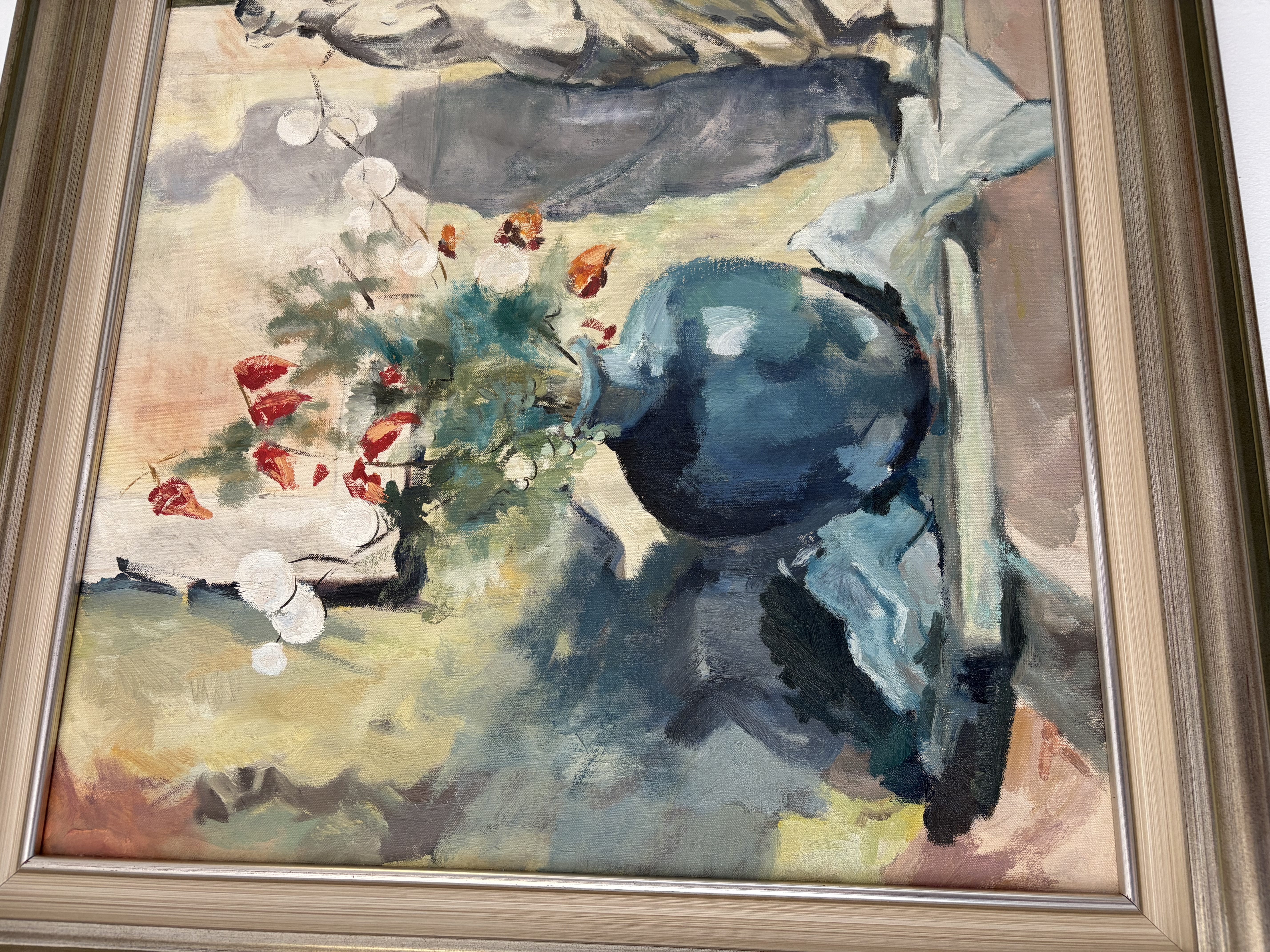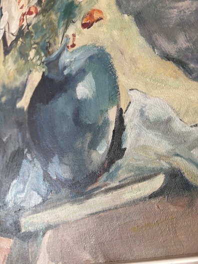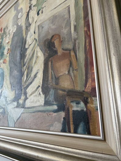 Het schilderij is een stilleven met een blauwe vaas met bloemen, een wit beeld van vrouw en een paspop.