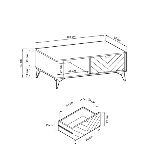 Houd je van de nieuwste trends en wil je dat je interieur daarmee in de pas loopt? Met de Renée meubelcollectie krijgt jouw ruimte een uniek karakter en een moderne uitstraling waar je zo naar verlangt! De Renée salontafel is de perfecte keuze voor mensen die graag hun middagen met koffie doorbrengen in goed gezelschap. Dankzij de optimale afmetingen kun je kopjes en je favoriete gebakjes voor al je gasten gemakkelijk neerzetten. Het product heeft een eenvoudige vormgeving met een eigentijds accent in de vorm van een sparrenpatroon op de voorkant van de laden. Het heeft ook twee ruime laden en een brede plank onder het tafelblad, die zeker al je benodigdheden kunnen herbergen en helpen om de ruimte georganiseerd te houden. Door het meubel op slanke metalen poten te plaatsen, krijgt het geheel een lichte en stijlvolle uitstraling.