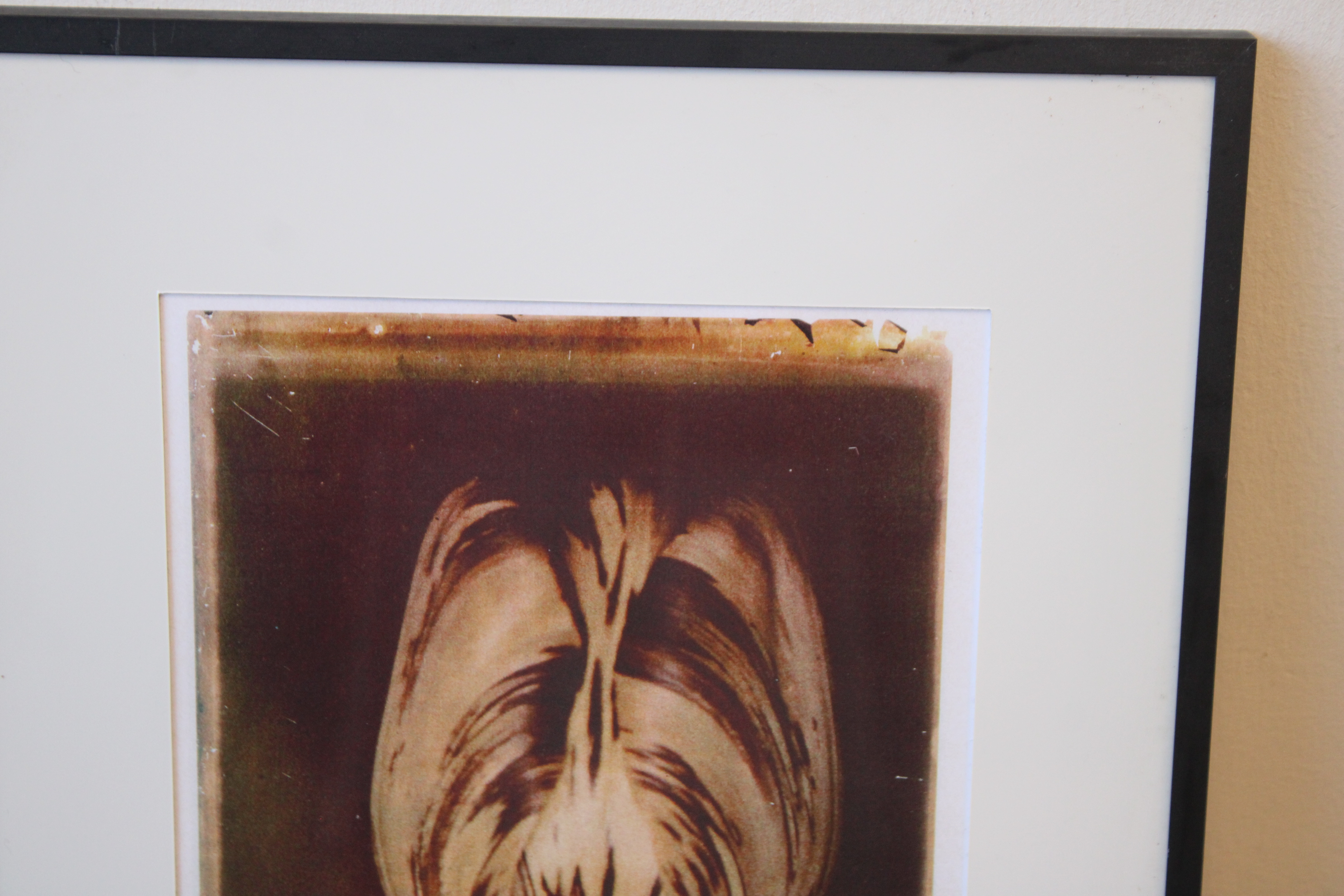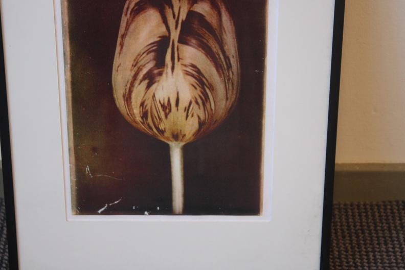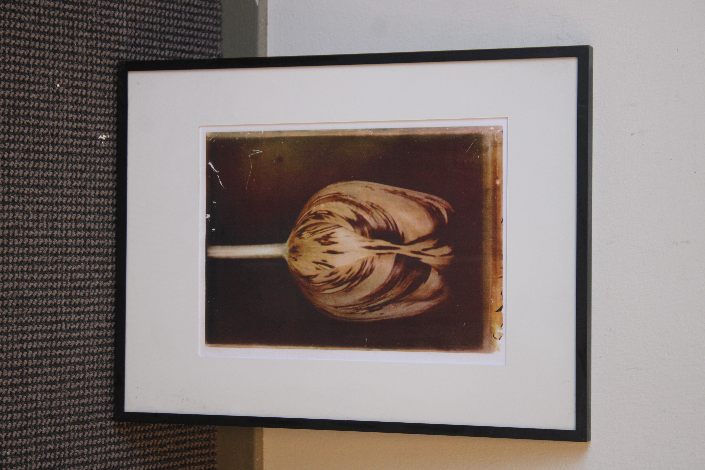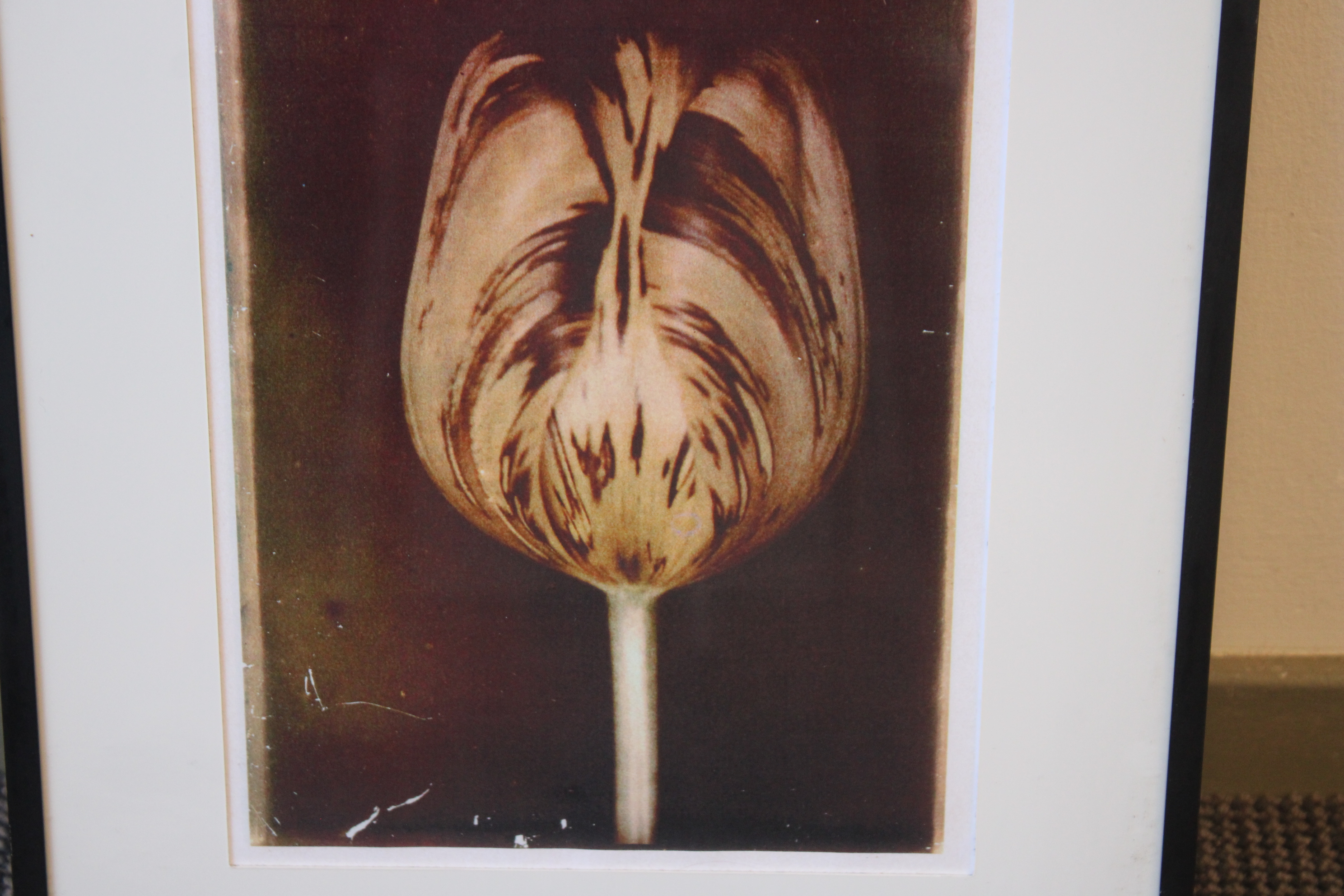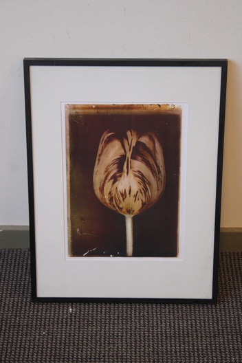 Ingelijste artprint van een tulp in sepia.'