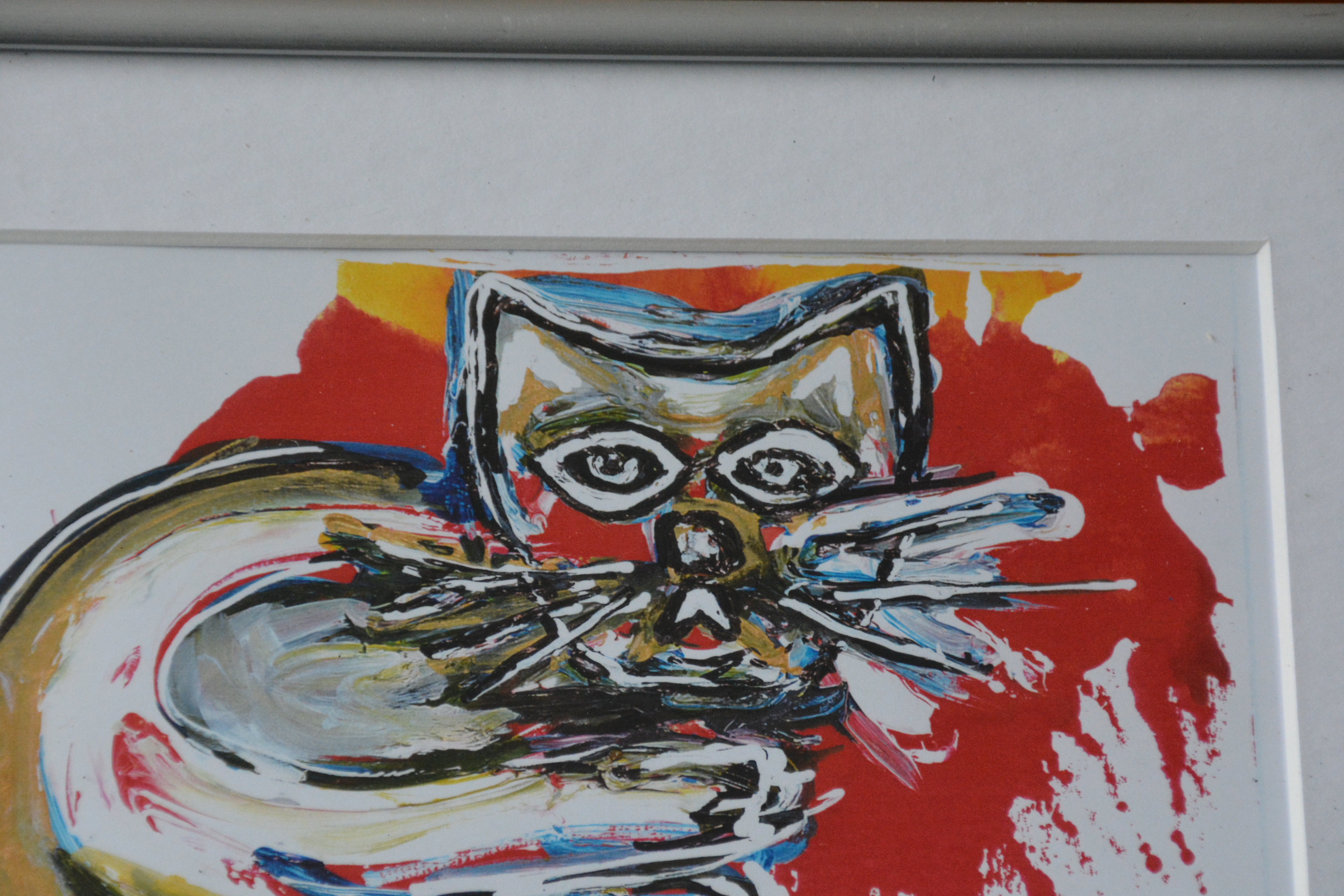 Ingelijst schilderij van K. vd Gaast: 'Zittende kat'.