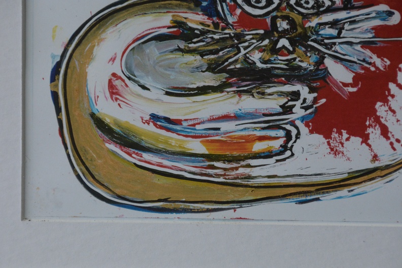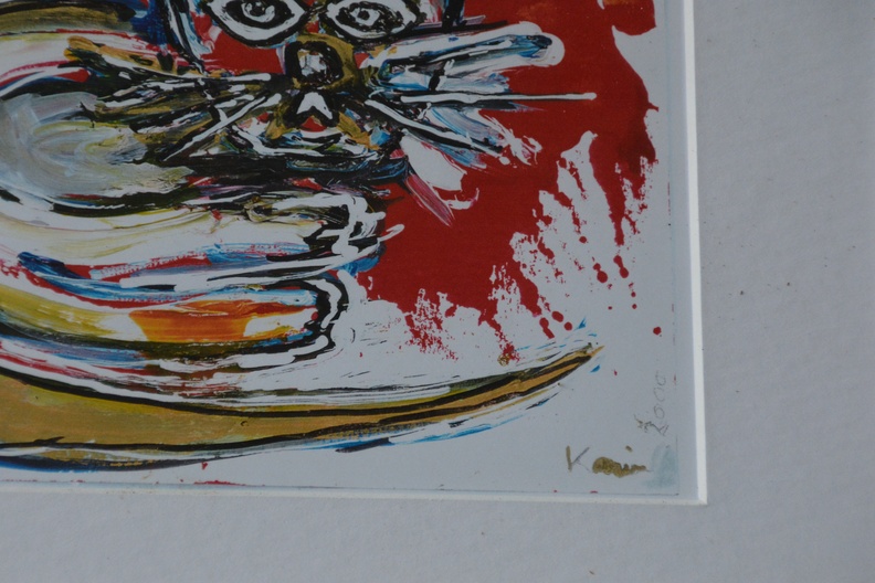 Acryl op papier, ingelijst. Gesigneerd met ‘Karin’, dat is de kunstenares Karin van der Gaast (1958), uit 2000. In goede staat.