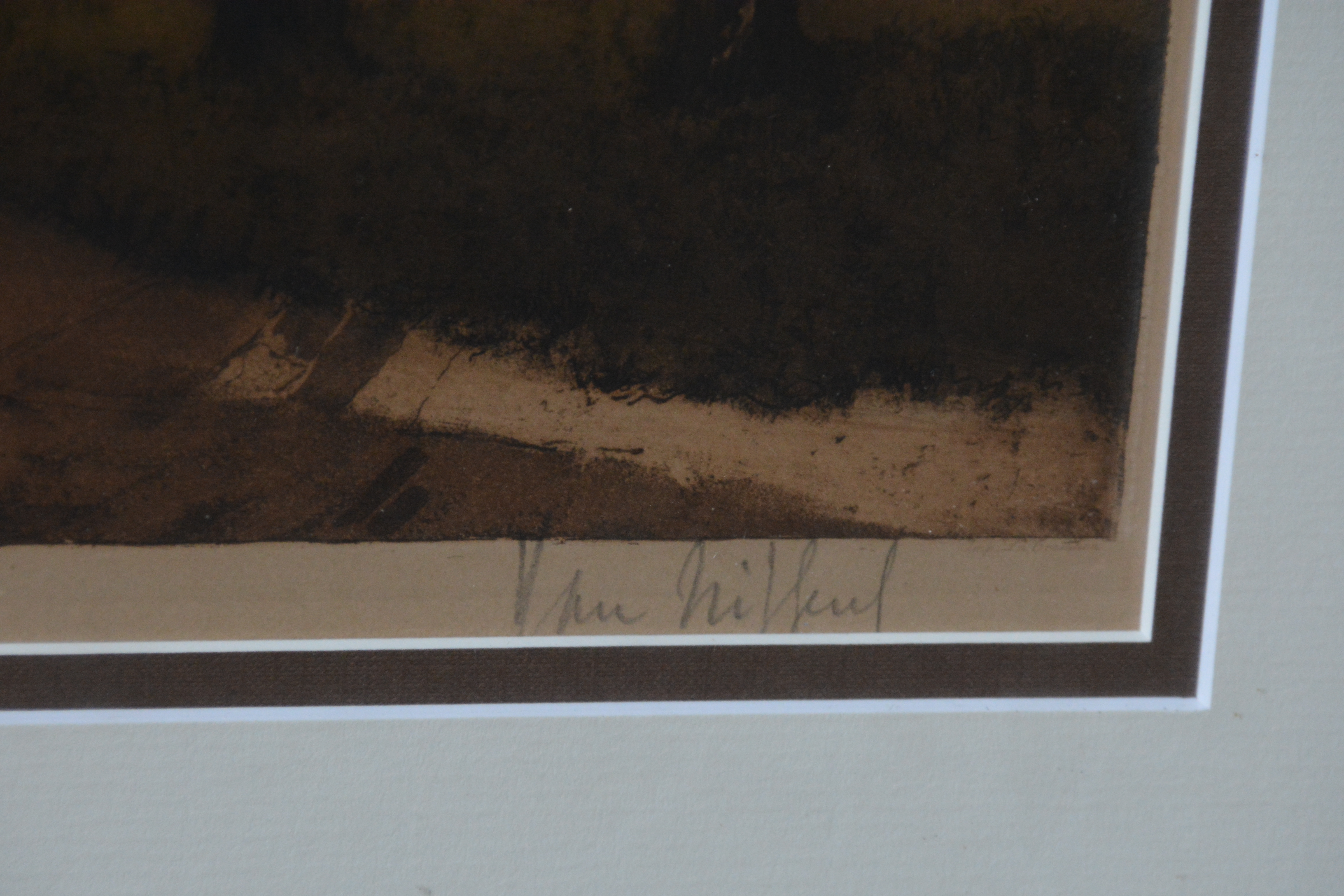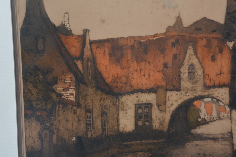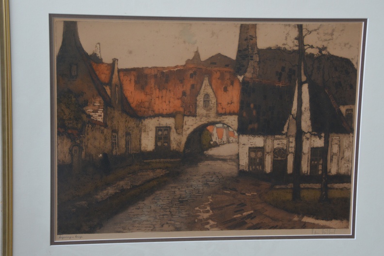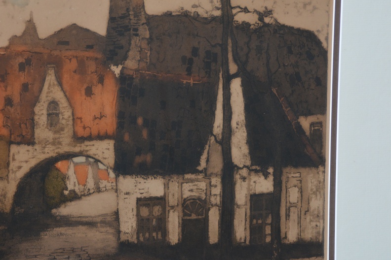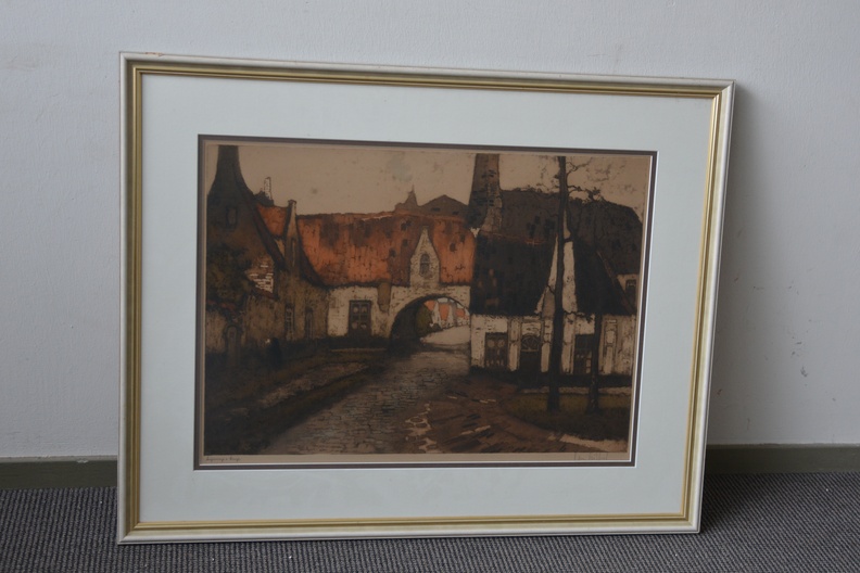 Bekende prent van Alfred van Neste (1884-1969), Het Bageinhof in Brugge, België. Lijkt gesigneerd met een andere naam. Ingelijst en in goede staat.