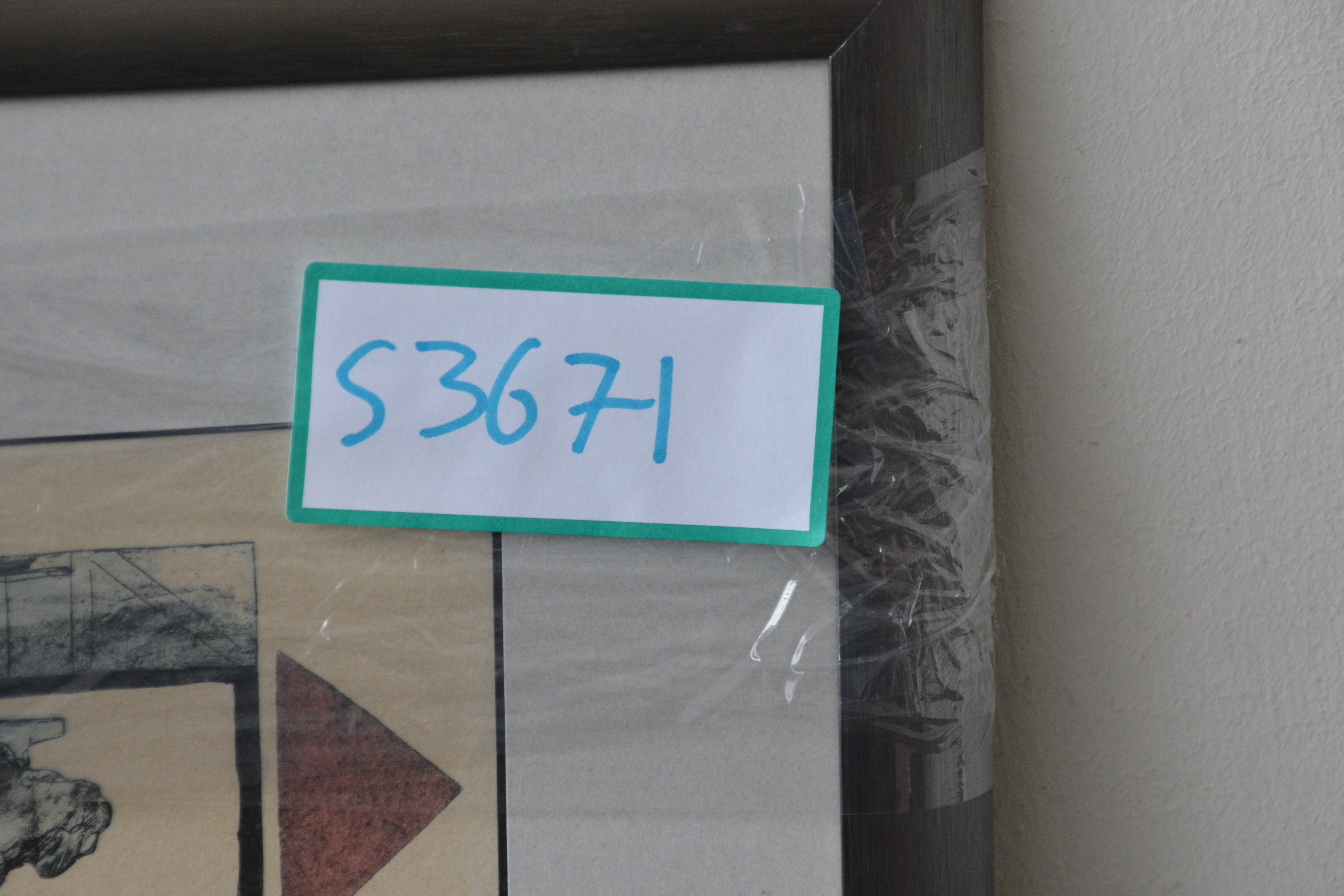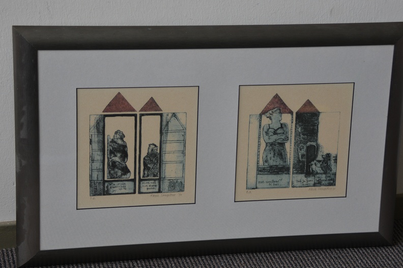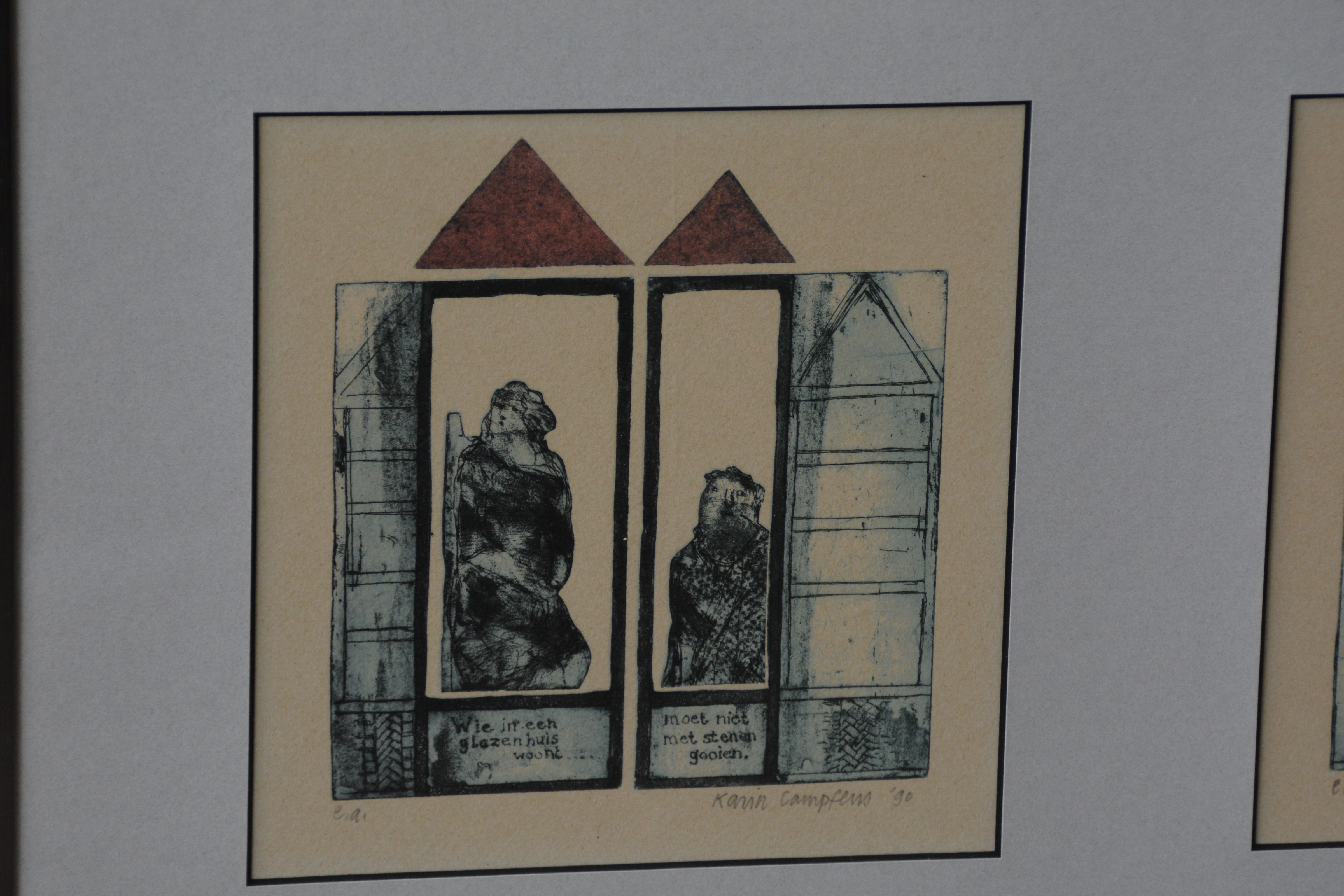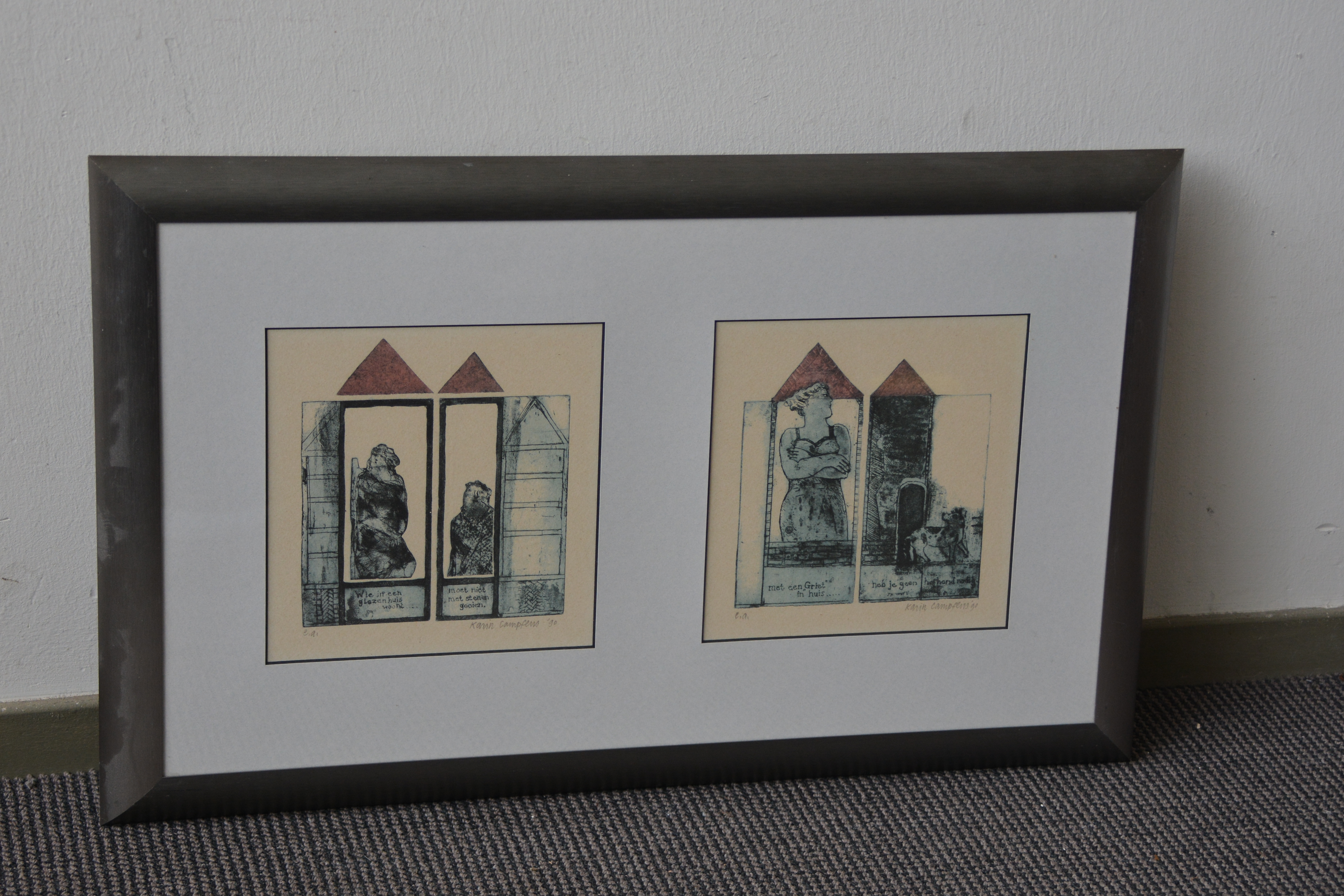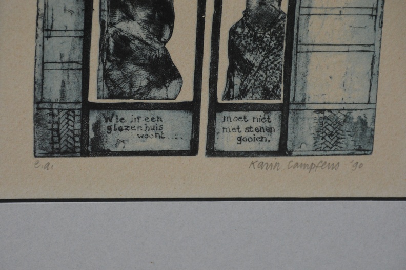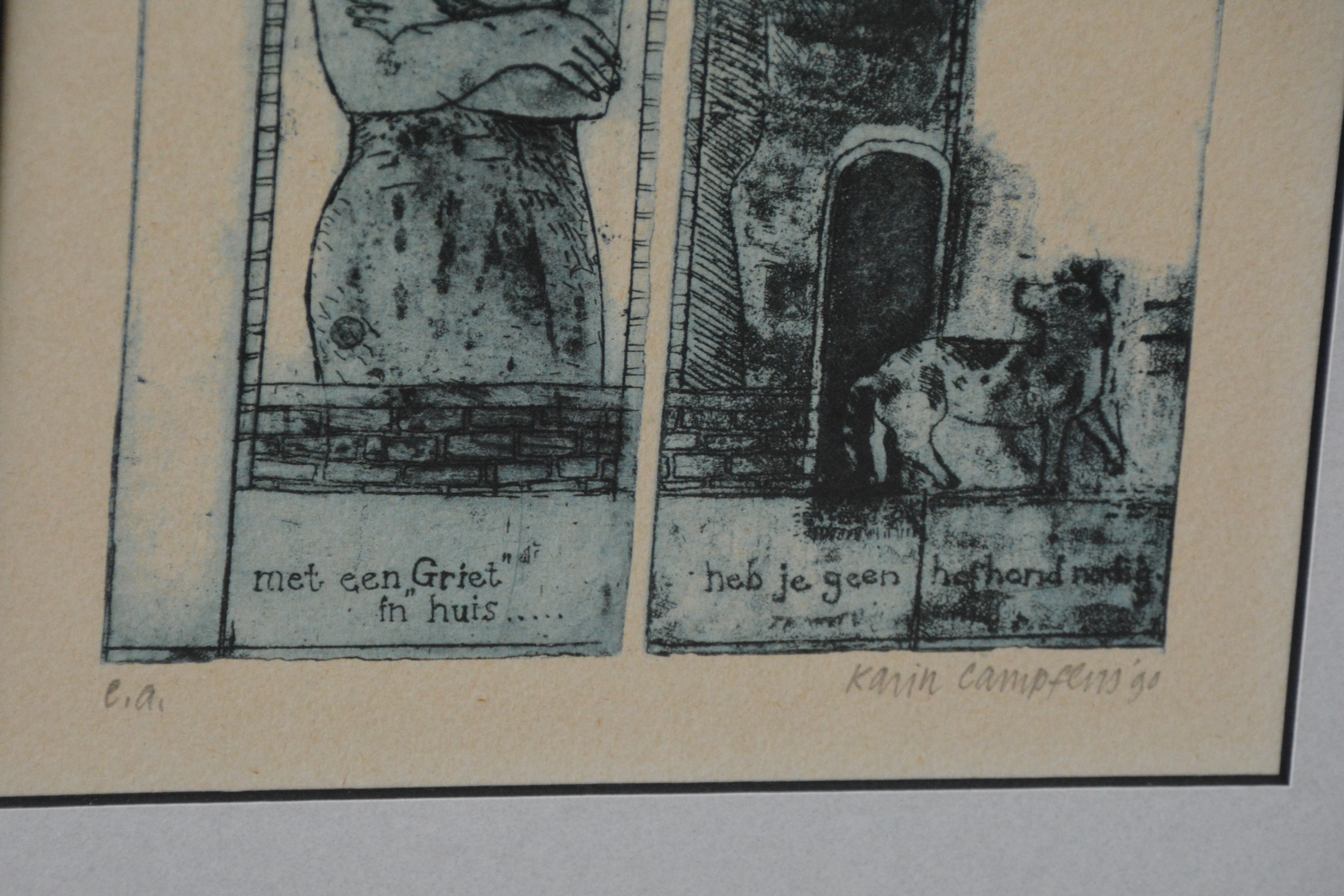 Ingelijste ets met het gezegde: ‘Wie in een glazen huis woont, moet niet met stenen gooien. en 'Met een ‘Griet’ in huis, heb je geen hond nodig'. Gesigneerd en in goede staat.