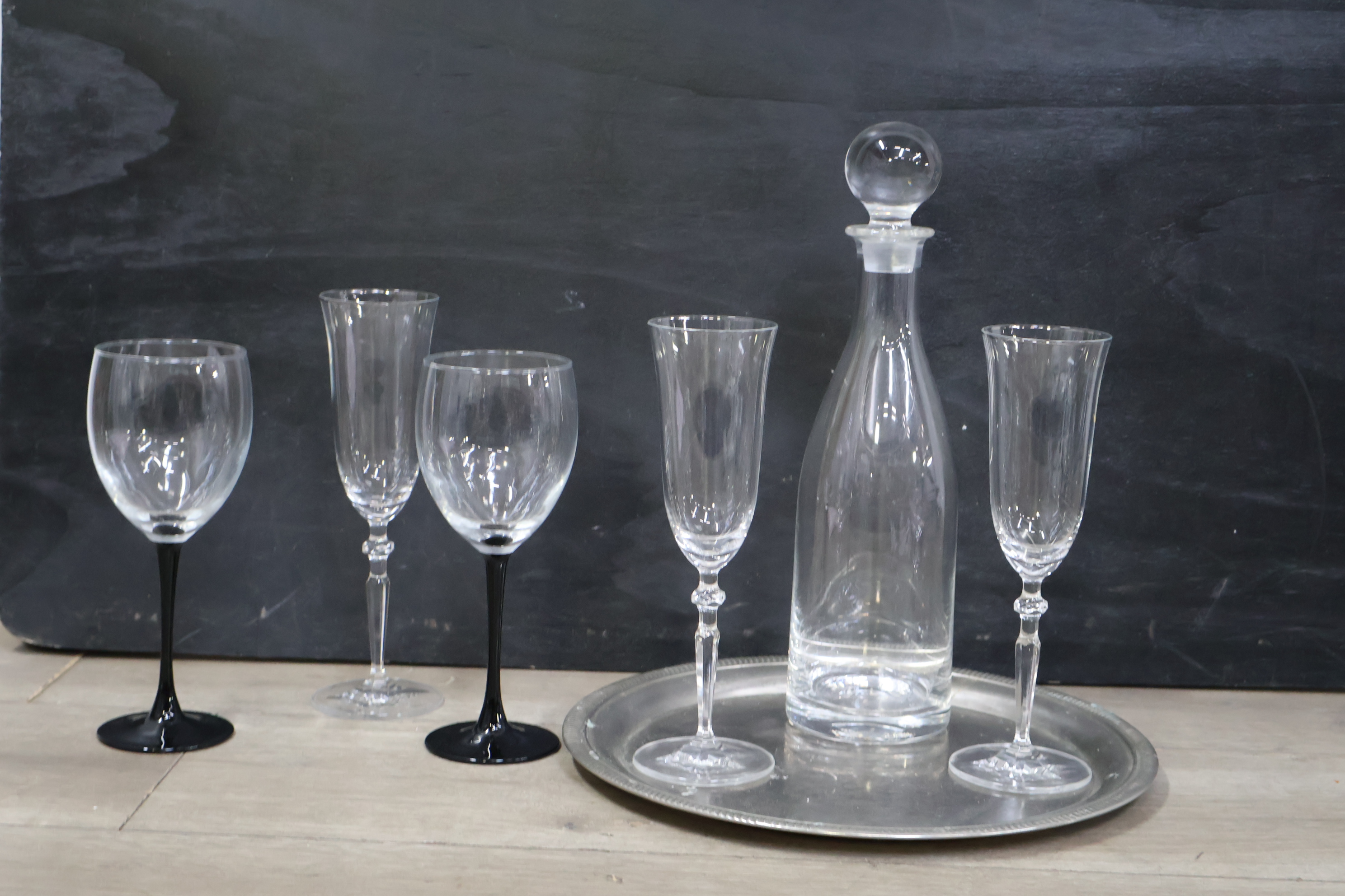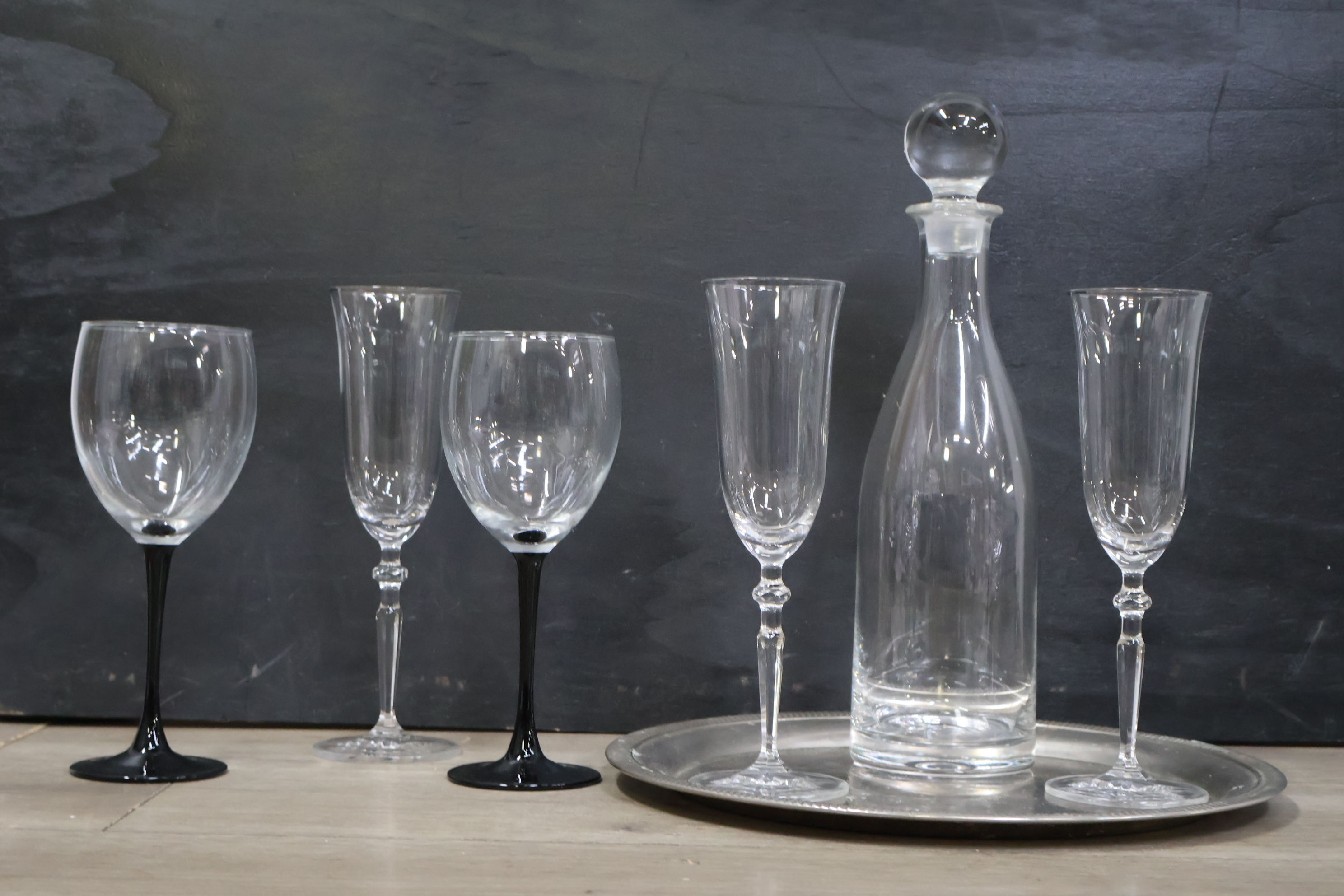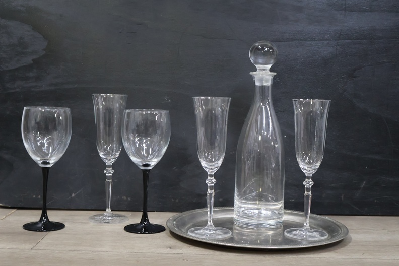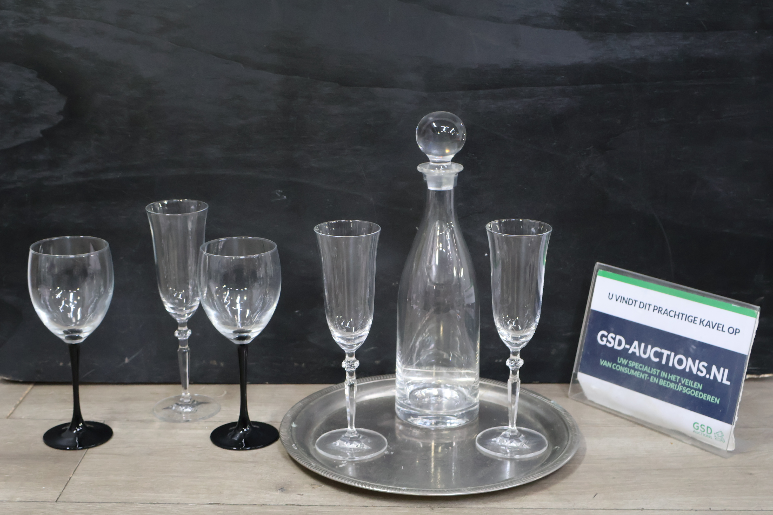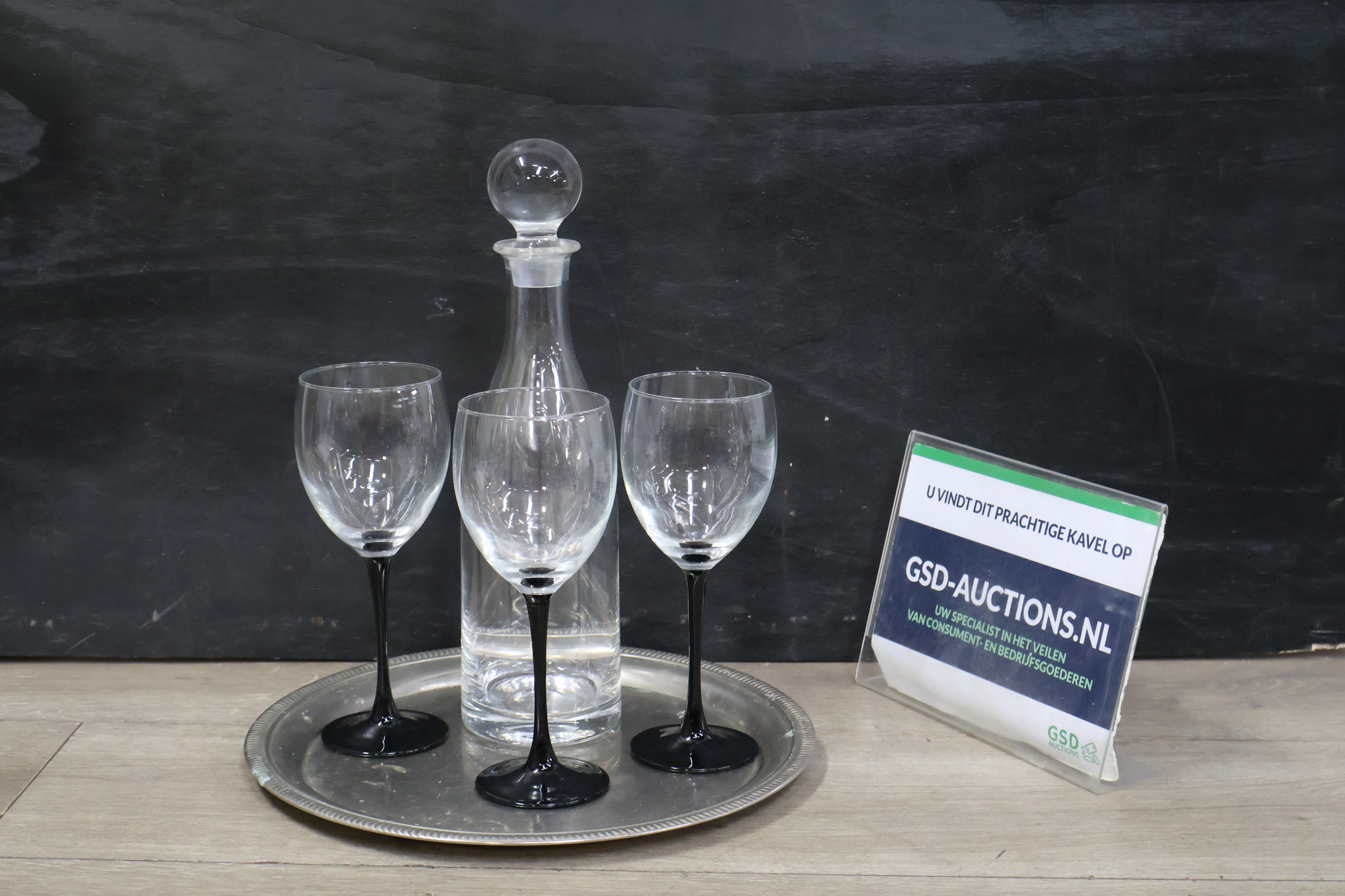 Glazen karaf met 5 wijnglazen op een dienblad'