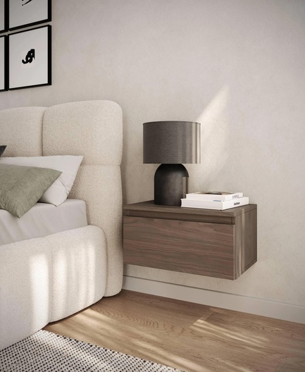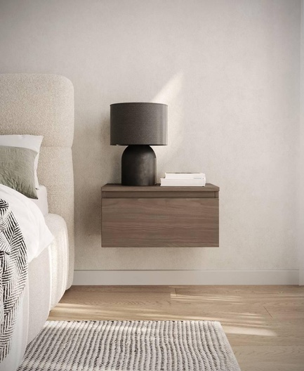 Bent u op zoek naar meubels die een eenvoudige vorm hebben en perfect in de meeste arrangementen passen? Dan zal de Bemmi collectie je zeker interesseren! Het Bemmi nachtkastje heeft een universele vorm die dankzij de ophangfunctie heel licht oogt. De prachtige, diepe kleur met houtimitatie zal niet alleen prachtig staan ​​in een minimalistisch, maar ook in een modern interieur, met een vleugje glamour. Het interieur bevat een ruime plank, die een perfecte plek is voor een brillenkoker, een telefoonoplader, zakdoekjes of kruiswoordpuzzels. Als uw bedtijdritueel het lezen van een boek is, kan op het tafelblad ook gemakkelijk een design nachtlampje worden geplaatst. Het voordeel van de meubelen is de ophangfunctie waardoor schoonmaken onder het meubel eenvoudig mogelijk is, ook voor schoonmaakrobots.
