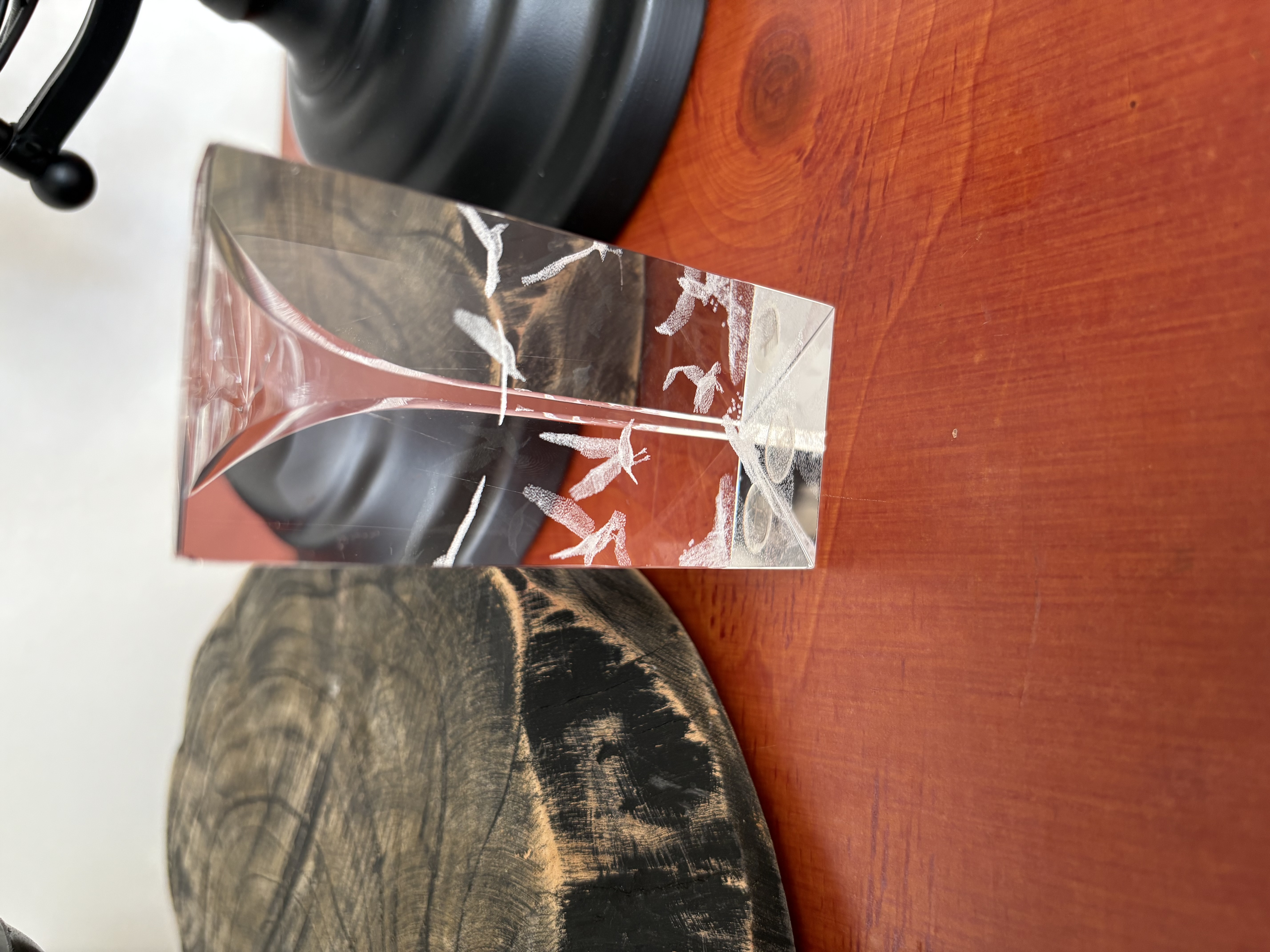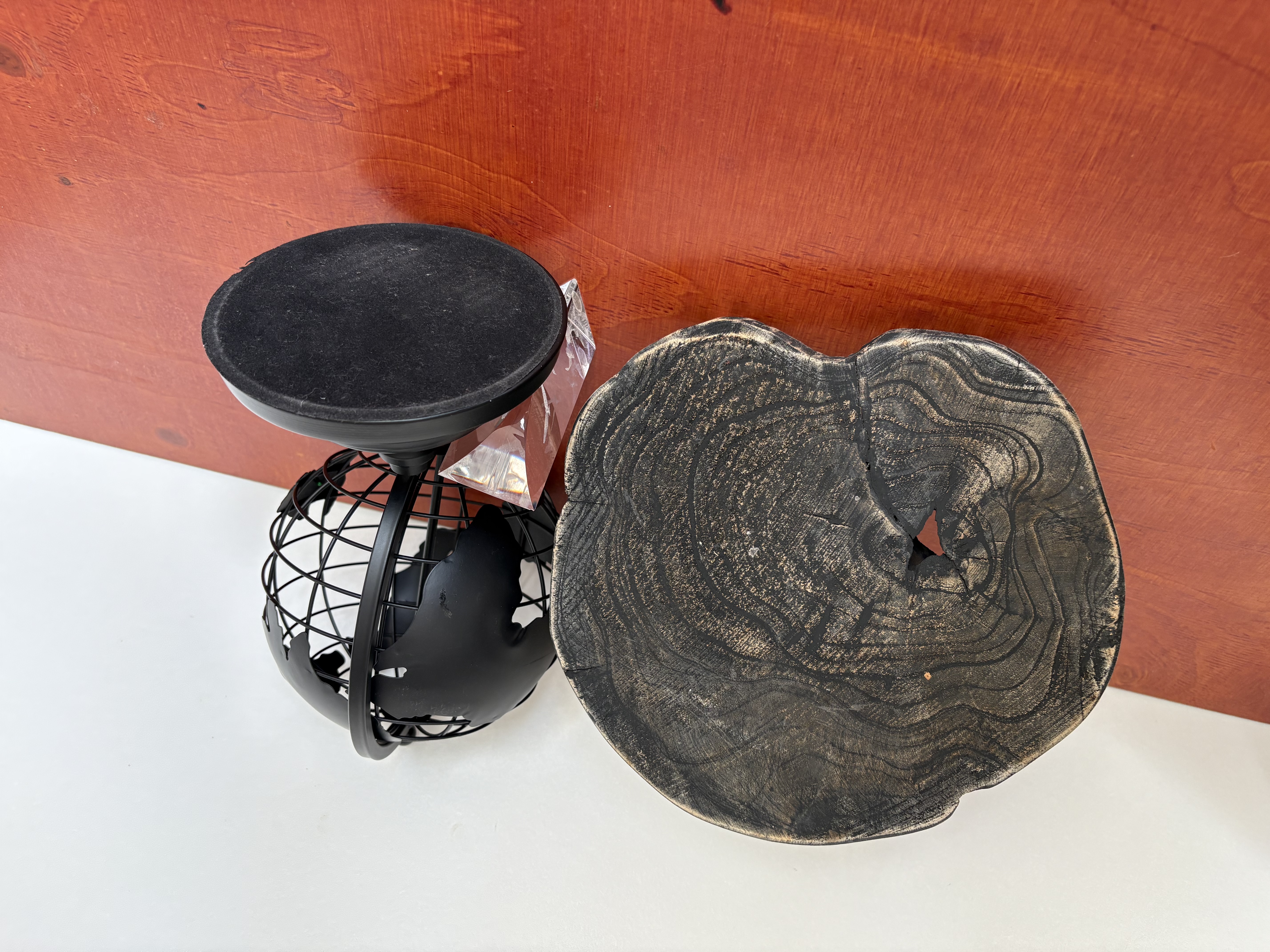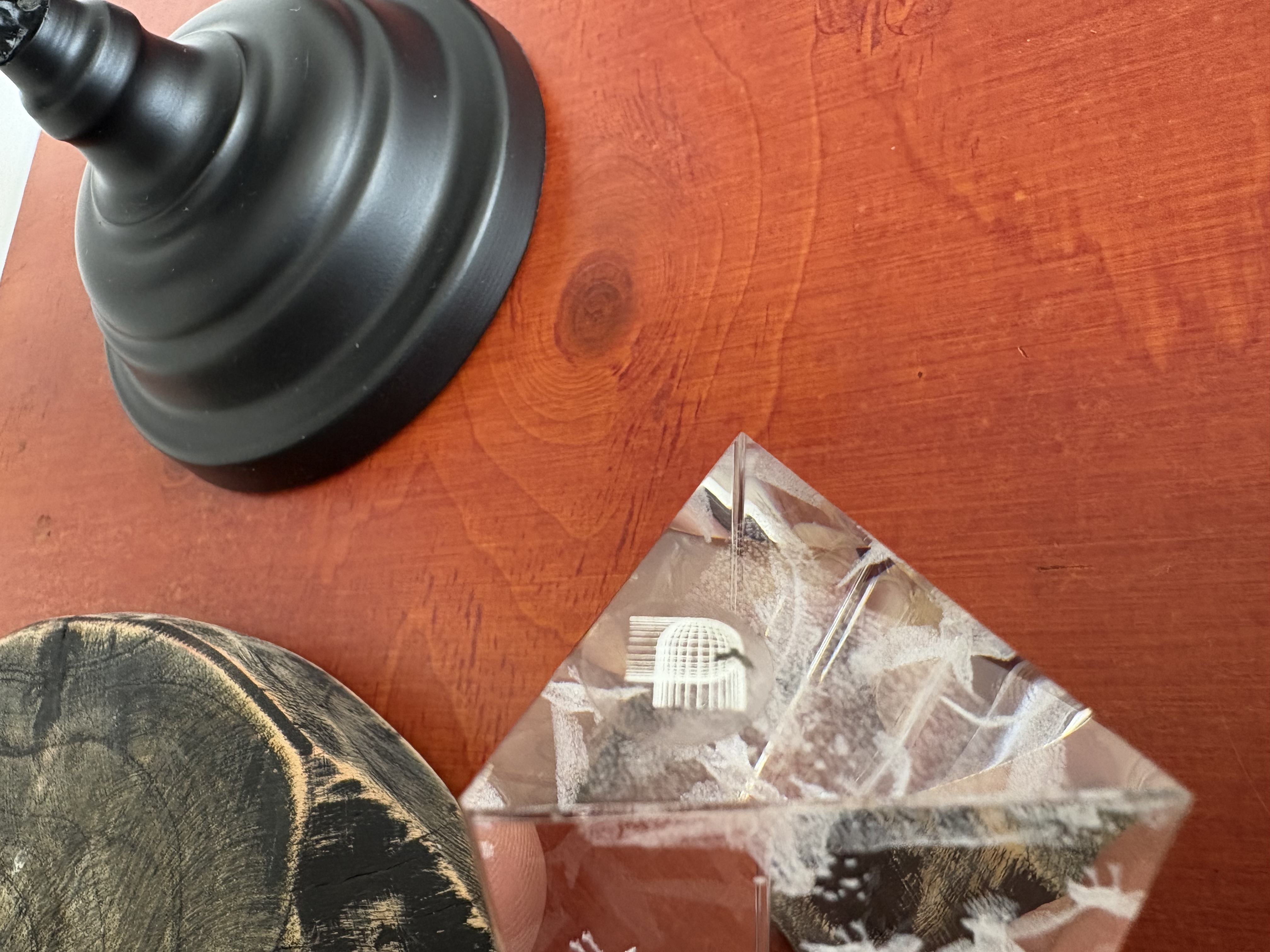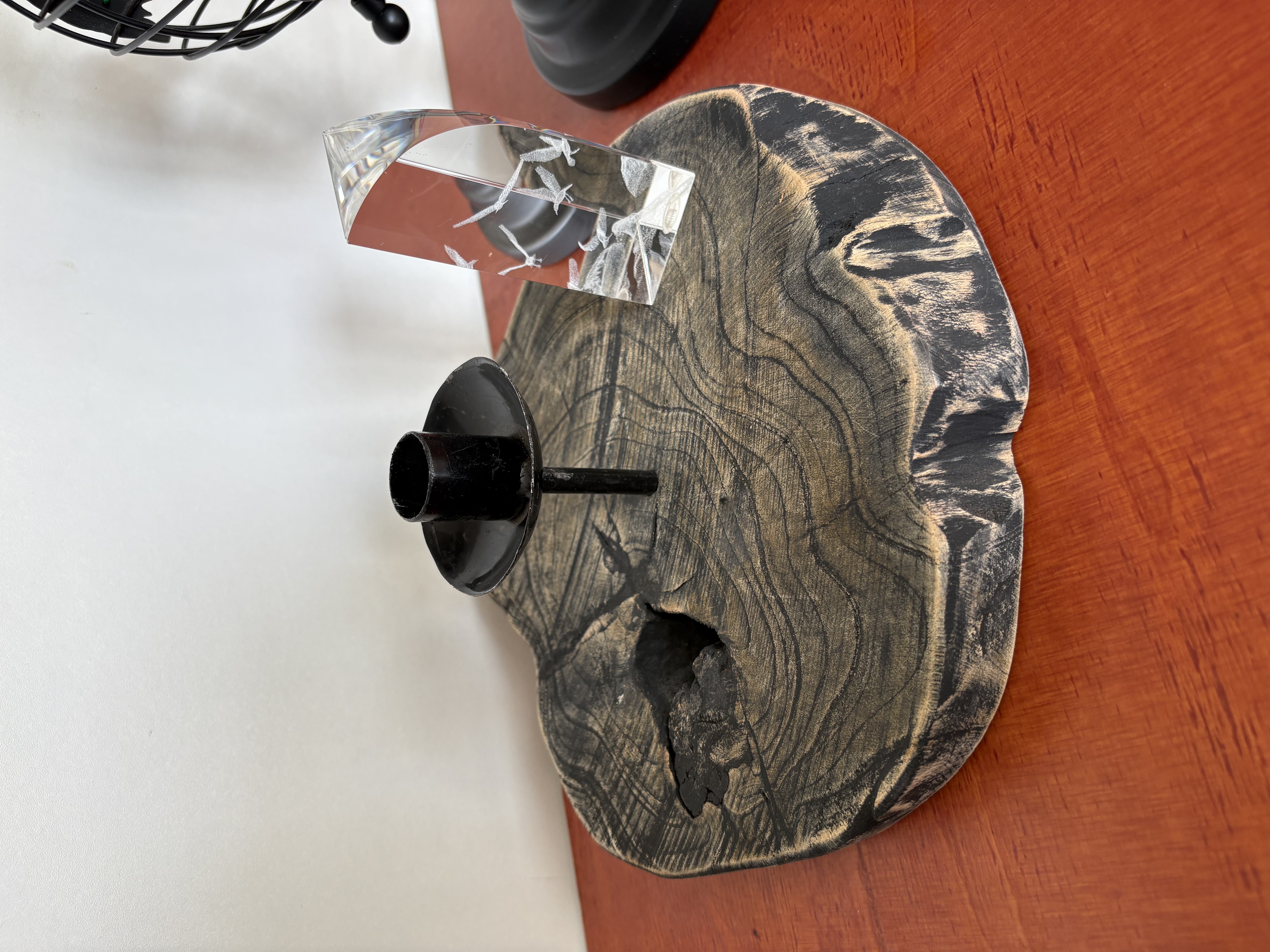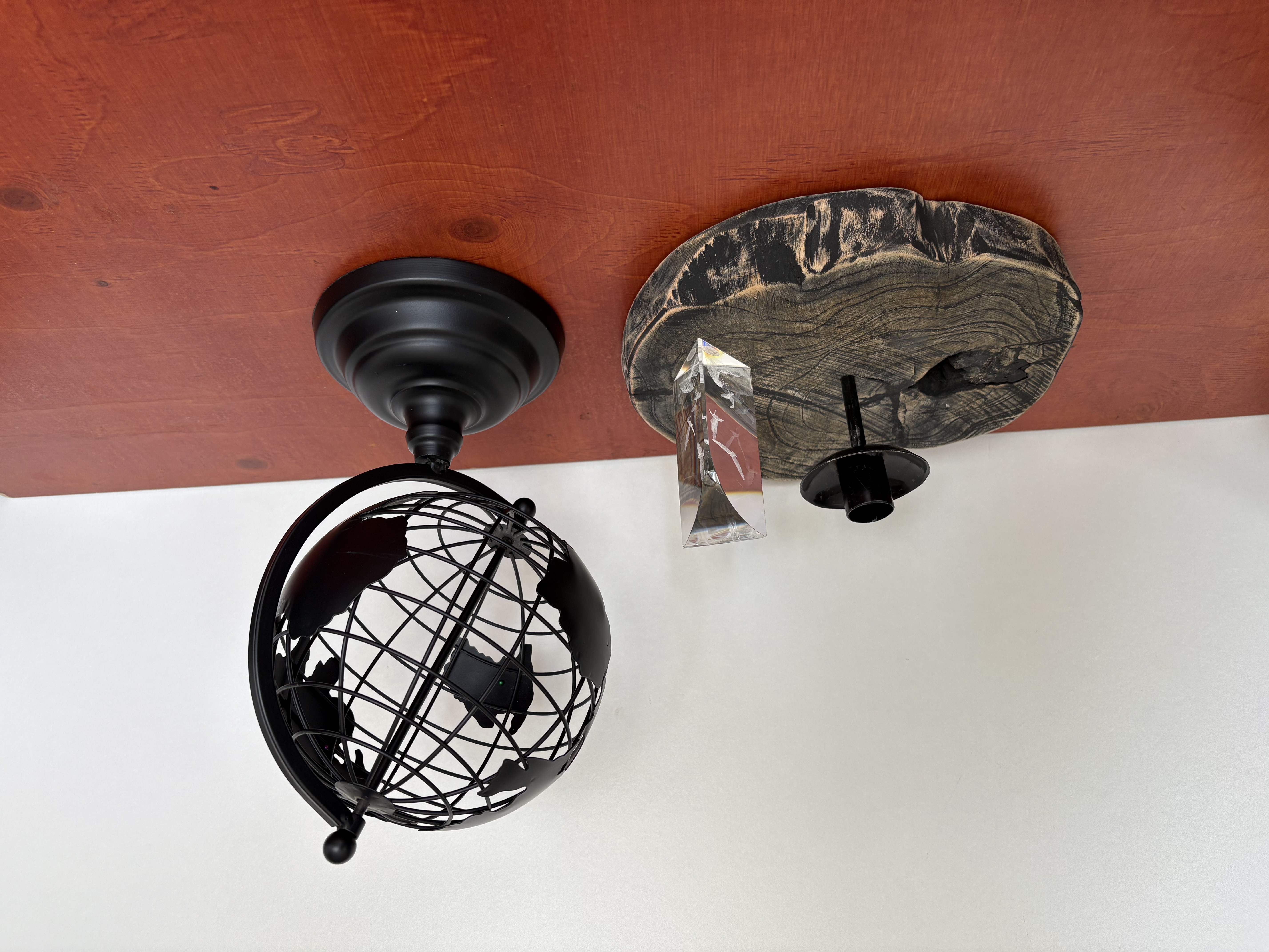 Wereldbol, houten kandelaar en kristal