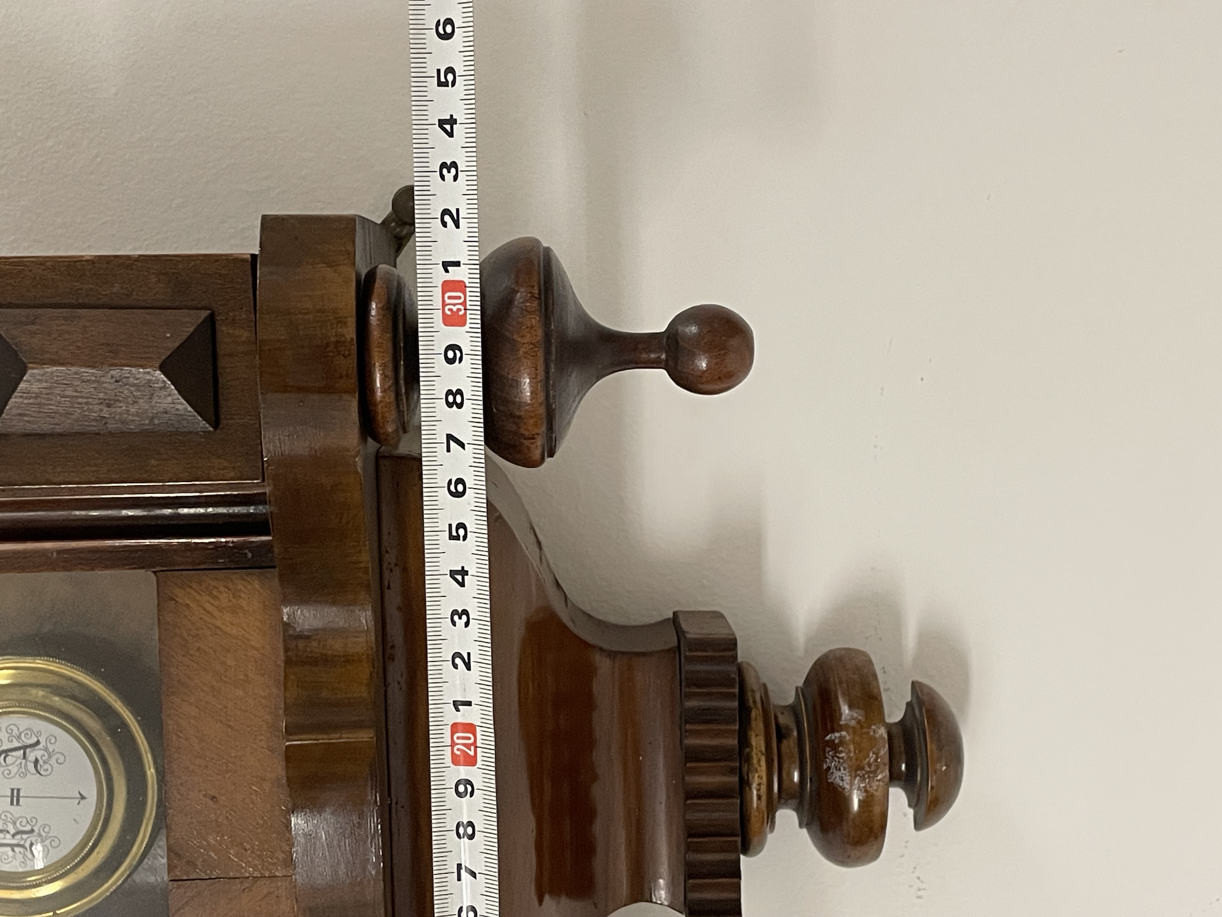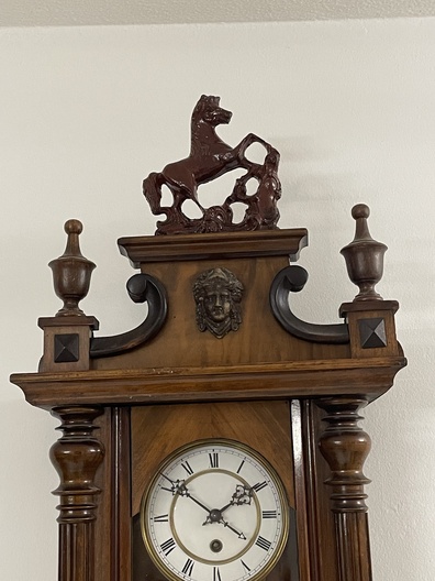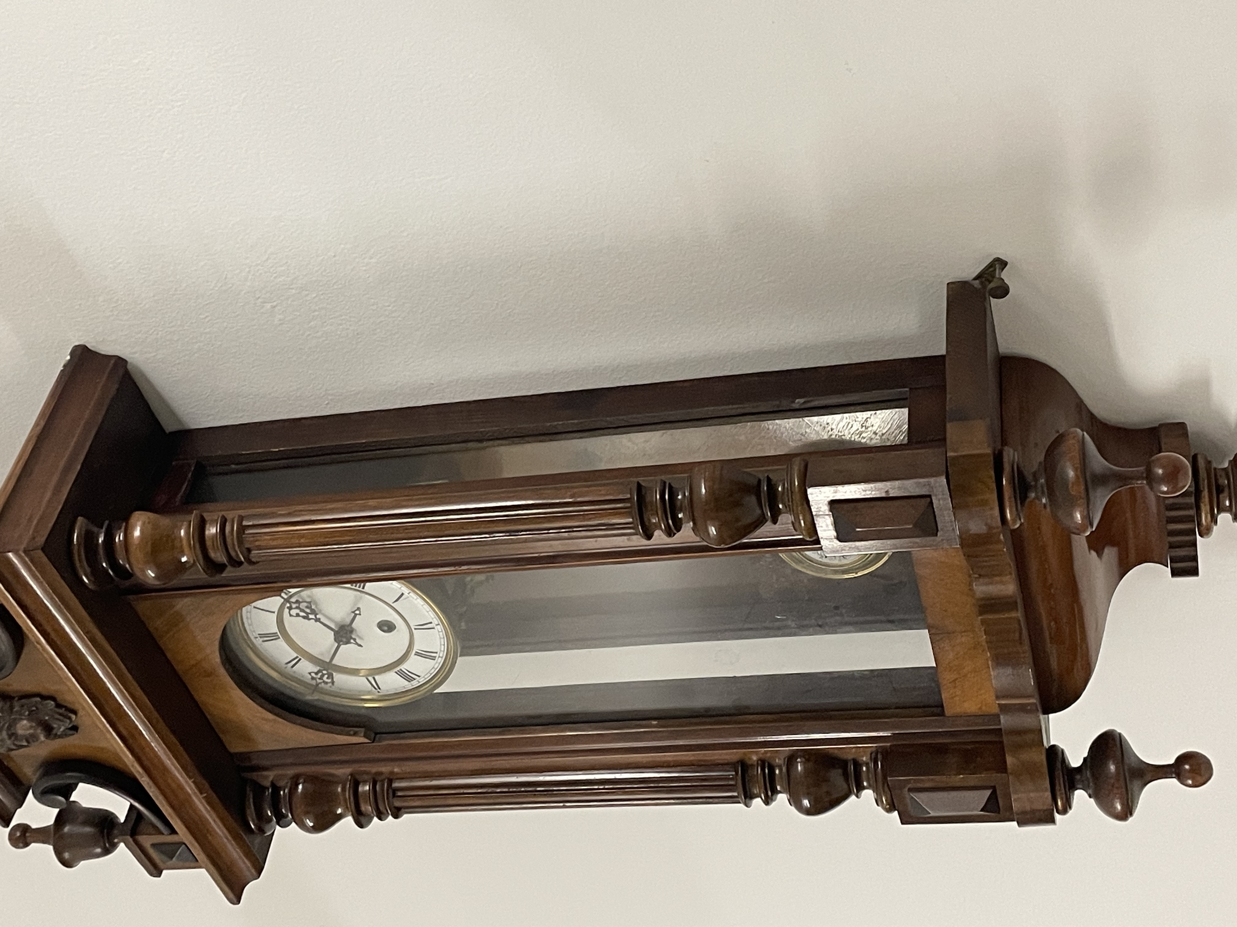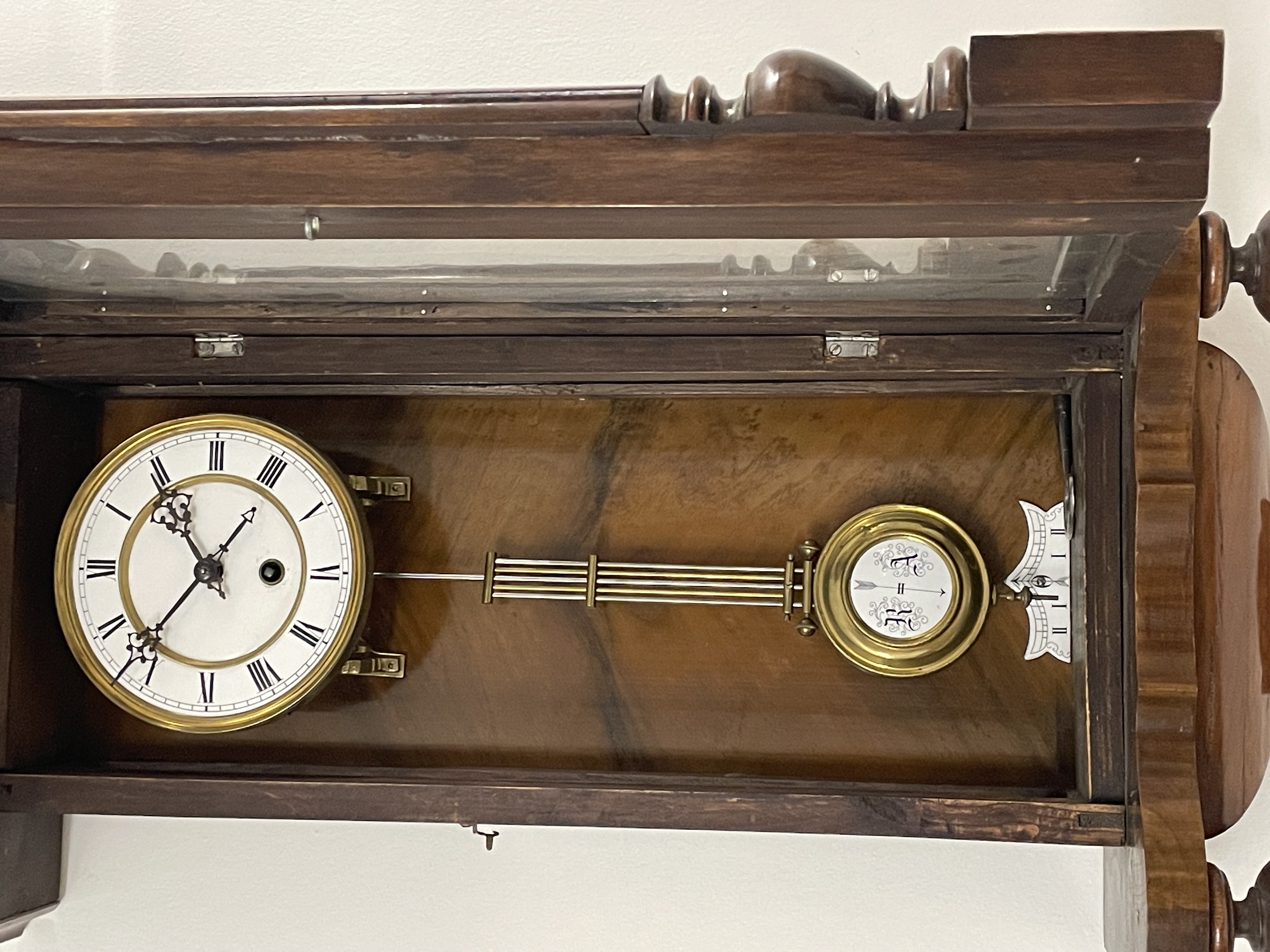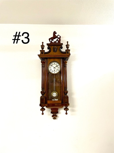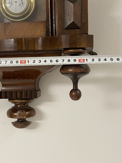 Klok is afkomstig van een klokkenmaker en is werkend uitgehaald van de muur. Hoe voorzichtig het ook is verplaatst kunnen we geen garantie geven (correcte werking).