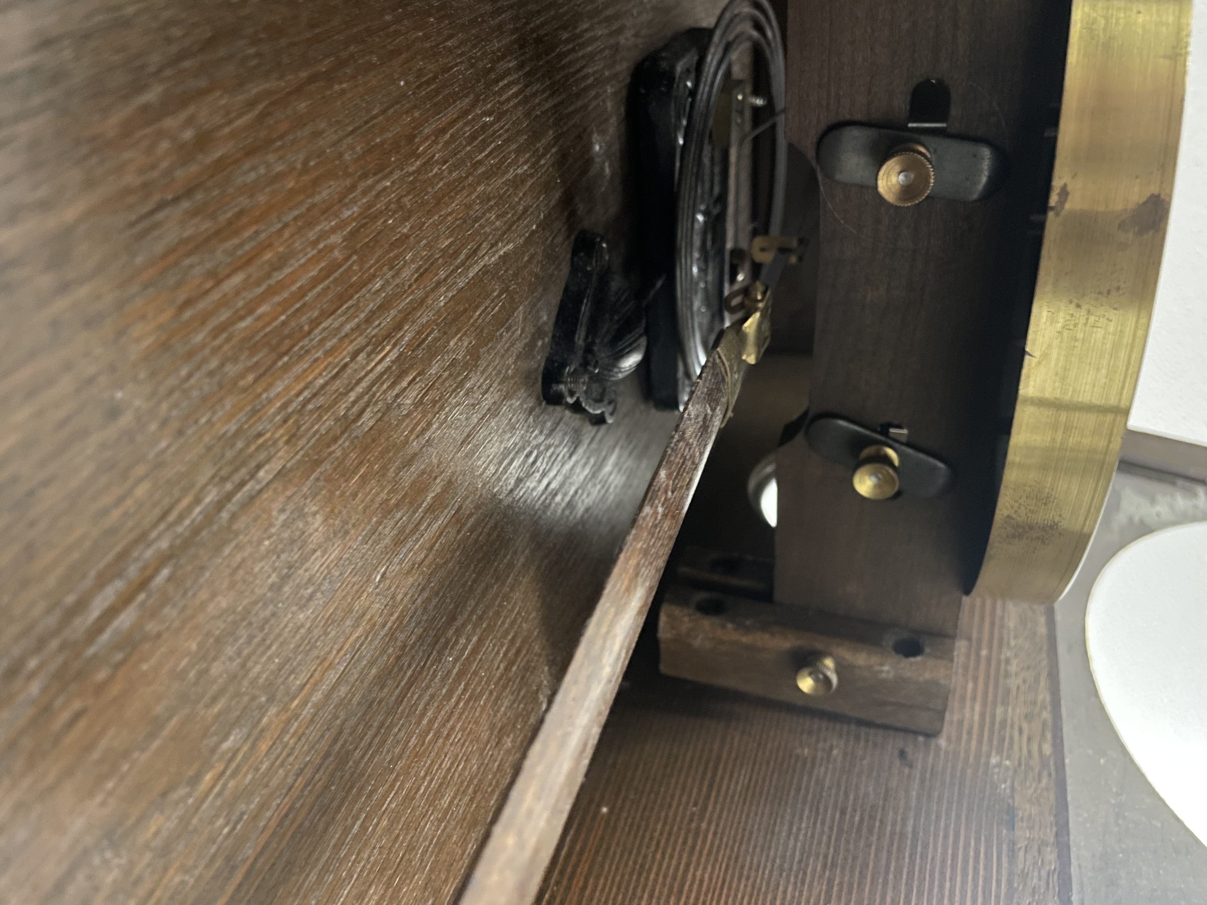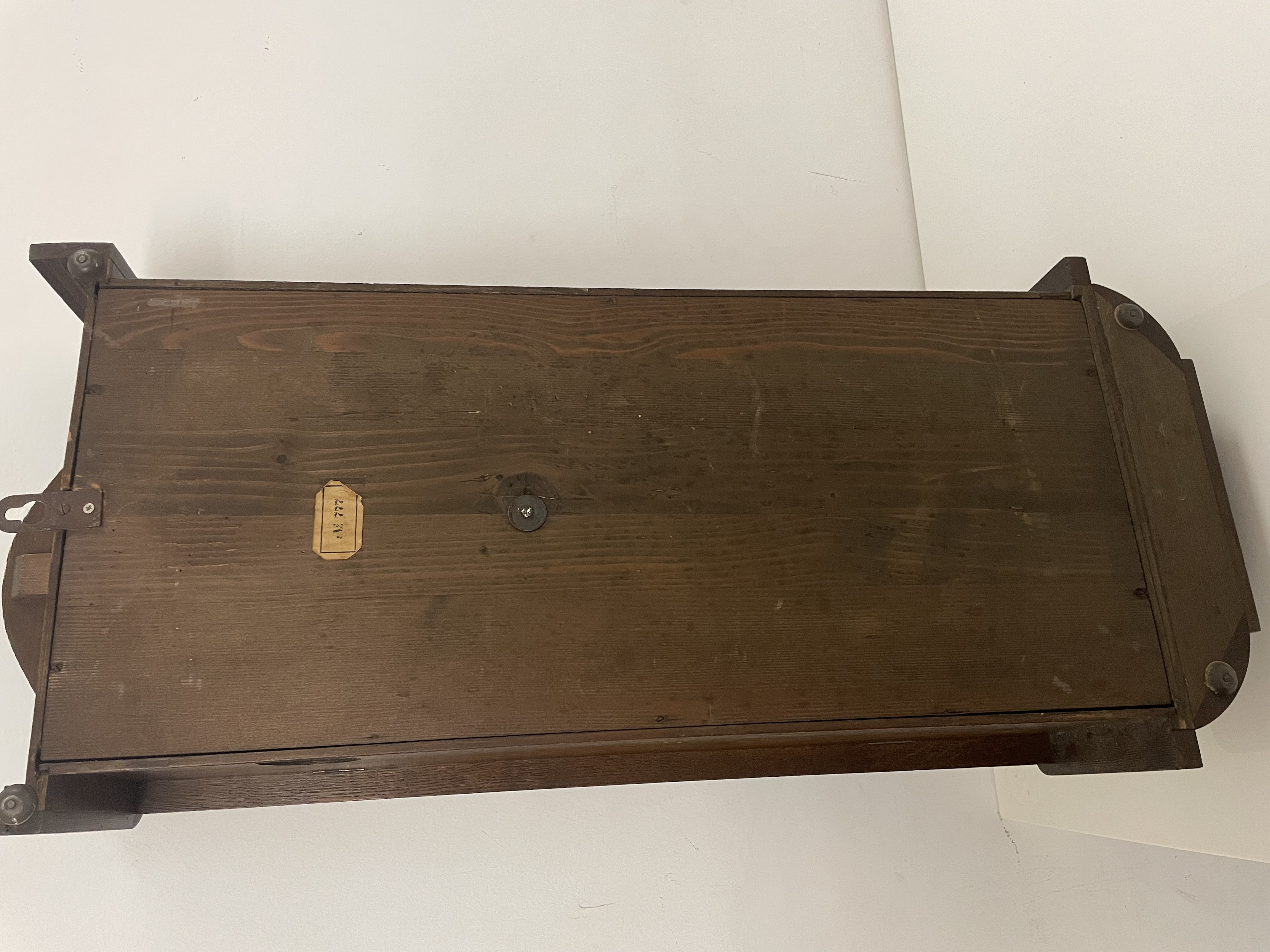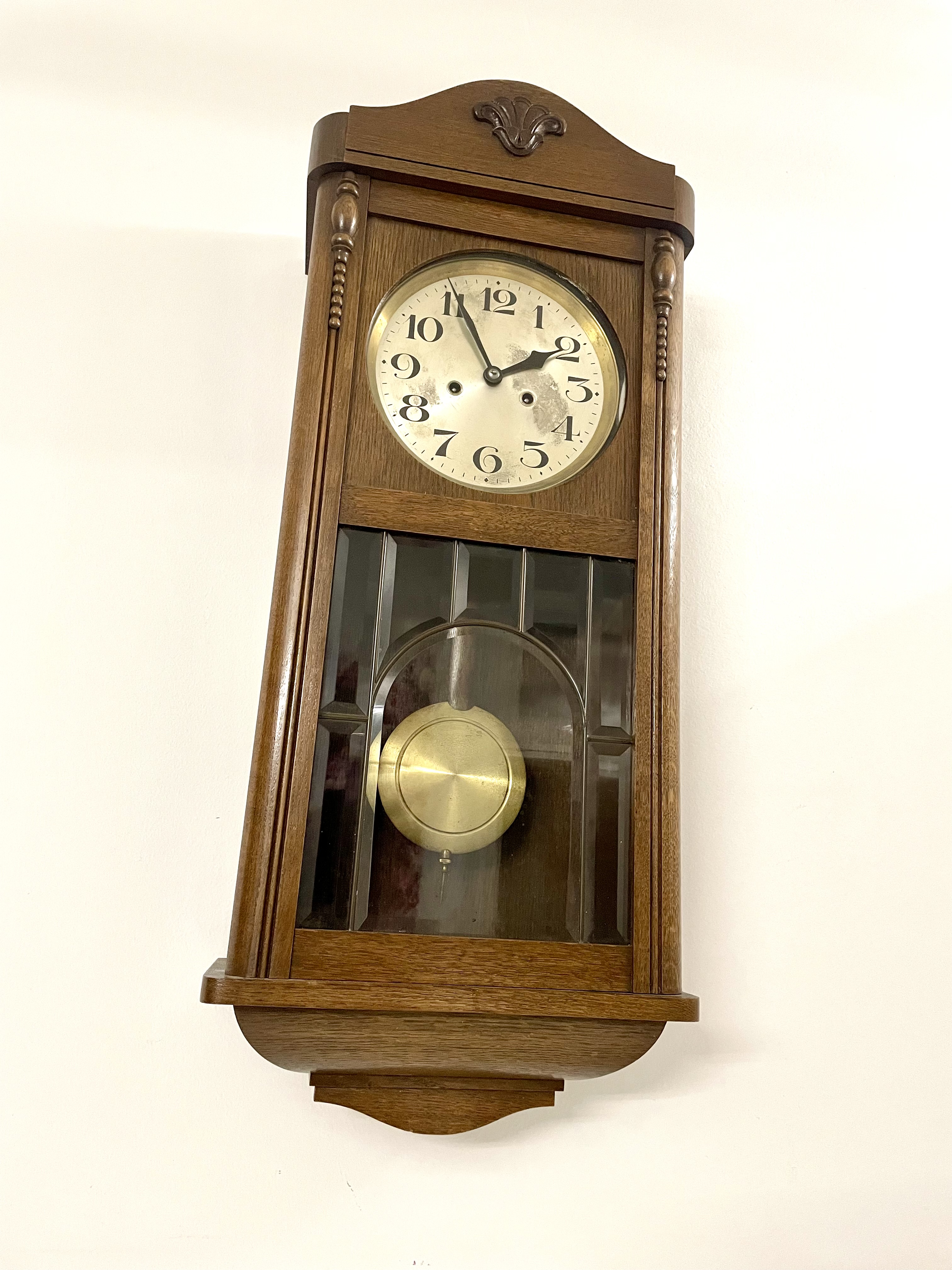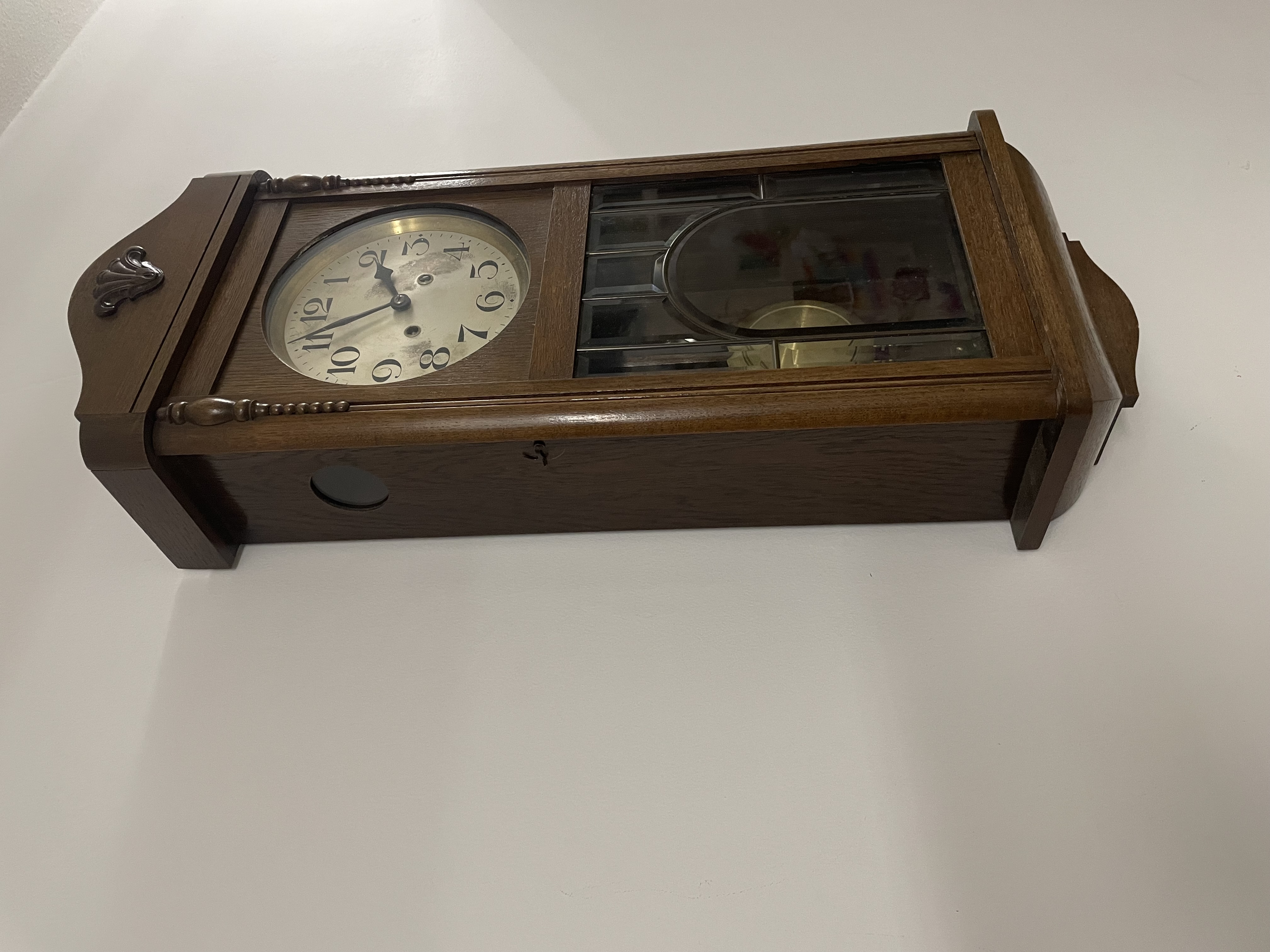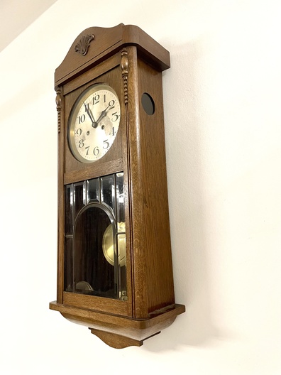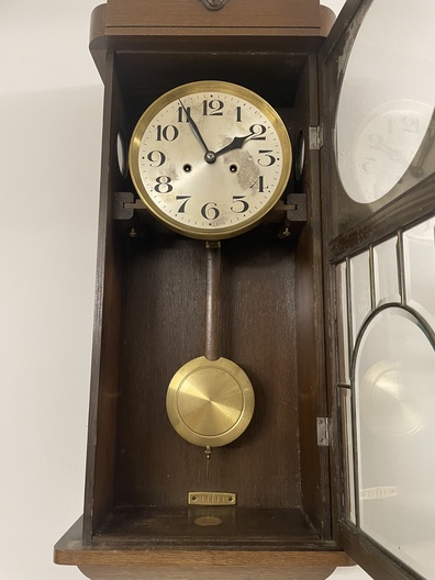 Klok is afkomstig van een klokkenmaker en is werkend uitgehaald van de muur. Hoe voorzichtig het ook is verplaatst kunnen we geen garantie geven (correcte werking).