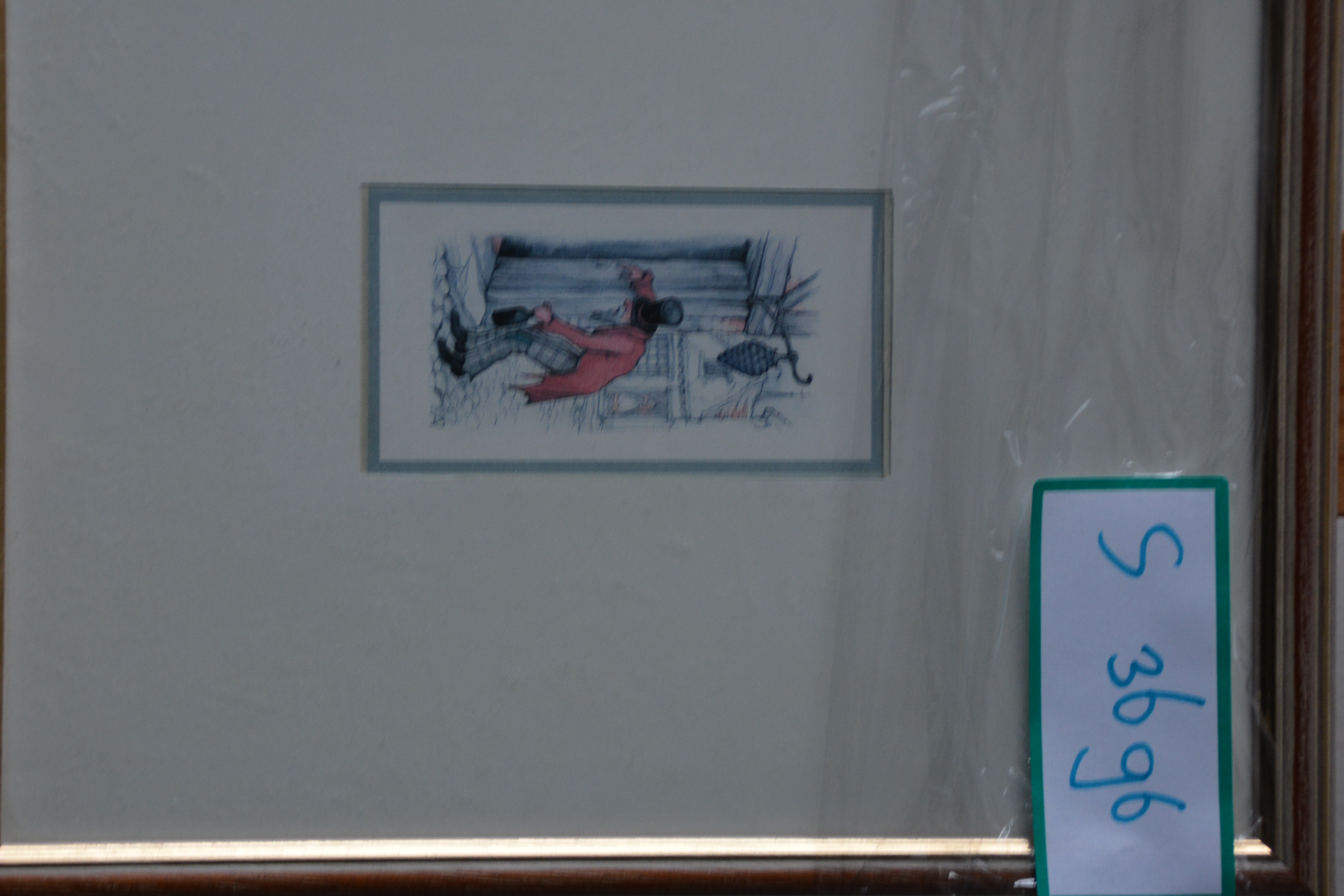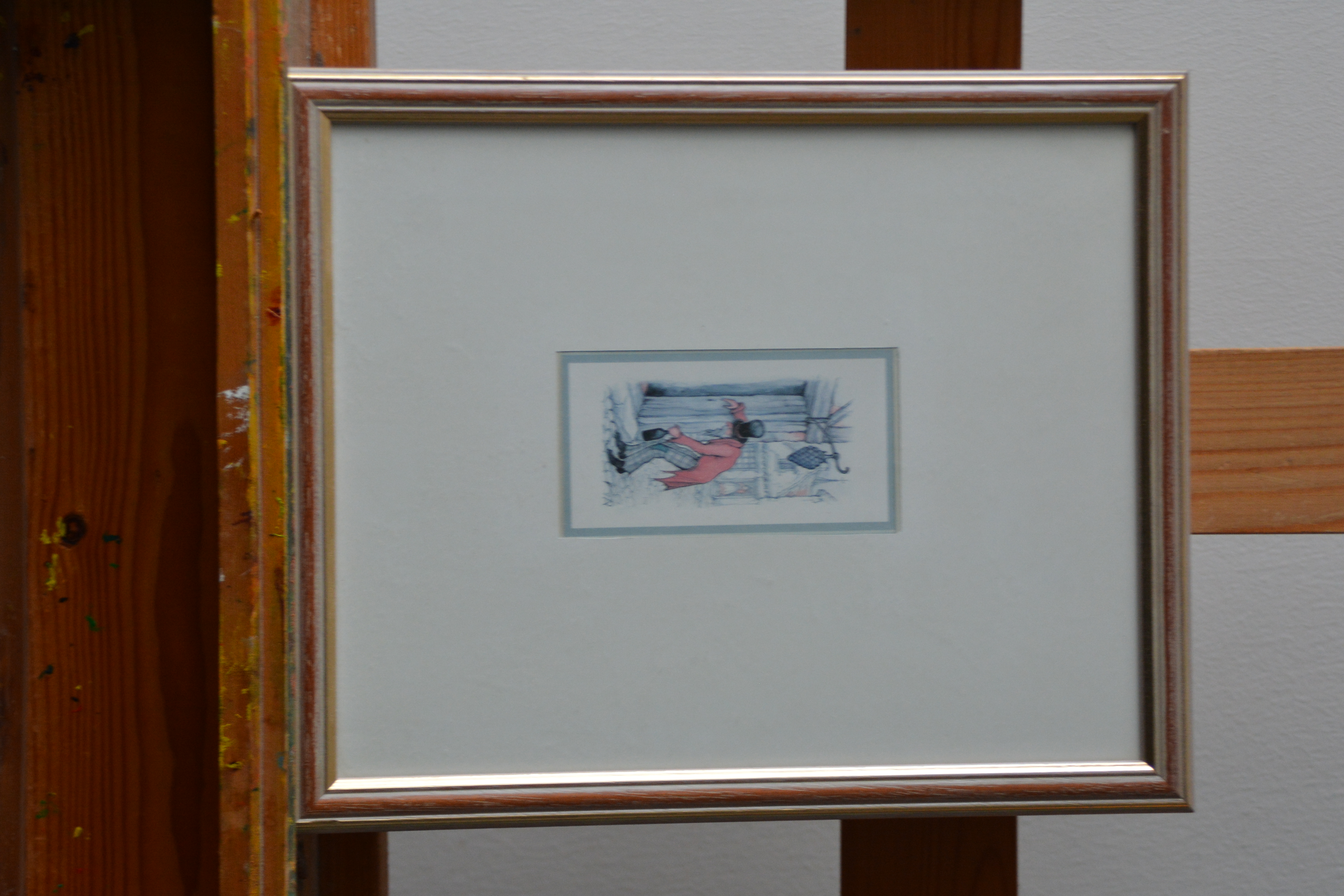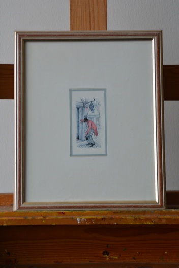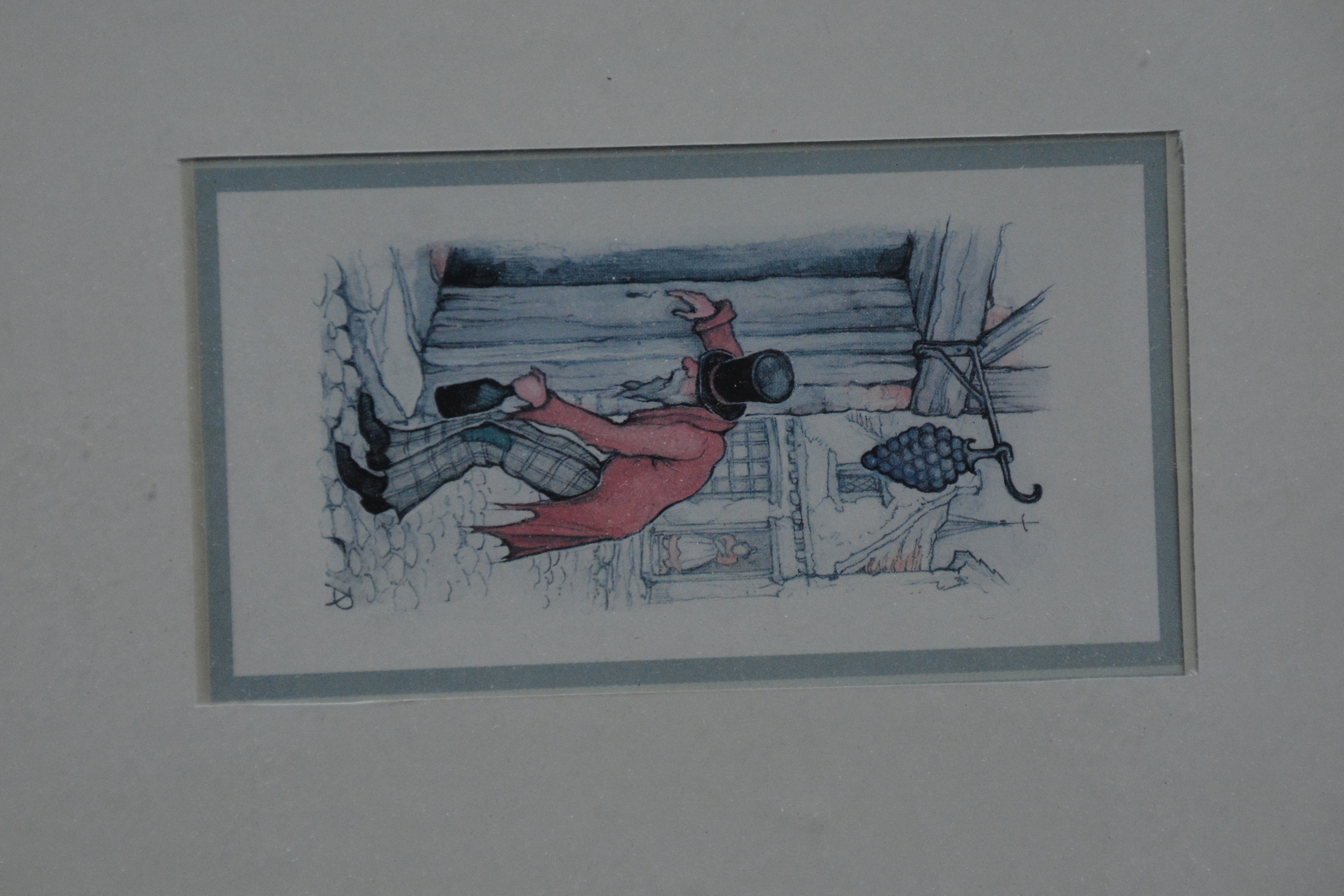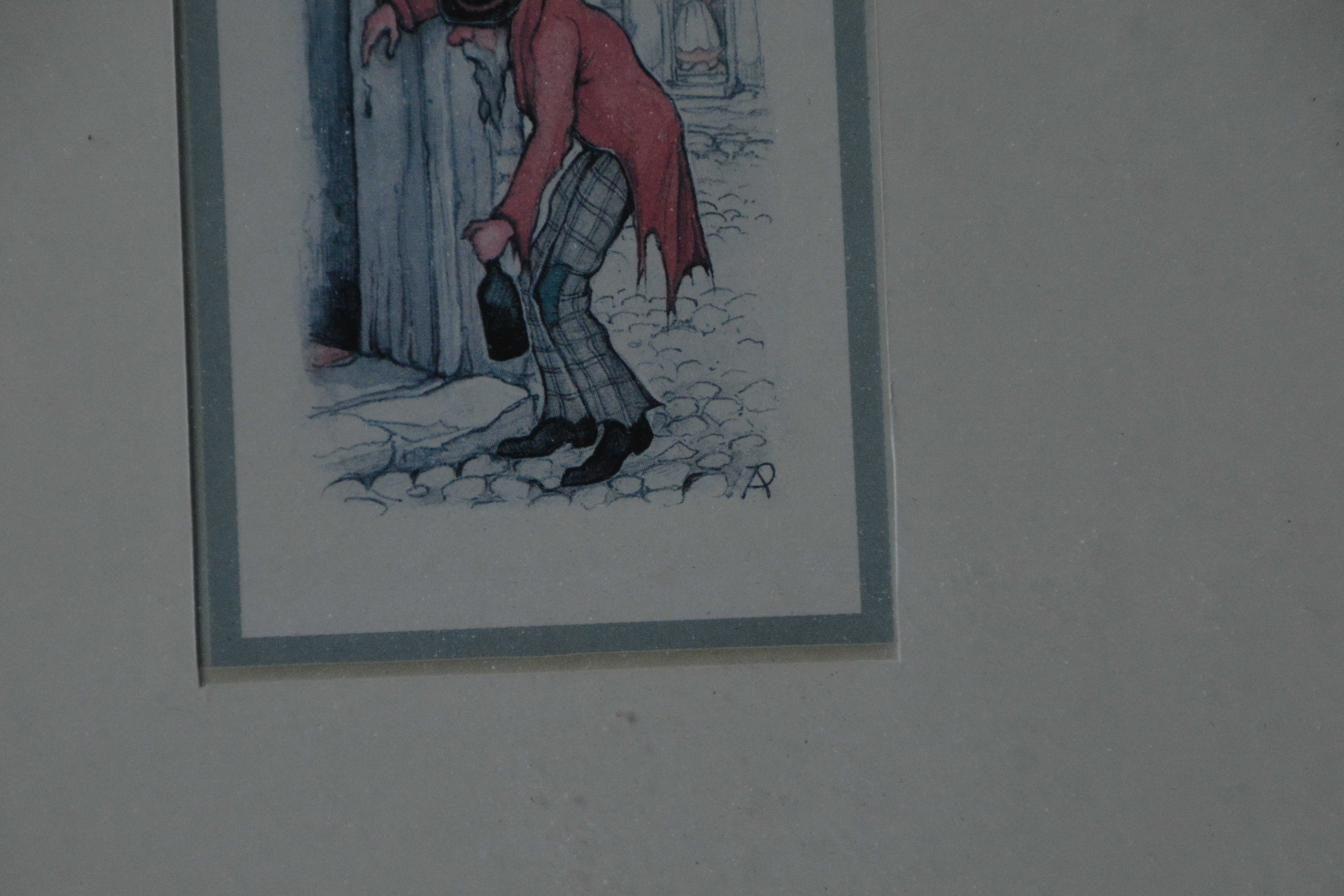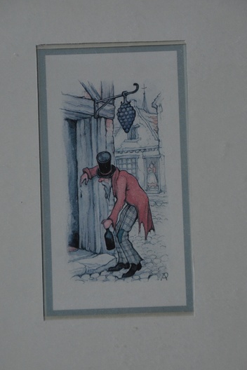 Ingelijste prent van de bekende Nederlandse kunstenaar Anton Pieck (1895-1887). We zien een dronken man, hangend bij een huis. Prent verkeert in goede staat.