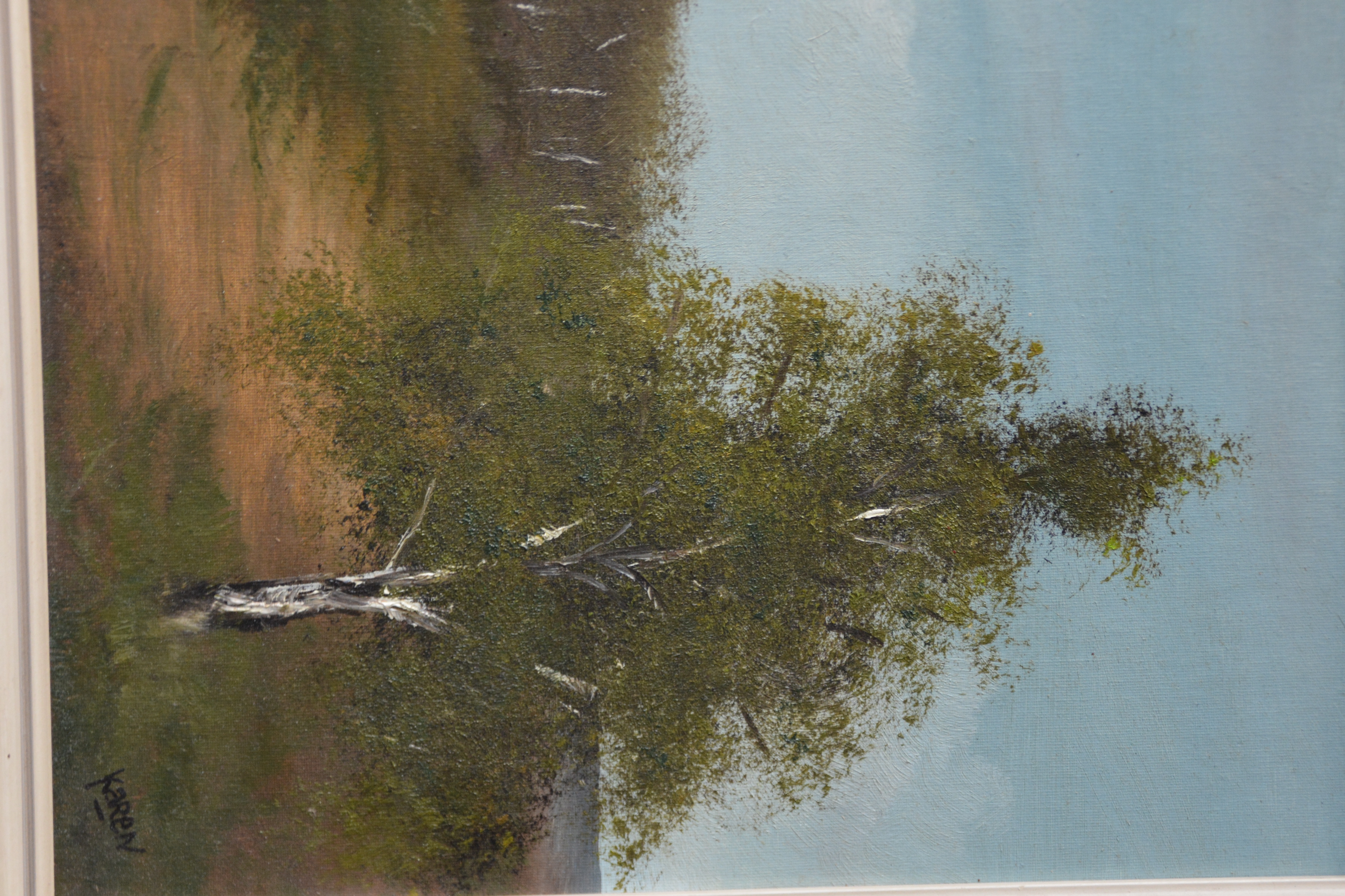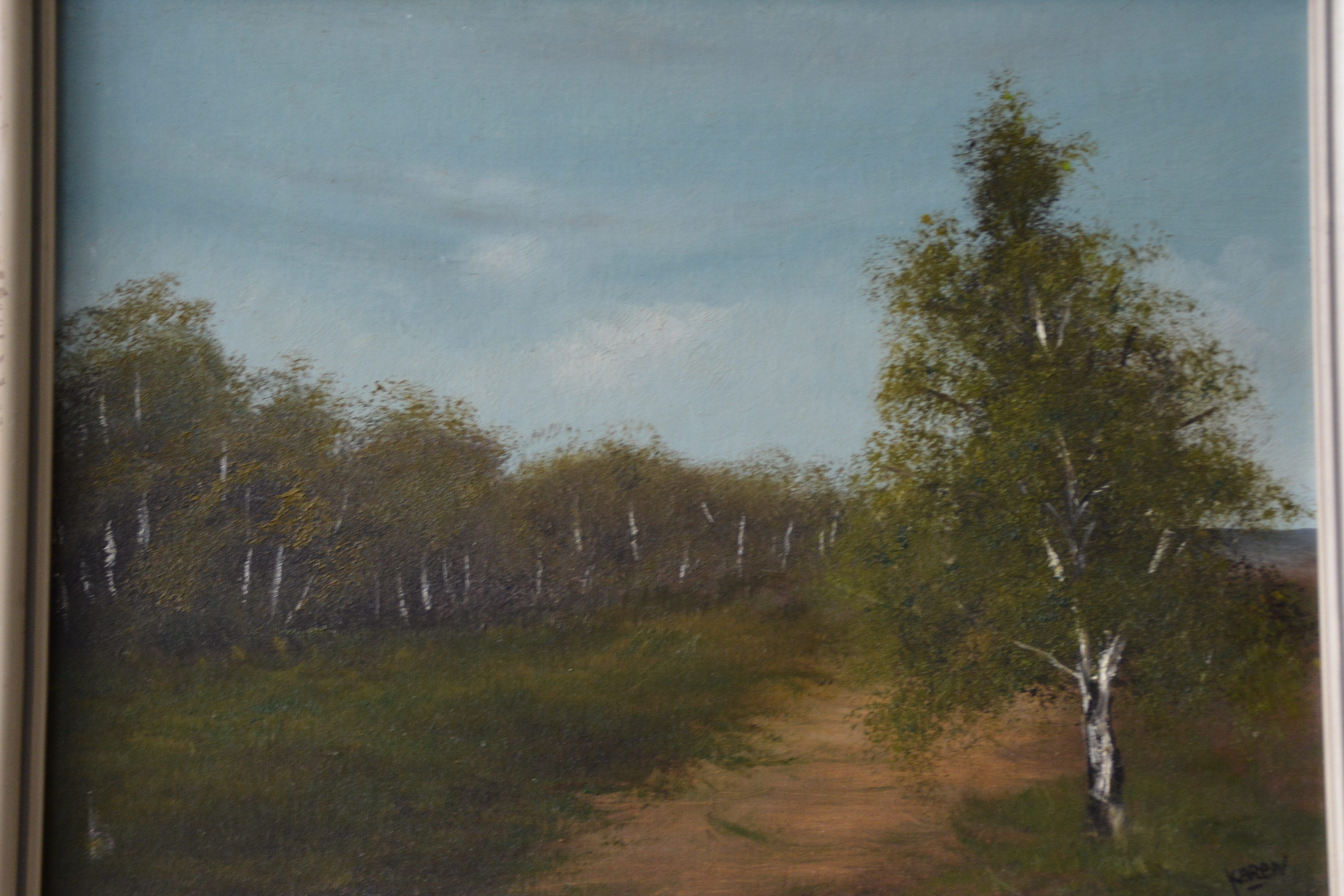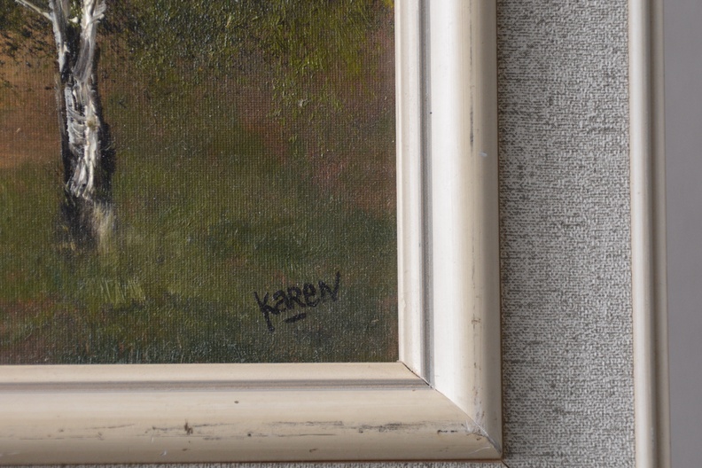 Gesigneerd met ‘Karen’. Goed geschilderd berkenlandschap. Ingelijst en olieverf op paneel. In goede staat.