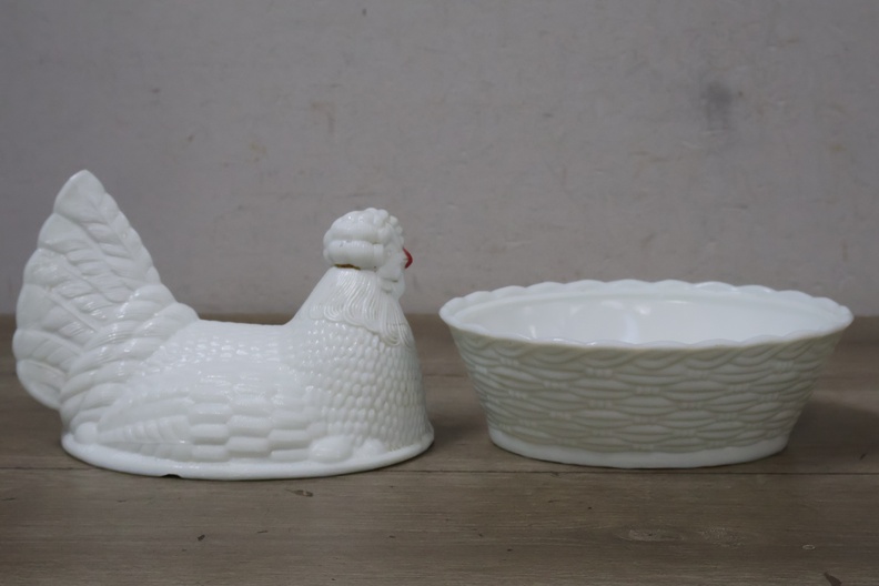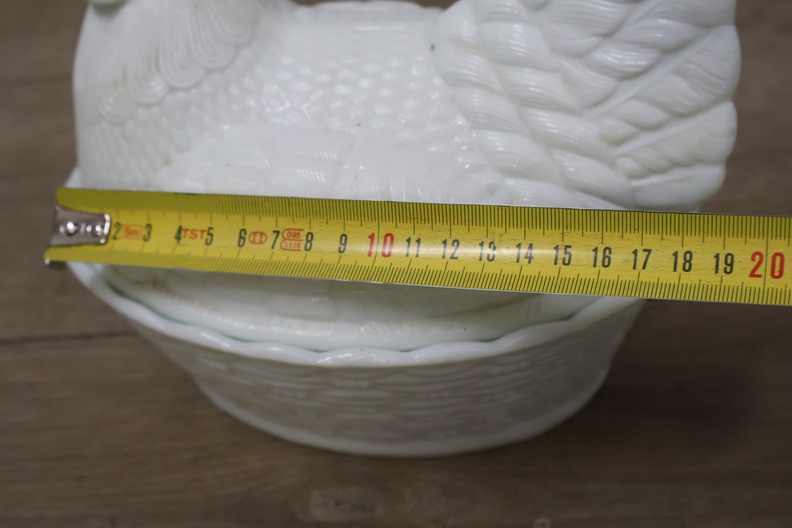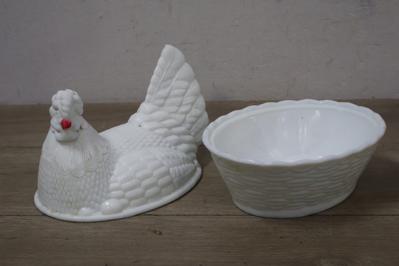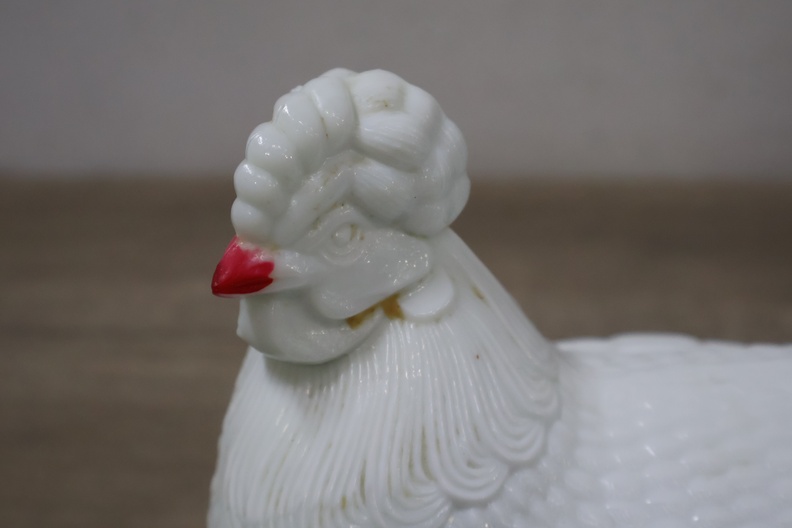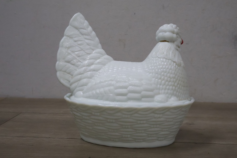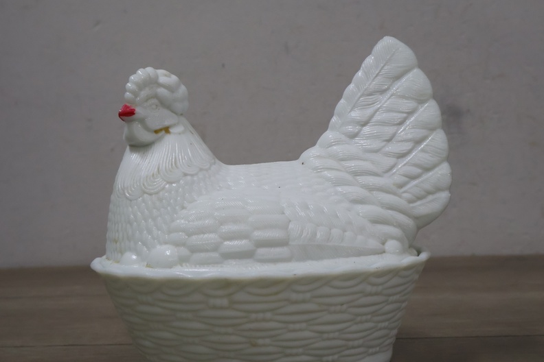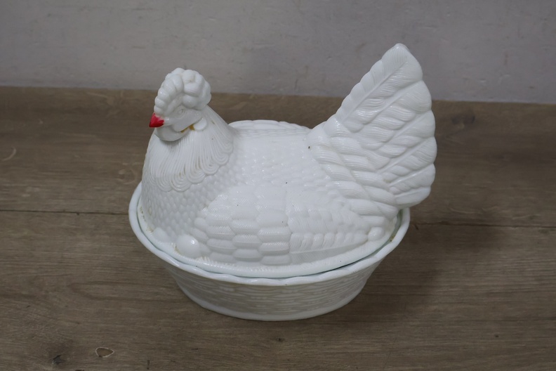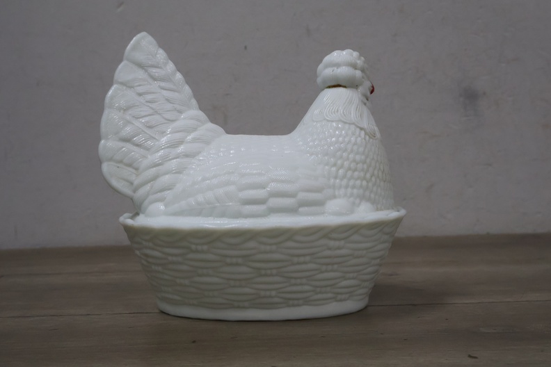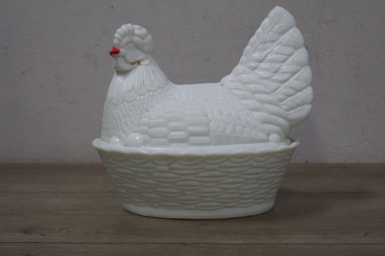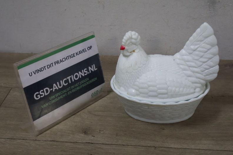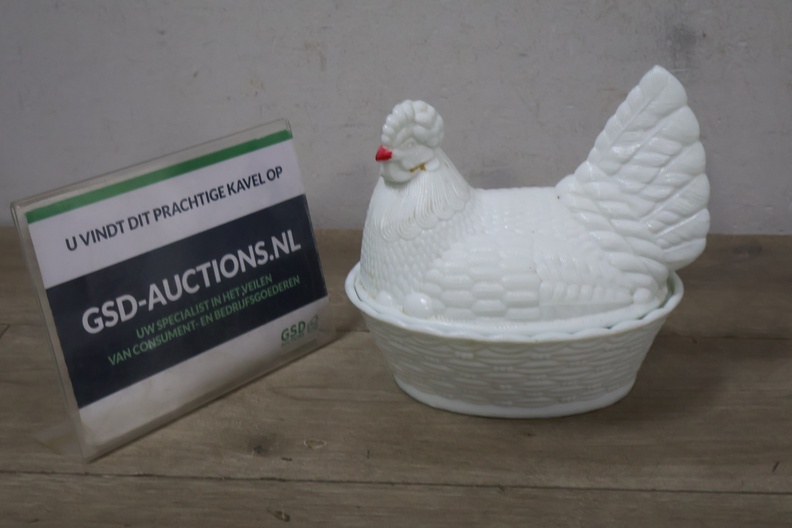 Glazen dekselschaal in de vorm van een kip