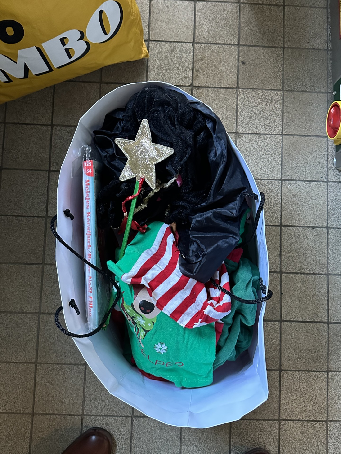 De tas bevat een mix van kledingstukken en verkleedaccessoires, zoals o.a. feestelijke kleding, thema-items en accessoires (zie foto’s).