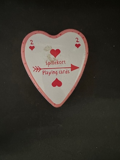 Te koop: een schattig hartvormig setje speelkaarten in een stevig metalen blikje (Spillekort / Playing Cards).