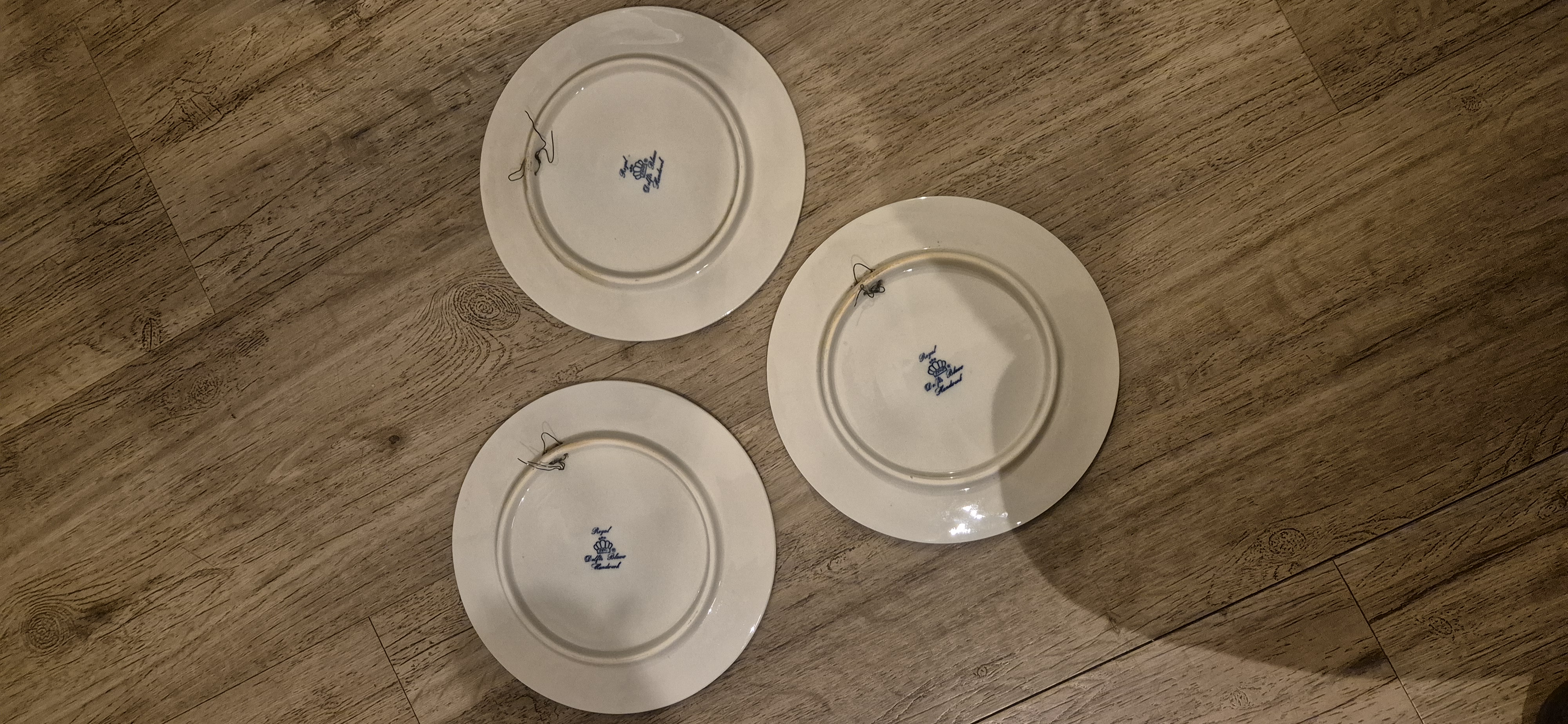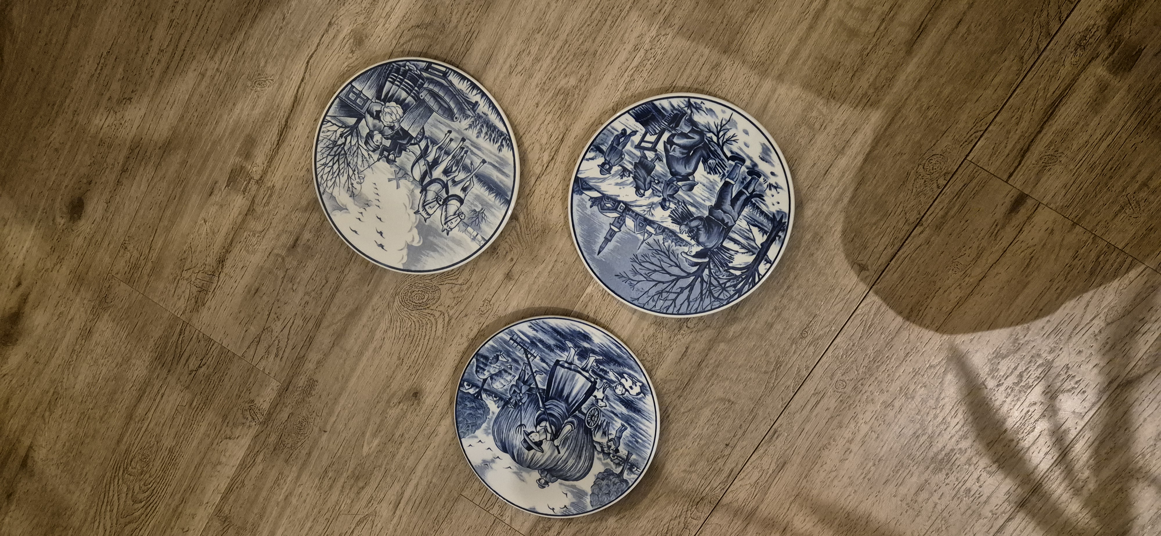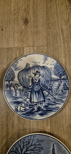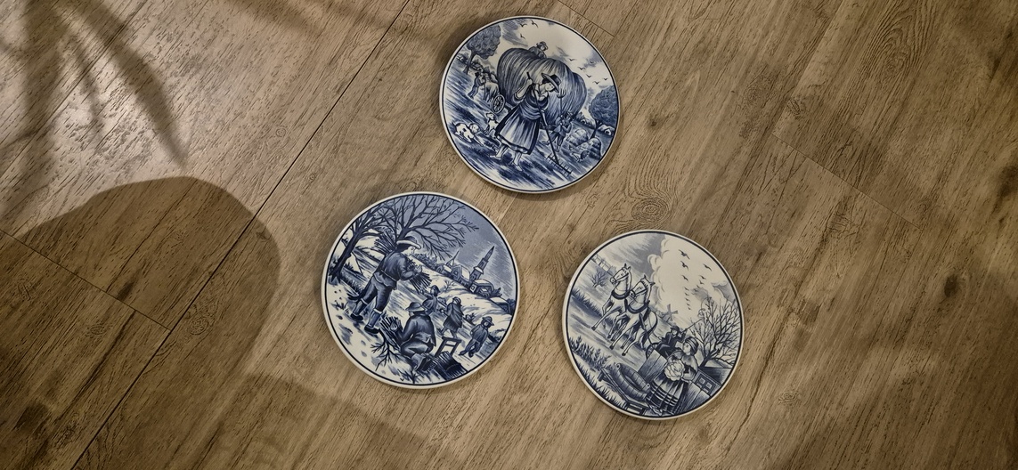 Set van drie handbeschilderde wandborden van Royal Delfts Blauw met landelijke Hollandse taferelen uit de serie “Vier Jaargetijden”.
