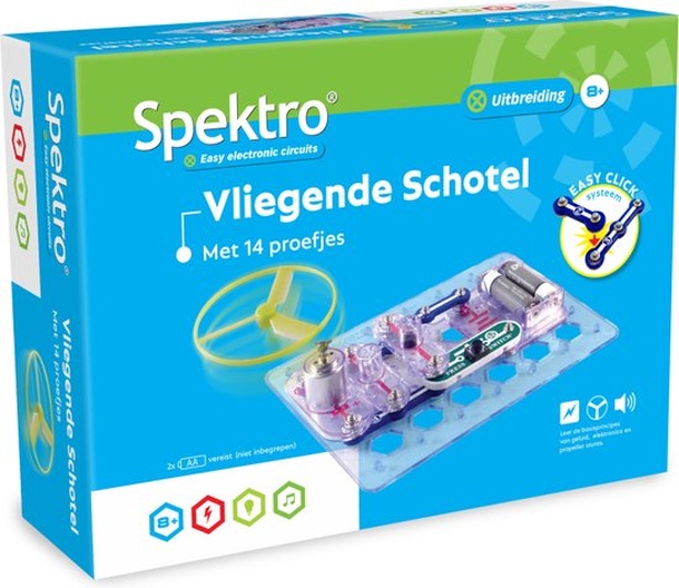 Met Spektro leer je elektrische schakelingen te bouwen vanaf een tekening. Spektro helpt kinderen in een veilige omgeving te experimenteren met elektriciteit. Door een eenvoudige drukknoopverbinding kunnen ze al snel interessante schakelingen maken. Door gebruik te maken van drukknoopverbindingen kan je de onderdelen telkens opnieuw gebruiken.