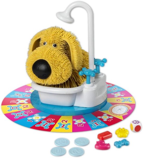 Soggy Doggy van Megableu is een hilarisch actiespel waarbij je vooral droog moet zien te blijven! De superzachte hond houdt er van om zichzelf droog te schudden. Maak jij een rondje om het spelbord zonder nat te worden? Dan ben je de winnaar! Raakt Soggy Doggy je toch met zijn spetters, dan moet je weer helemaal opnieuw beginnen.