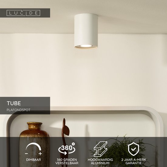 De opbouwspot Tube rond van Lucide is een, uit volledig aluminium vervaardigd armatuur en heeft hierdoor een zeer hoogwaardige uitstraling. Met een diameter van 9.6cm laat hij zich eenvoudig over een centraaldoos plaatsen. Dit artikel is bij uitstek geschikt als lichtpunt in een kleine hal of toilet. In serie geplaatst is de Tube ook perfect te gebruiken boven bijvoorbeeld een bar of keukenblad. Door zijn 360 graden draaibare en kantelbare spot is de Tube op ieder gewenst punt in de ruimte te richten. De Tube is voorzien van een GU10 hoogvolt fitting en wordt geleverd zonder lichtbron. Aan u de keus om er een mooie al dan niet dimbare GU10 LED spot of een traditionele dimbare GU10 halogeenspot in te gebruiken. De Tube is verkrijgbaar in de kleuren aluminium en wit.