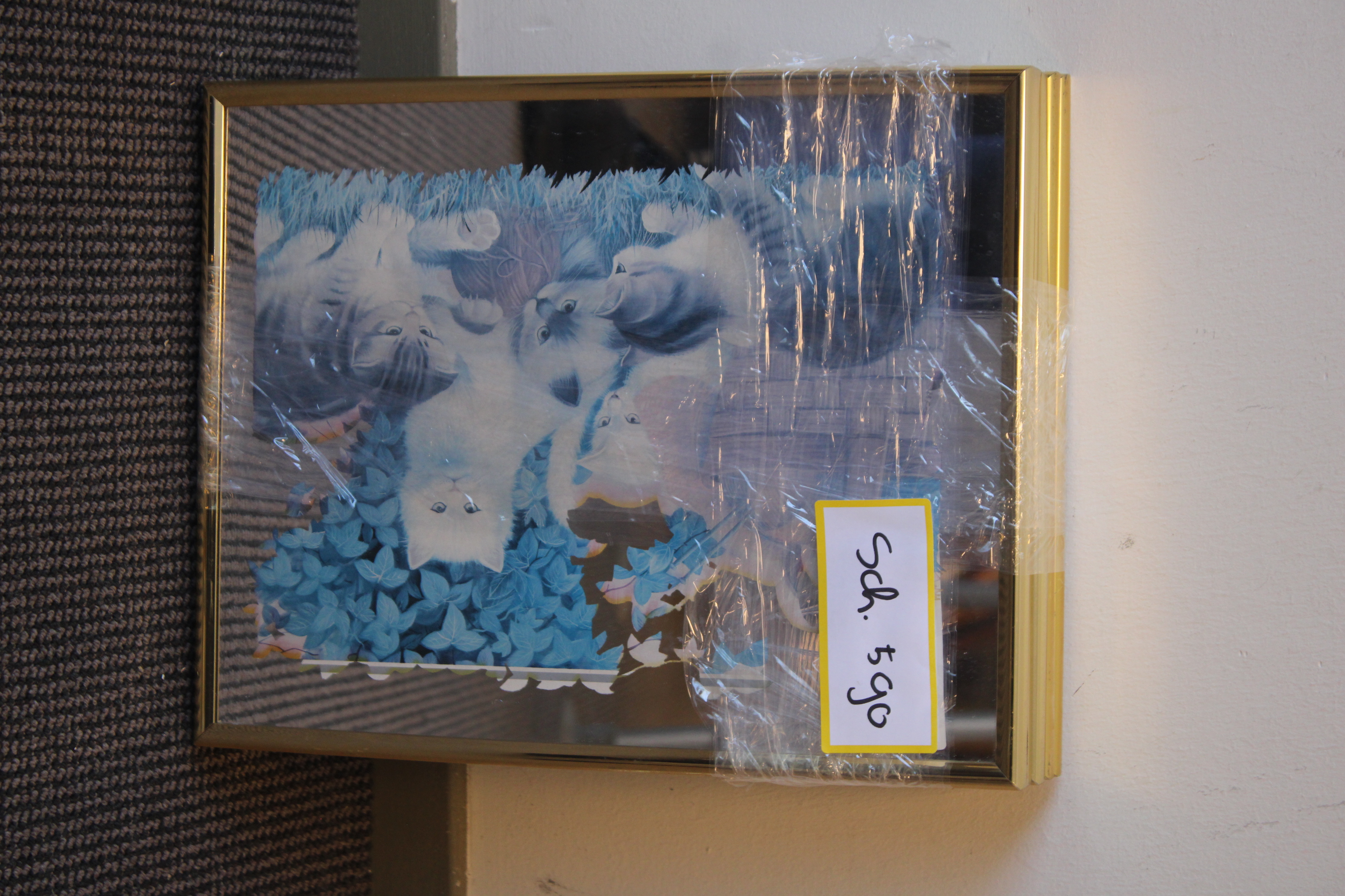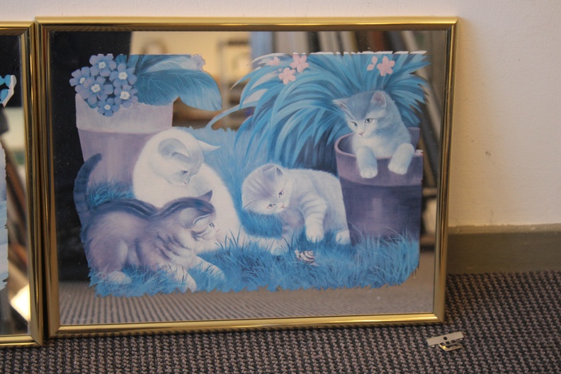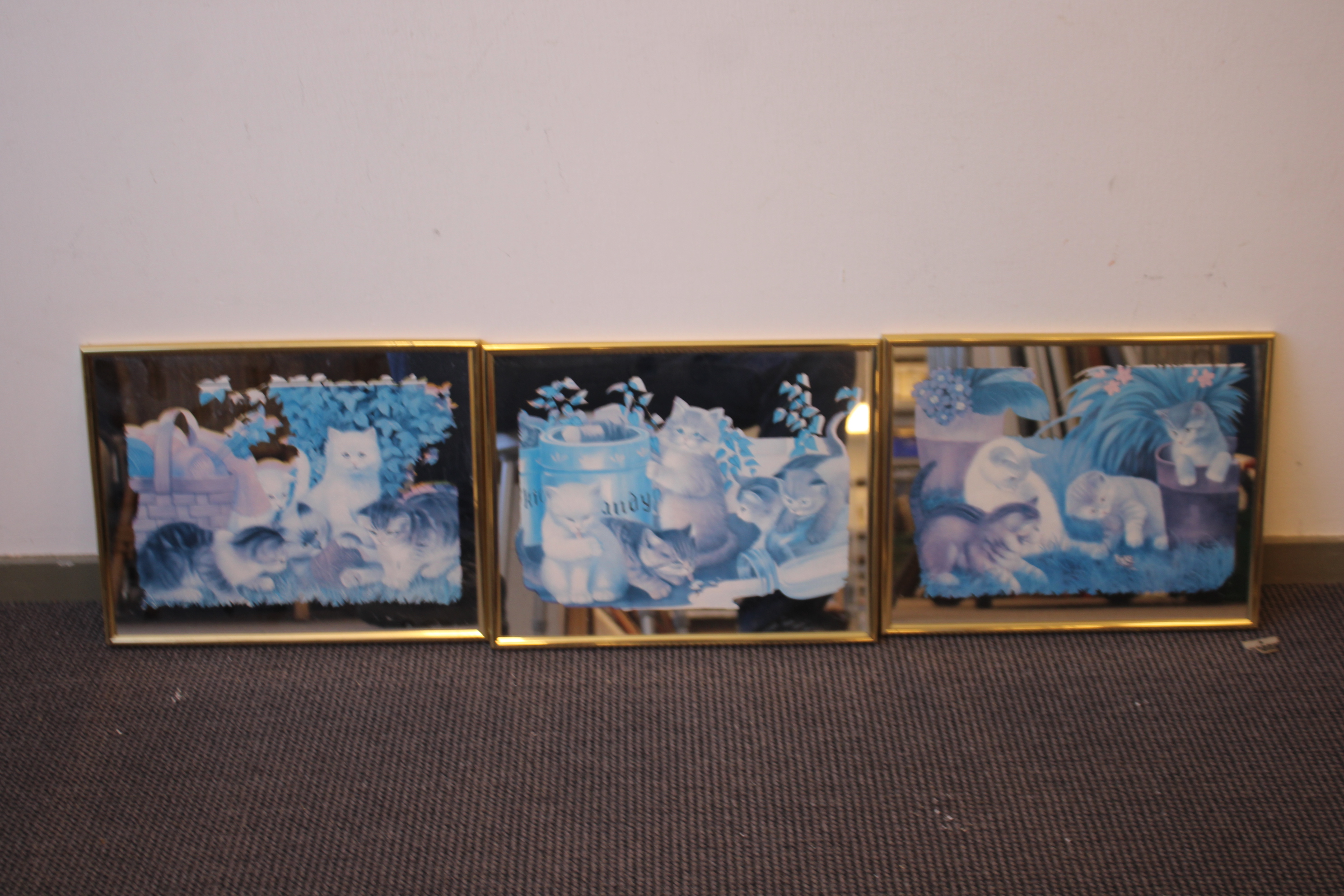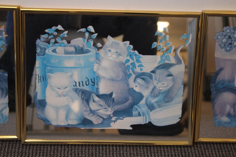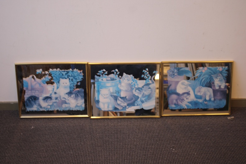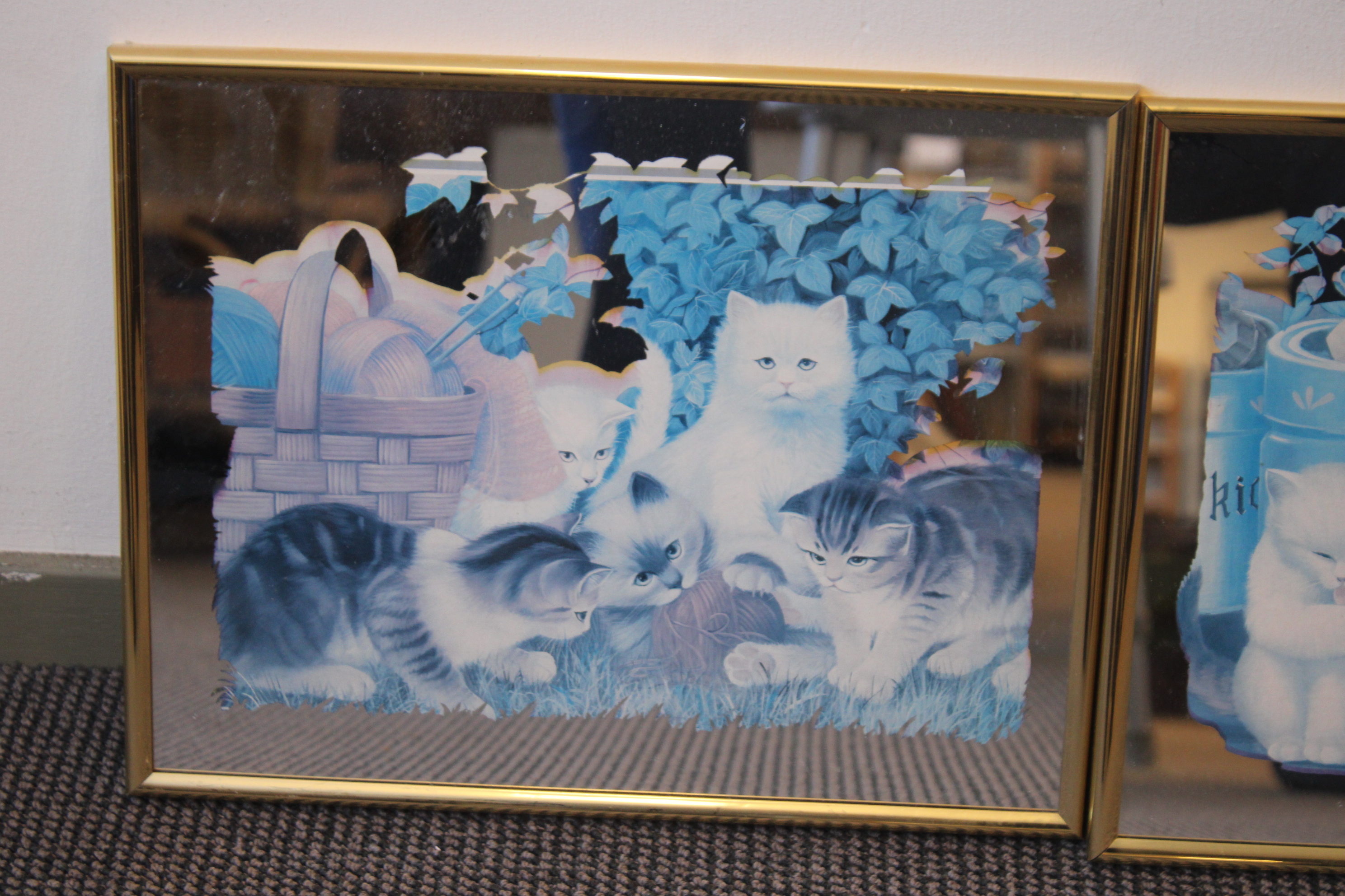 Romantische tafereeltjes van katten met kittens met een spiegelachtergrond. 3 Verschillende spiegels. In goede staat.