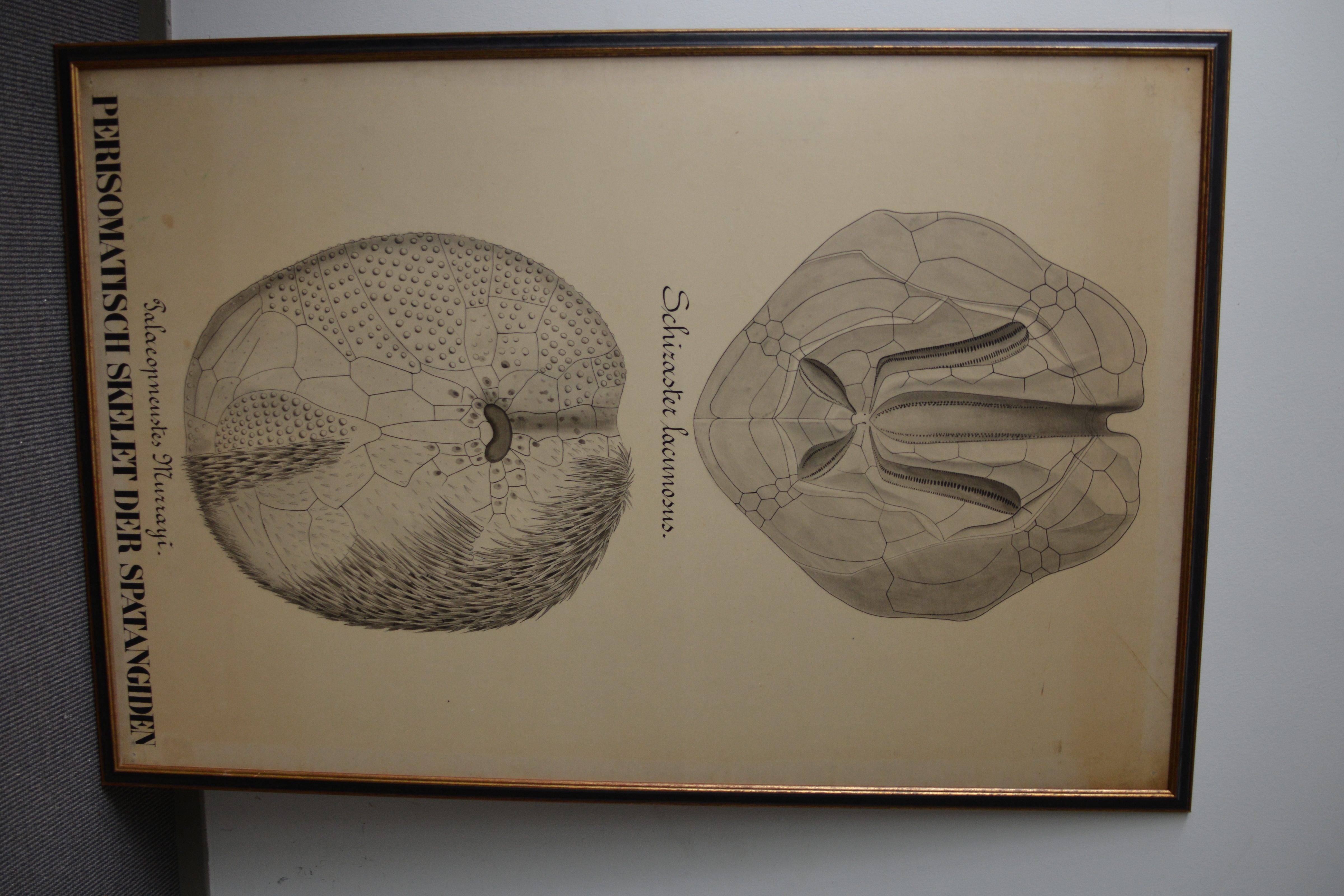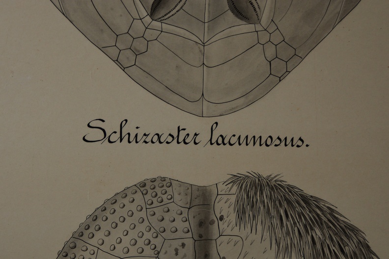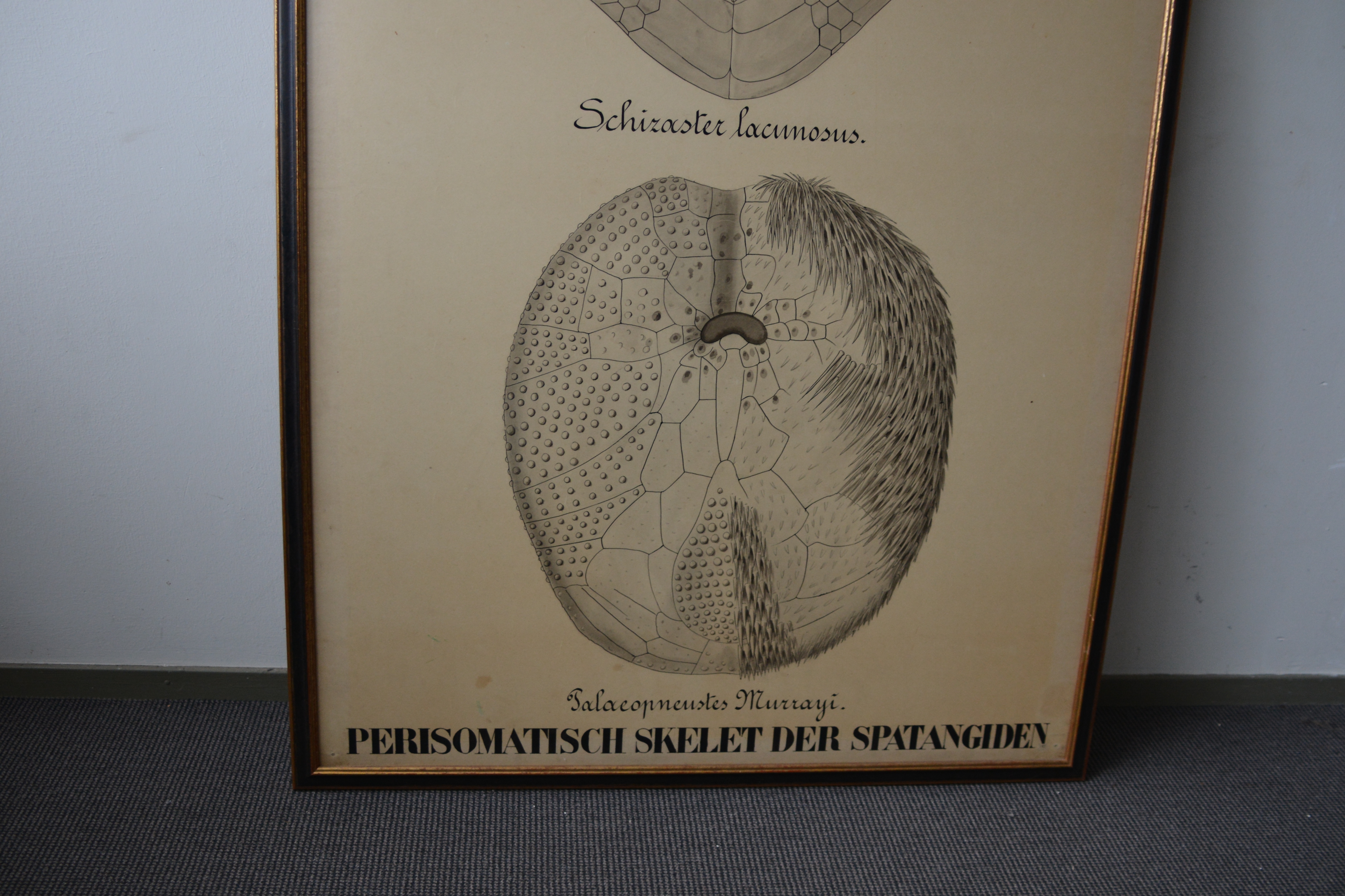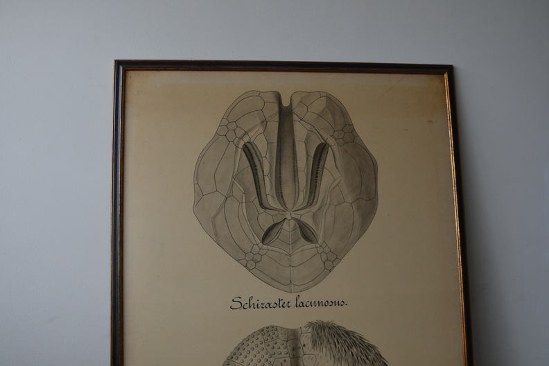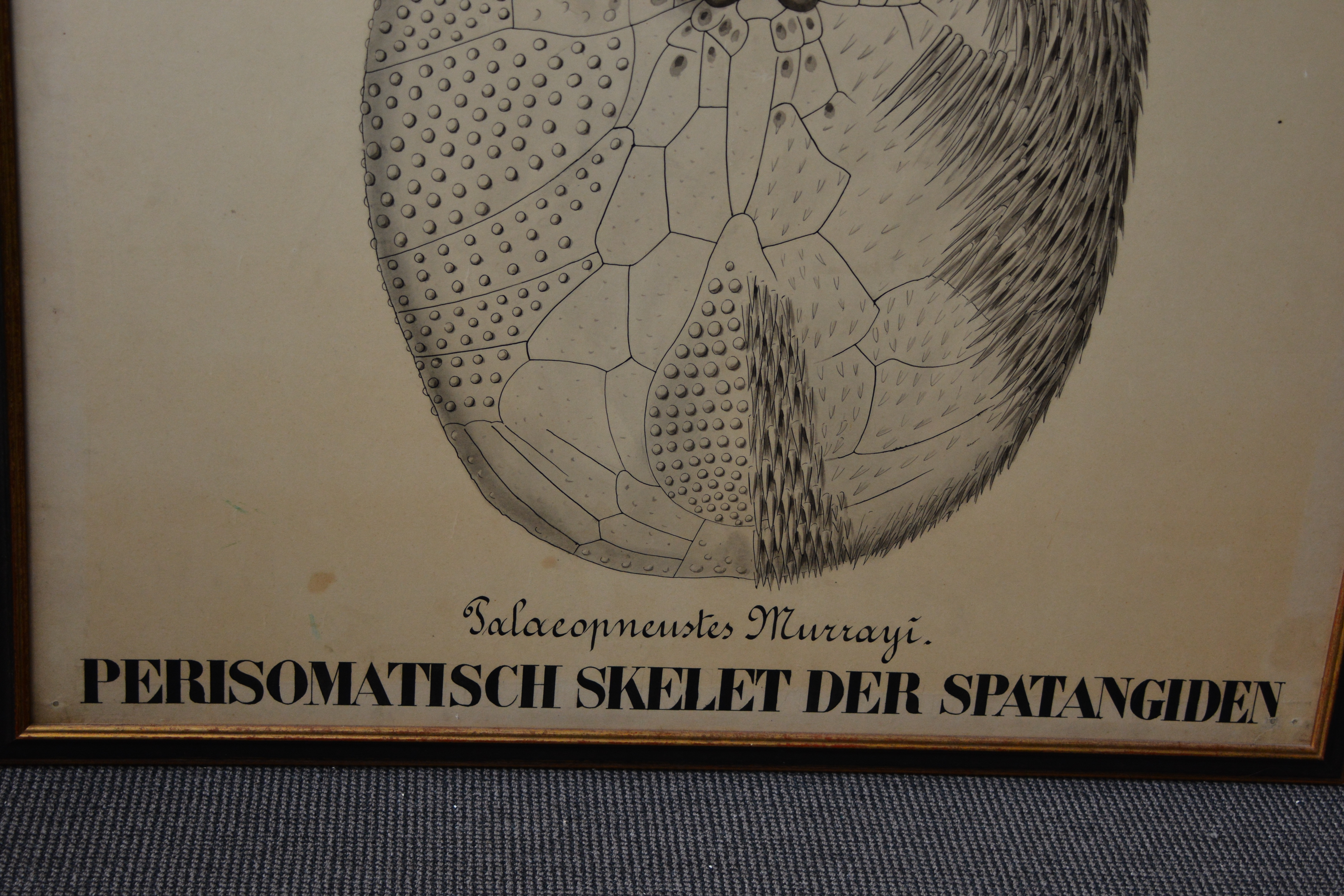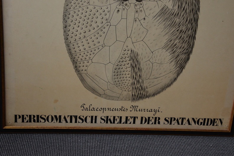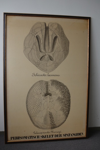 Zeer grote poster, waarschijnlijk oorspronkelijk van een biologie opleiding. Officiele titel is: Perisomatisch skelet der Spatangiden. In goede staat.