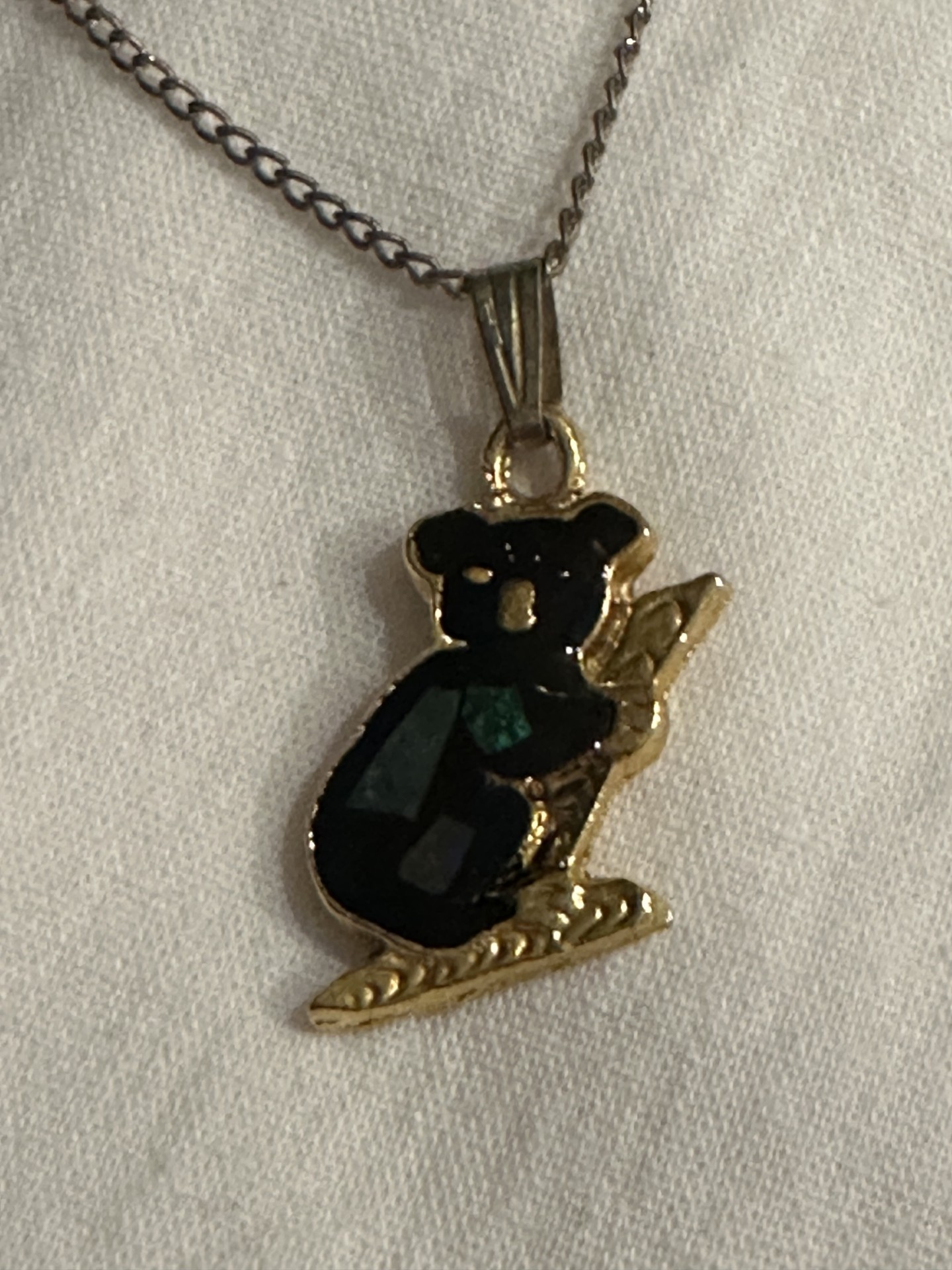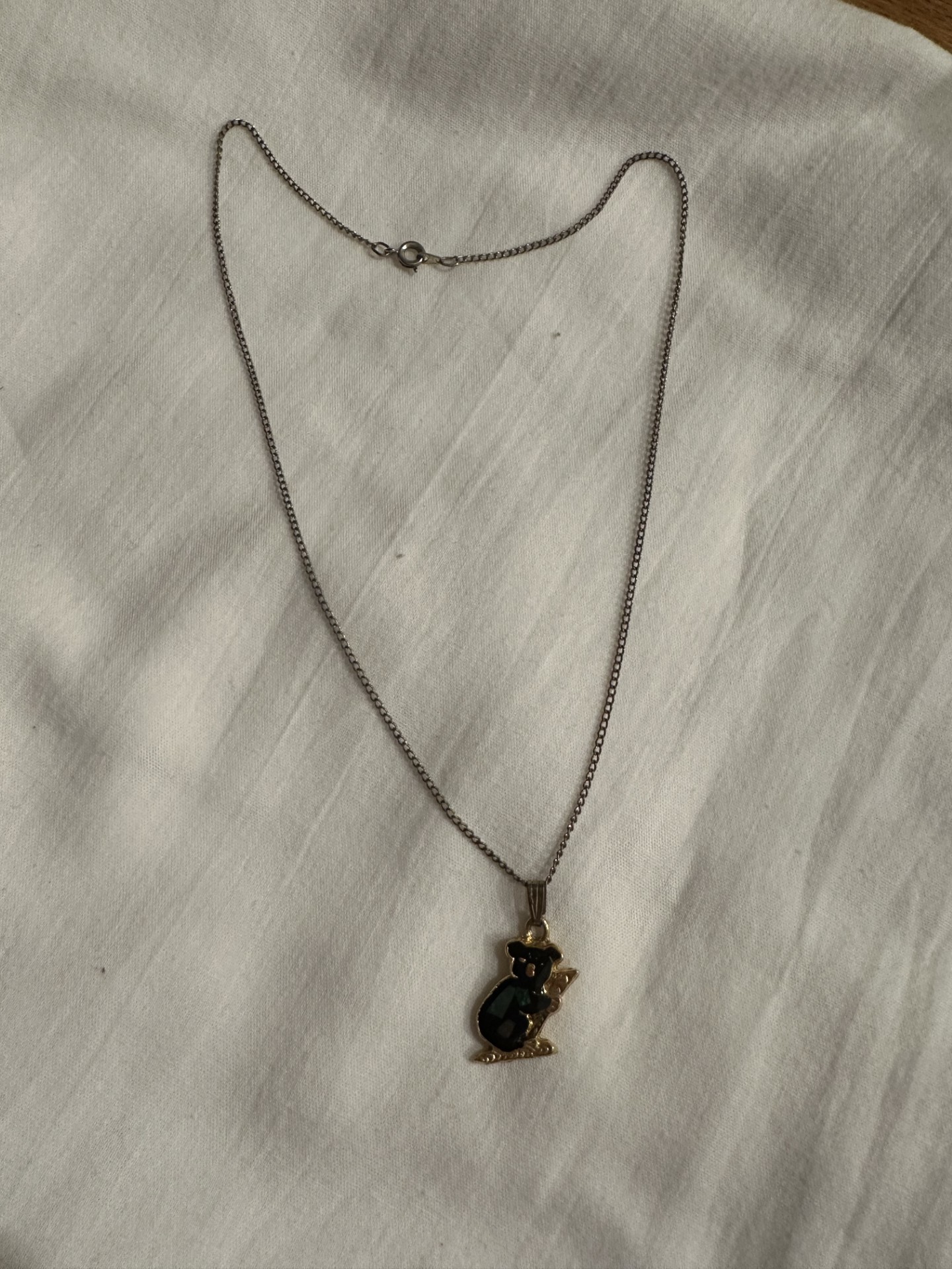 Te koop aangeboden: zilverkleurige ketting met een goudkleurige koala hanger.