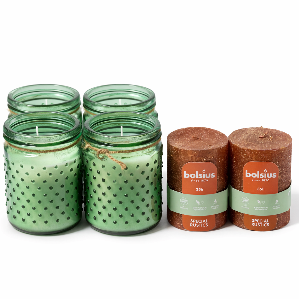 Partij kaarsen: 4x groene citronella + 2x Bolsius rustiek