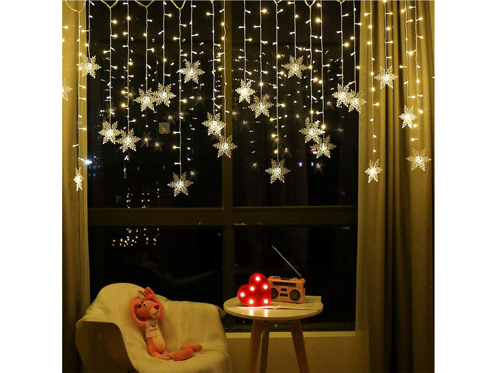 Creëer een warme sfeer in de huiskamer, slaapkamer, keuken, garage en zelfs in de winkel. De verlichting heeft een gordijn ontwerp met sneeuwvlokken op verschillende hoogte die een unieke look geven aan elke ruimte. De verlichting is bedoeld voor binnen (in ieder geval een droge omgeving) en heeft een verlengsnoer van 1,5 die gratis wordt meegeleverd om het gordijn op elke gewenste plek te kunnen plaatsen. Kies uit 1 van de 8 modi op de schakelaar (van constant aan tot slow fade) en je bent klaar voor de gezellige, maar donkere dagen.