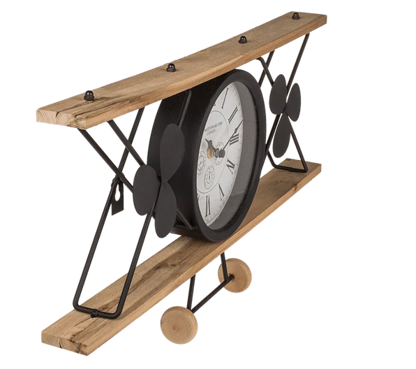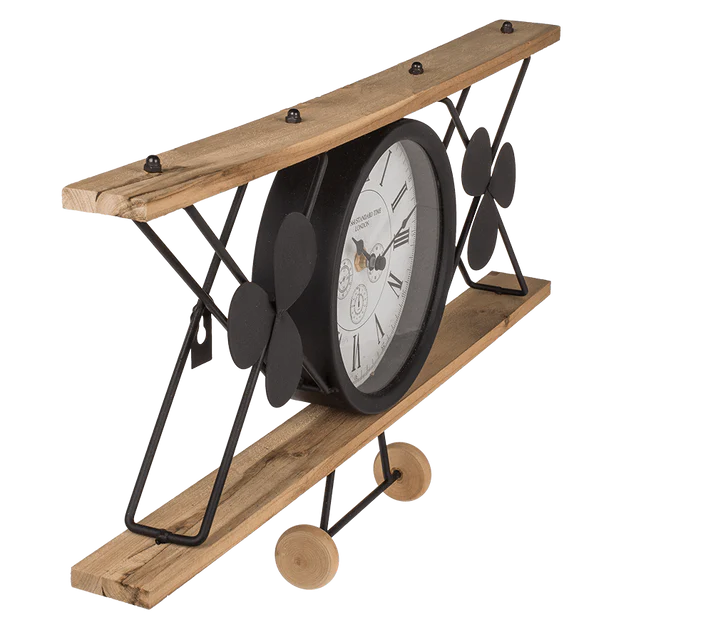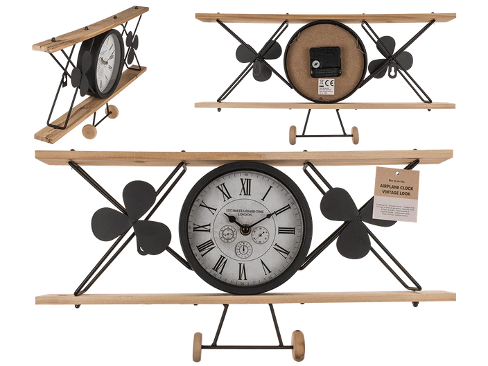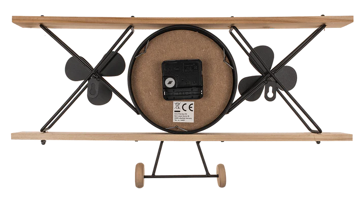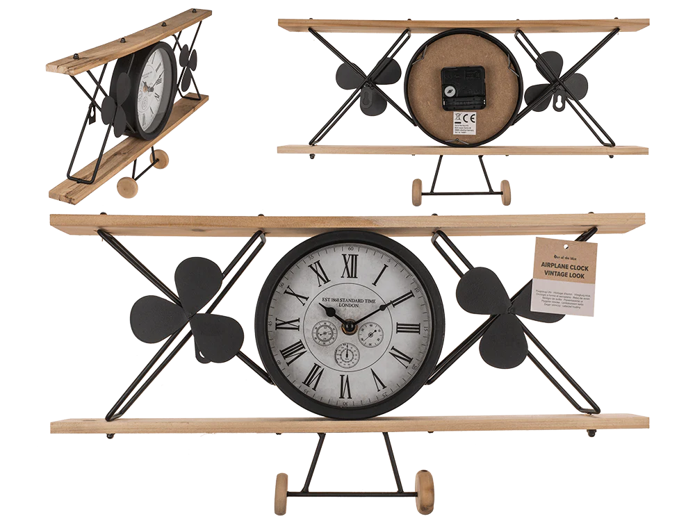 Vliegtuigklok, vintage look, gemaakt van zwart materiaal.