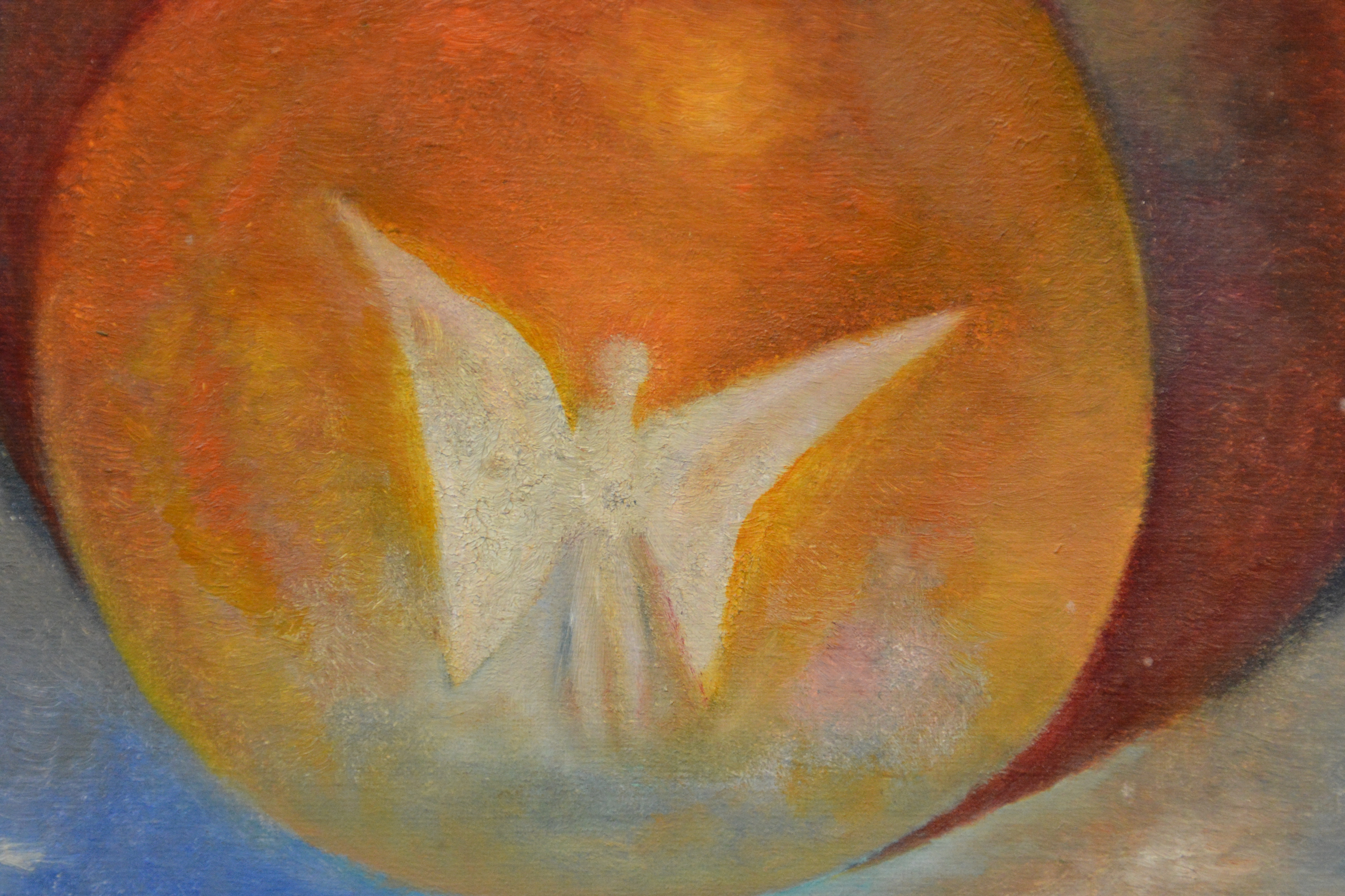 Ingelijst met houten lijst. In het midden met bollen een gevleugelde figuur. In heldere kleuren geschilderd. Niet zichtbaar gesigneerd. In goede staat.