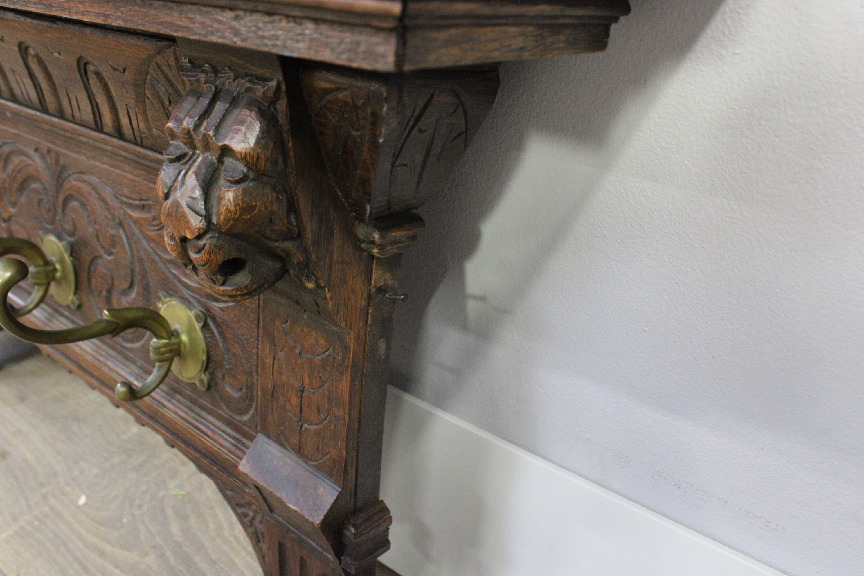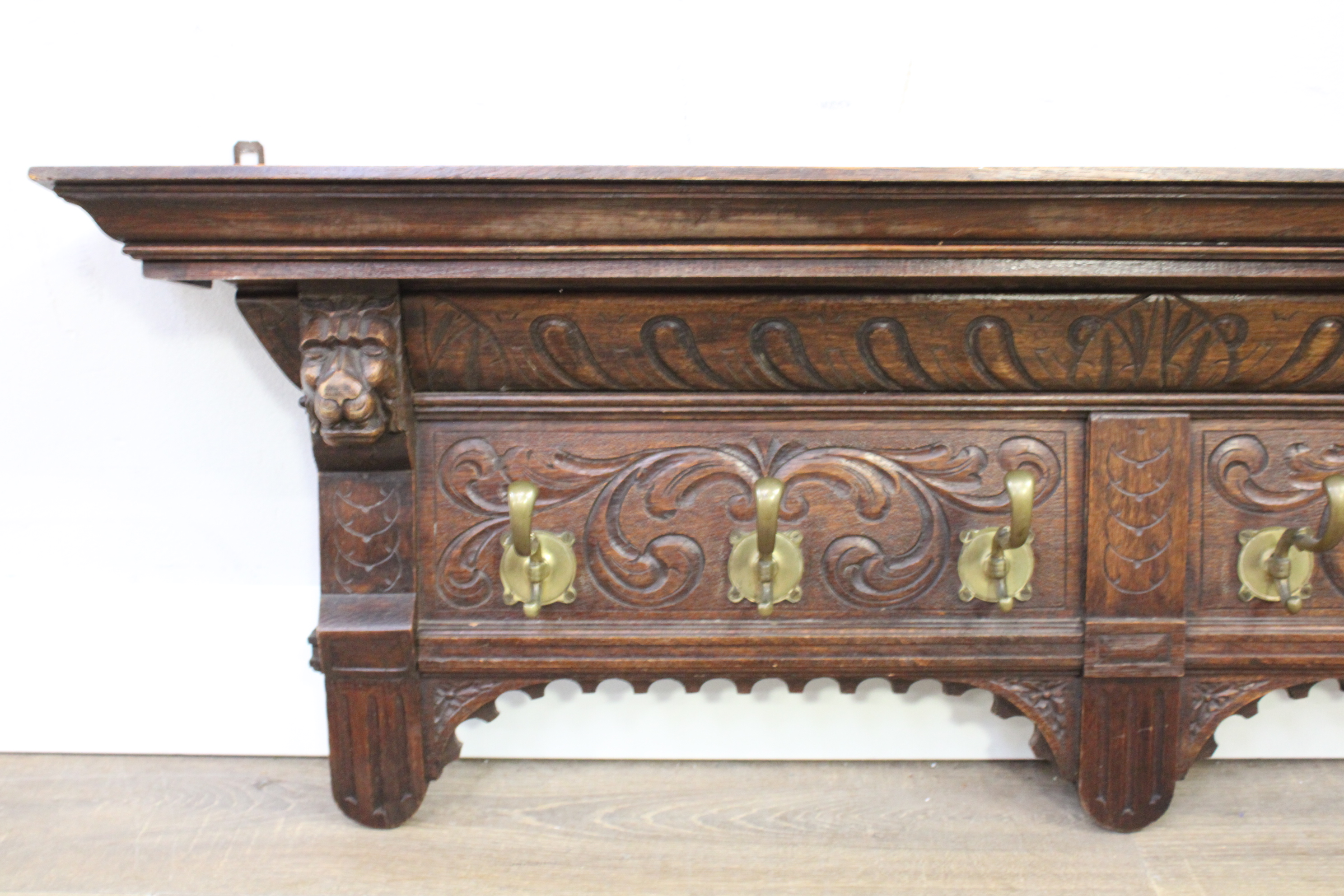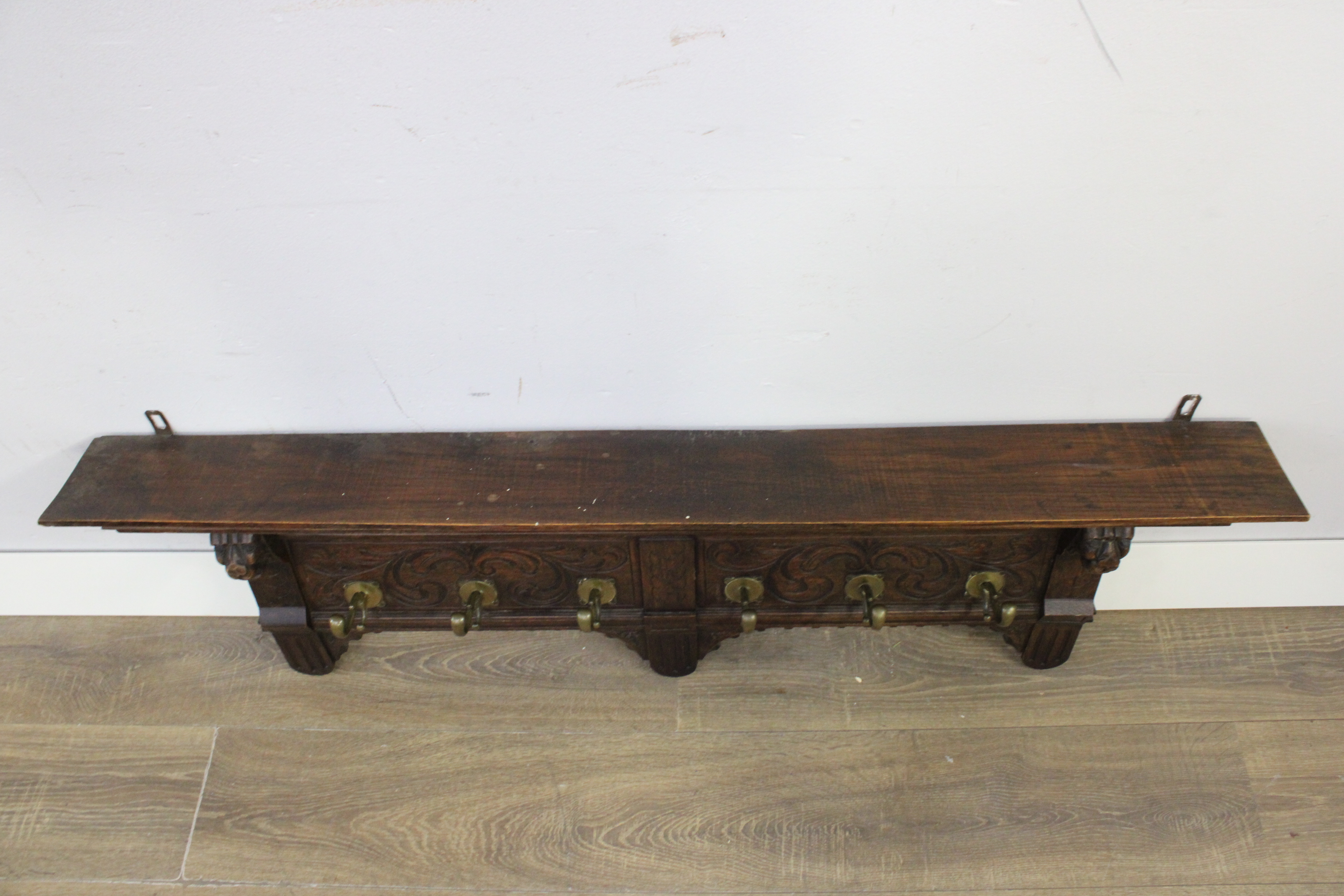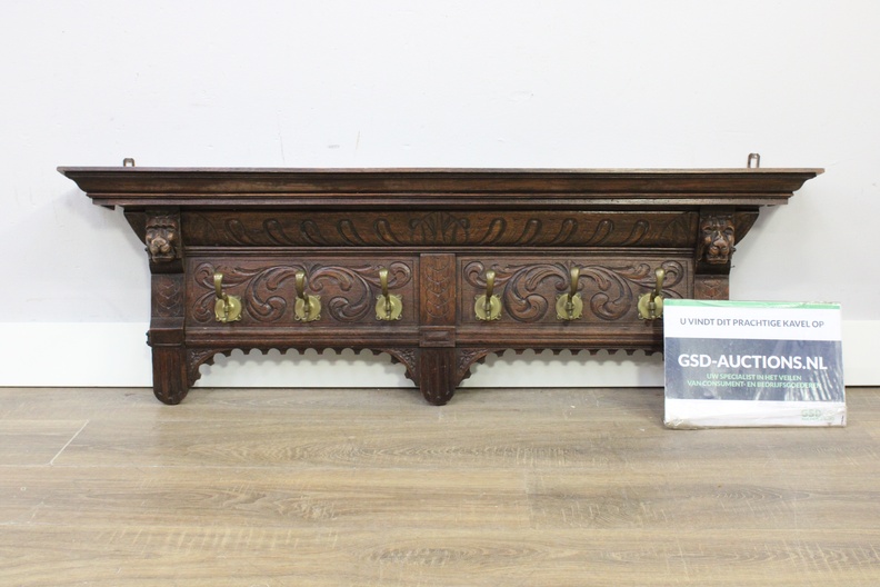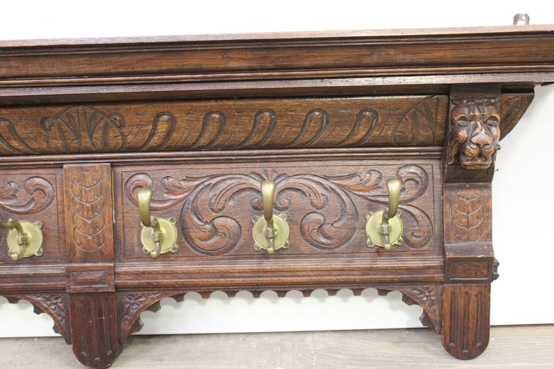 Antiek Houten Wandkapstok met 6 Messing Haken