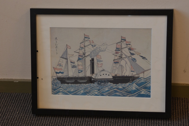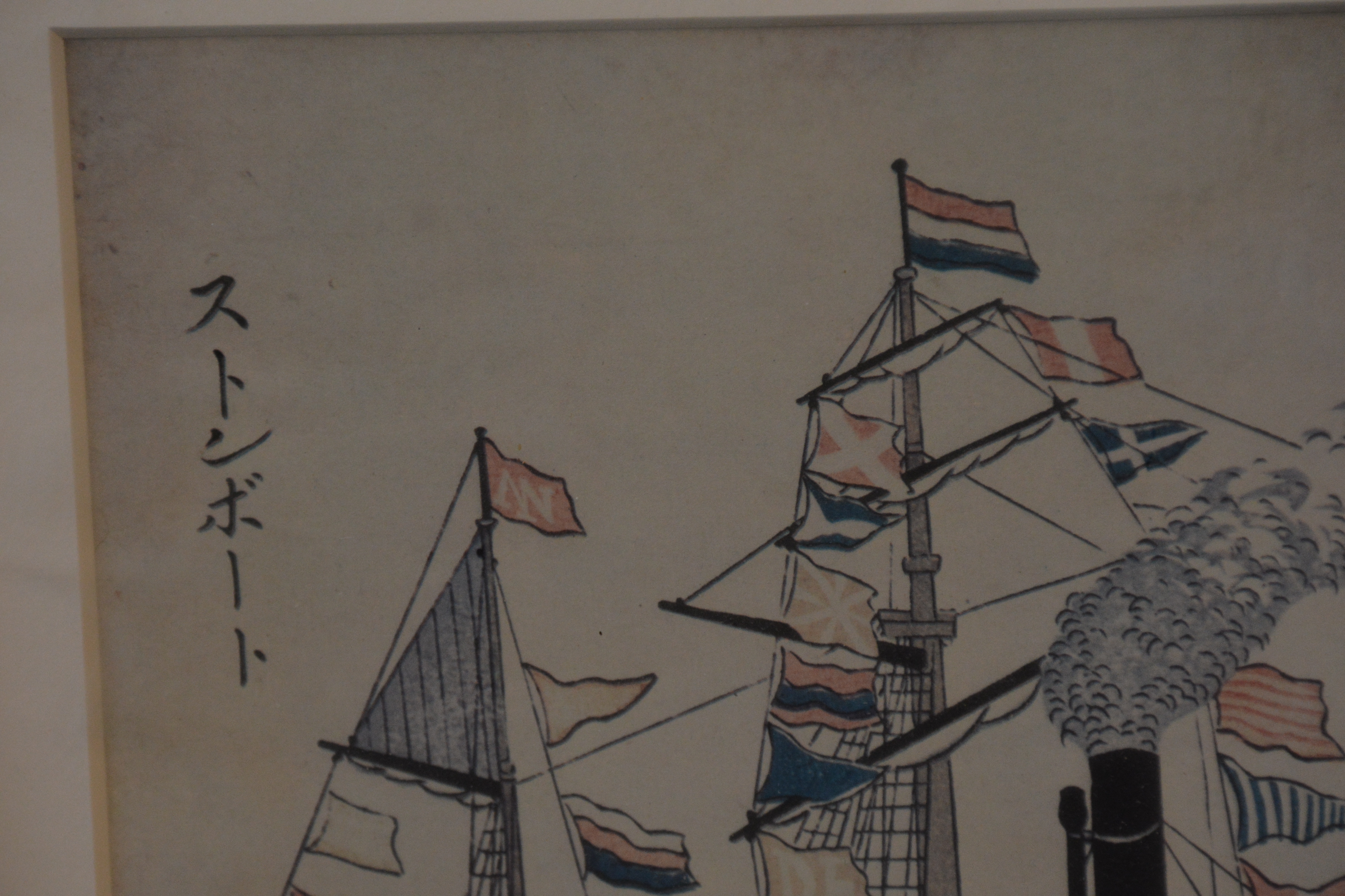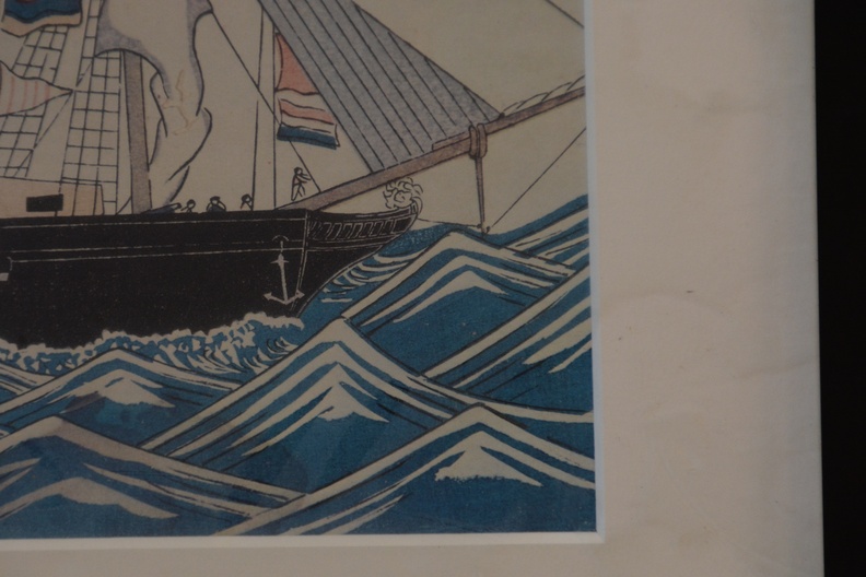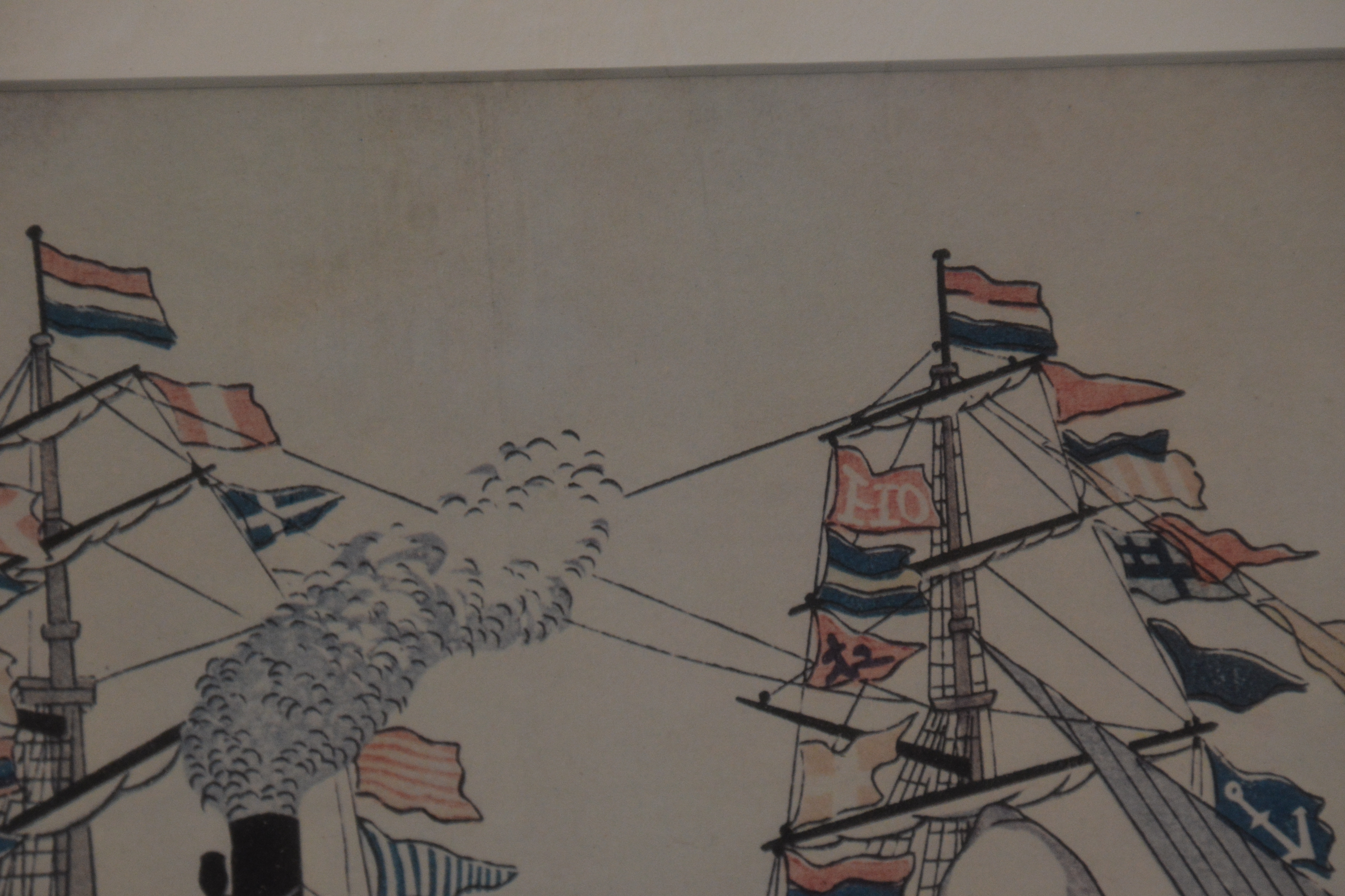Onbekend wie de maker is. We zien Nederlandse schepen en de vlag van Nagasaki. Ingelijst, Lijst zit wat los. Werk verkeert in goede staat.