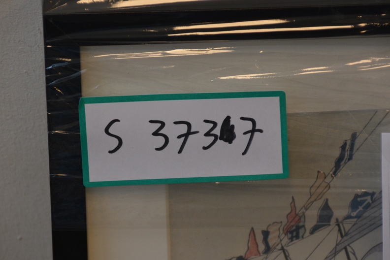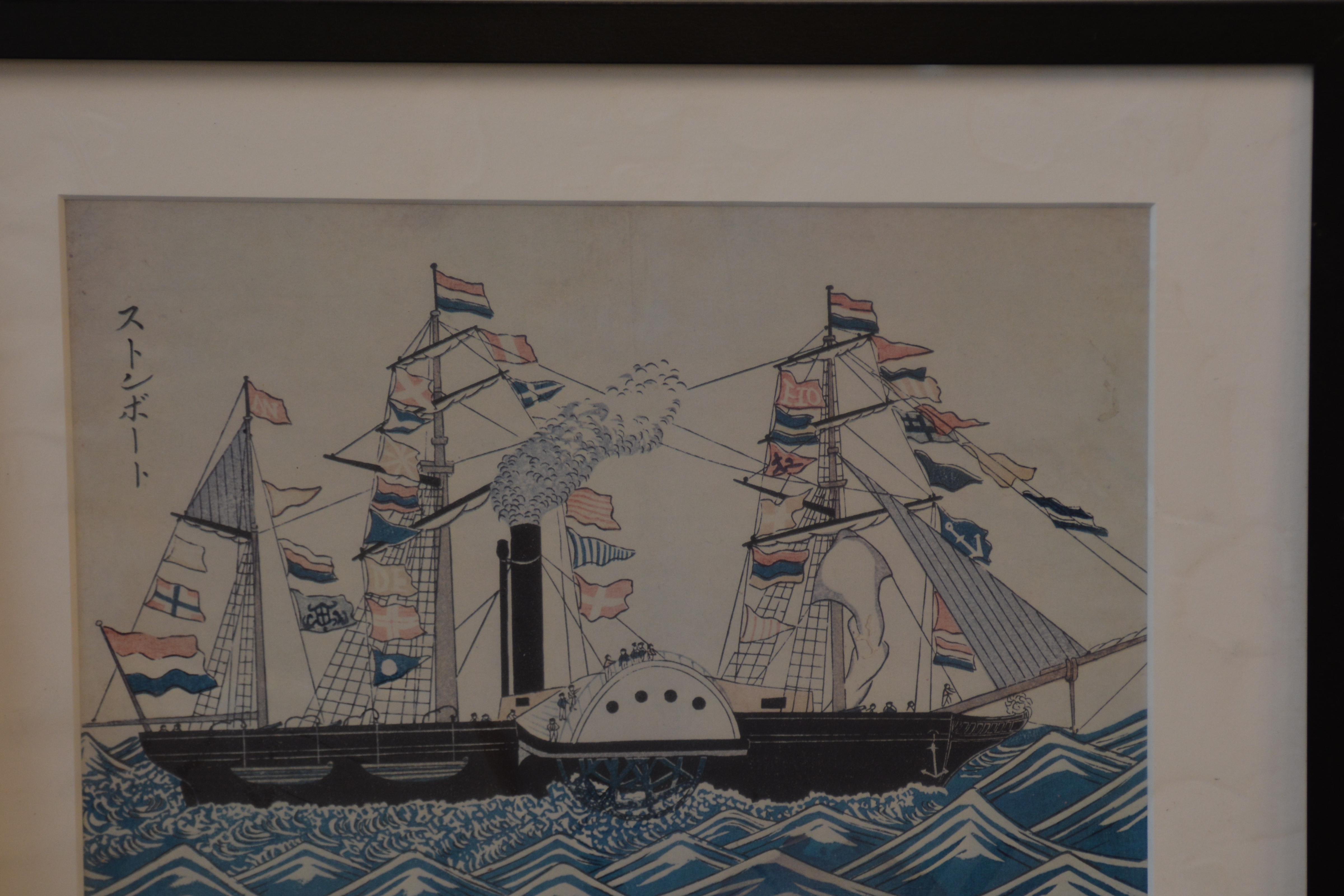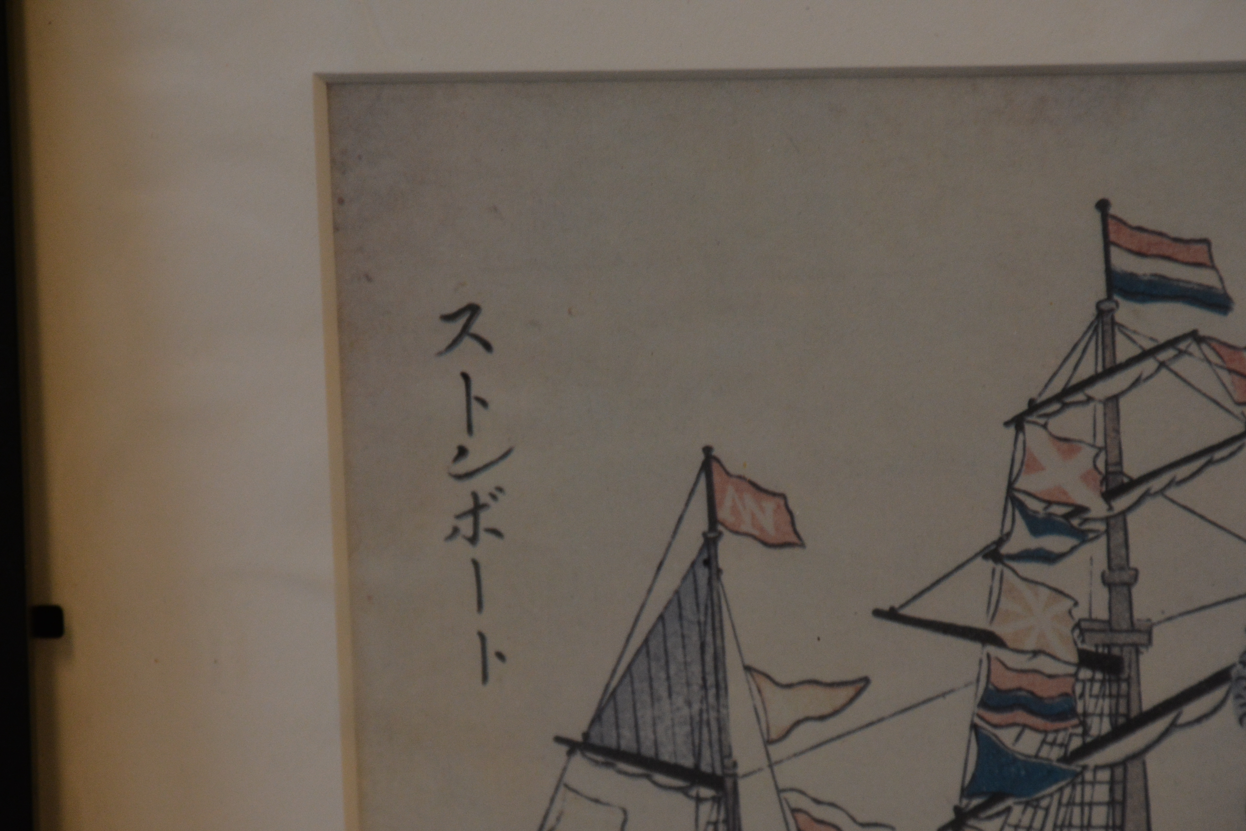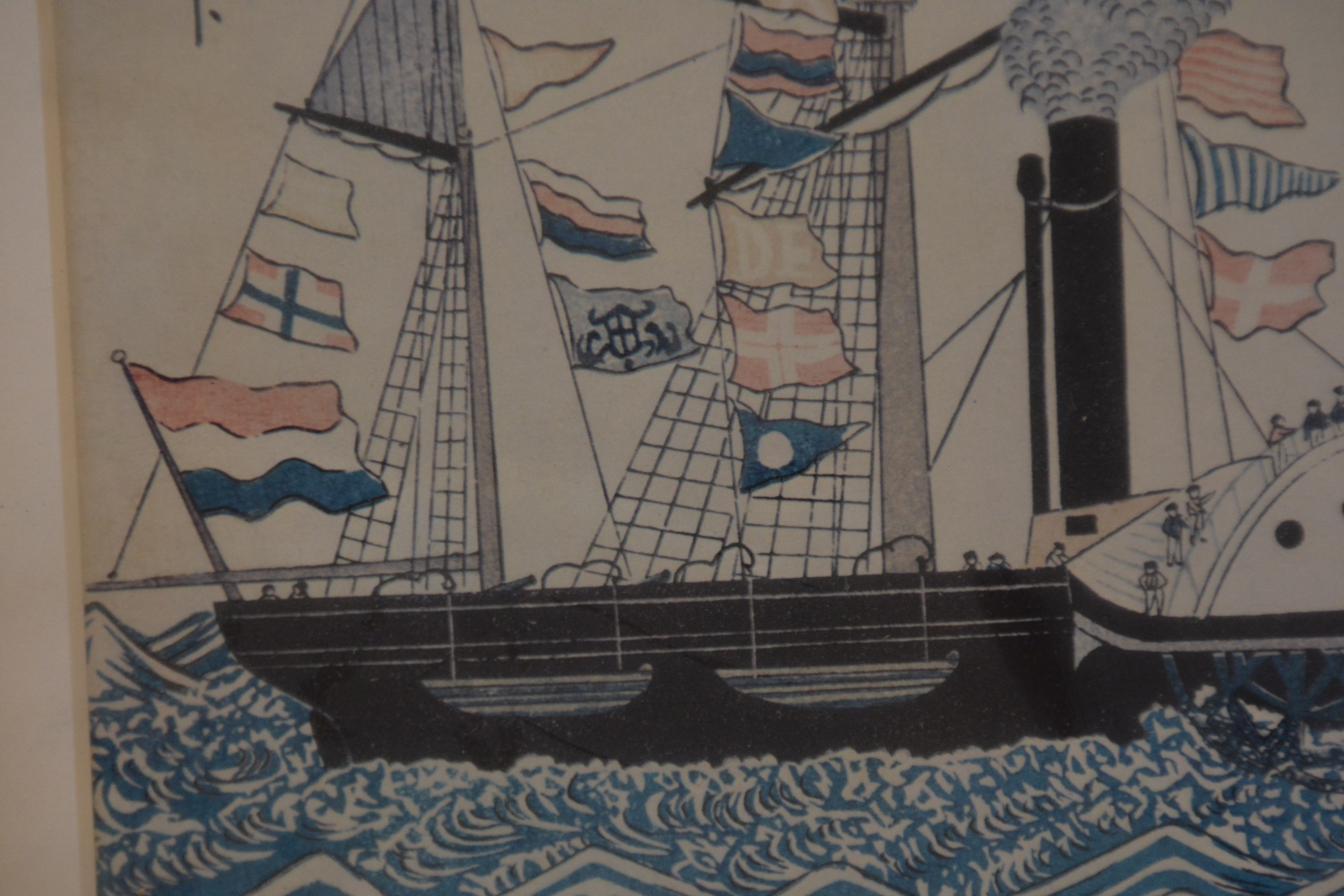 Onbekend wie de maker is. We zien Nederlandse schepen en de vlag van Nagasaki. Ingelijst, Lijst zit wat los. Werk verkeert in goede staat.
