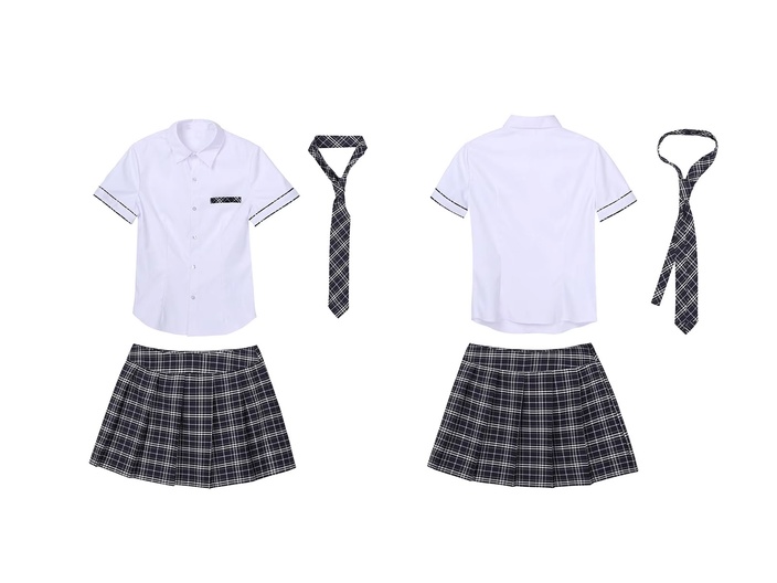 - Omslagkraag, korte mouwen, knoopsluiting aan de voorkant, met een nep borstzakje. Passend bij geruite mini-plooirok, verborgen ritssluiting aan de zijkant.