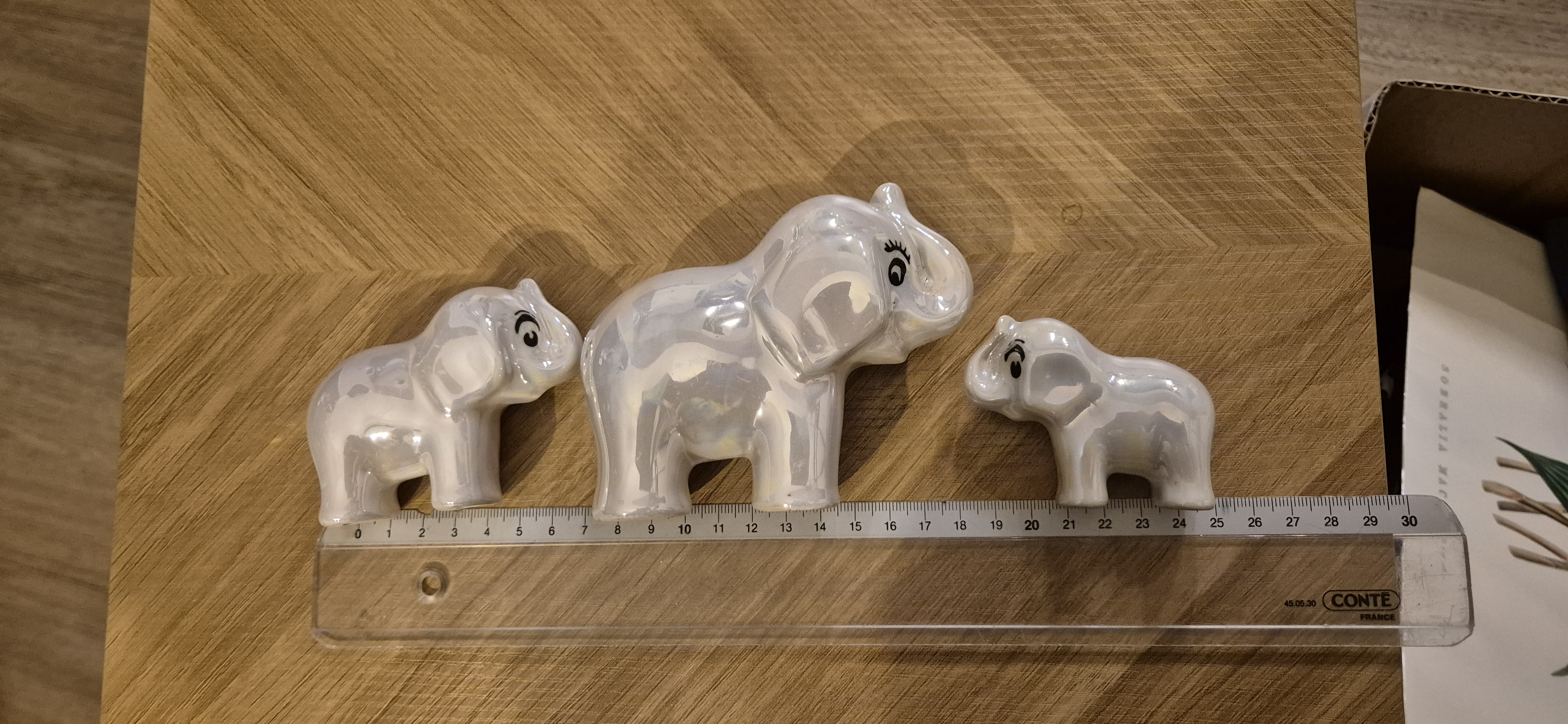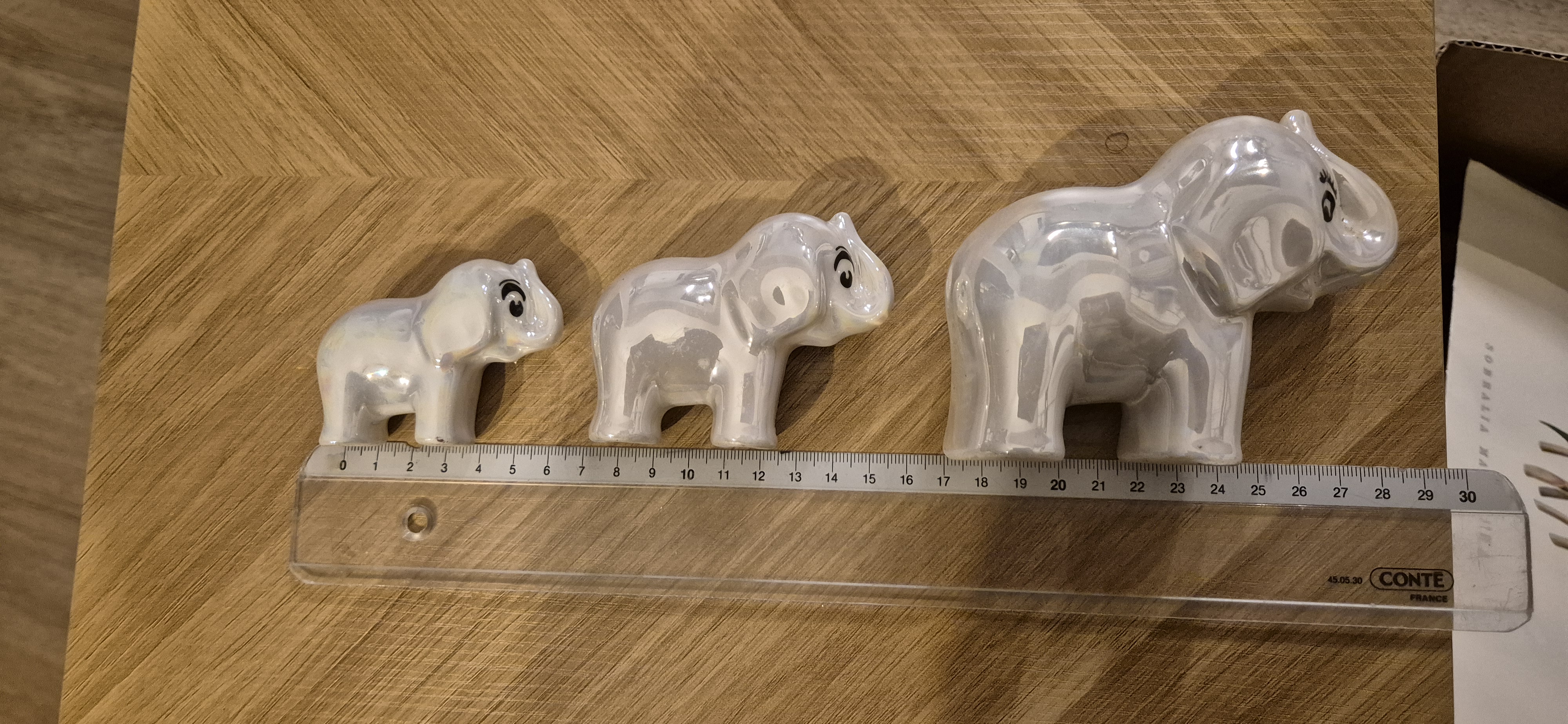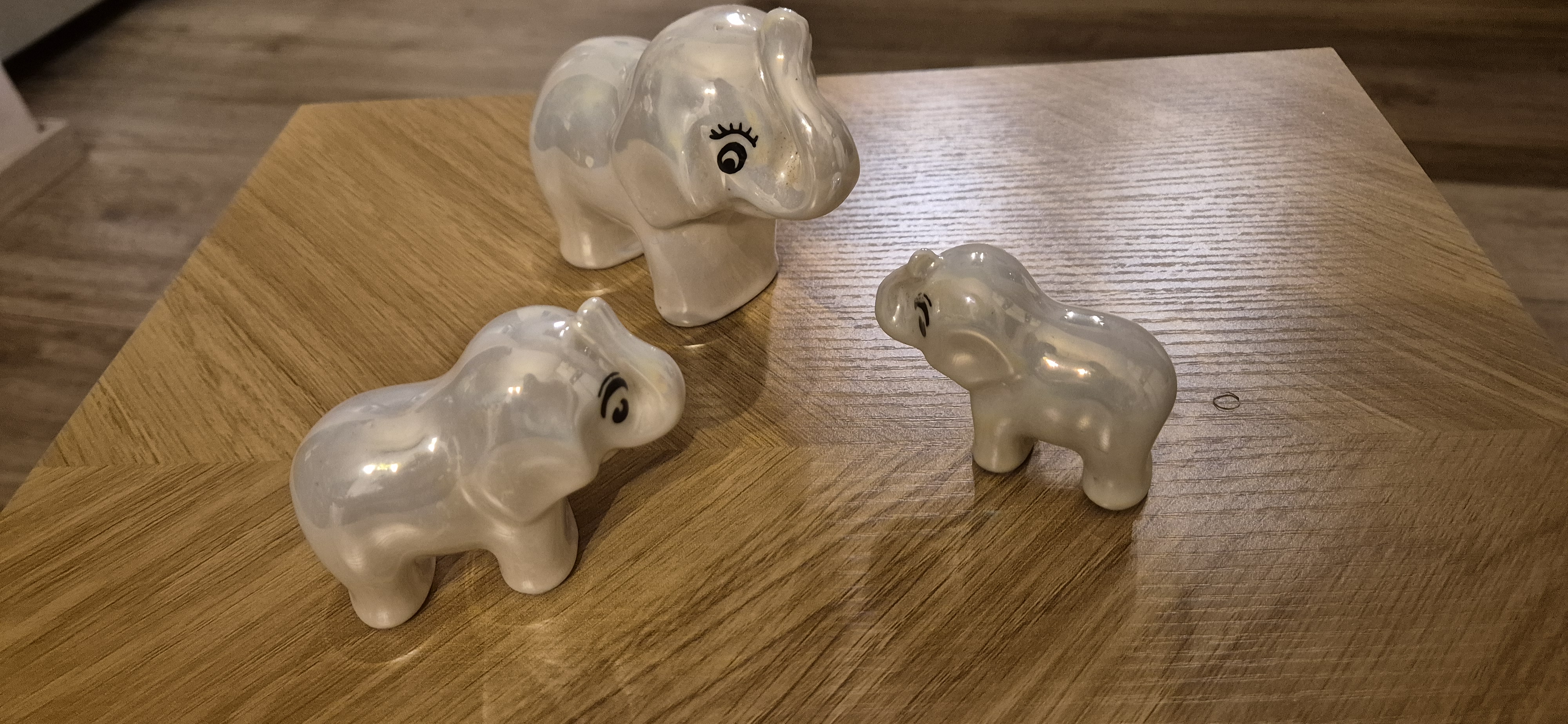 3 porseleinen parelmoer kleurige olifanten..zie foto’s