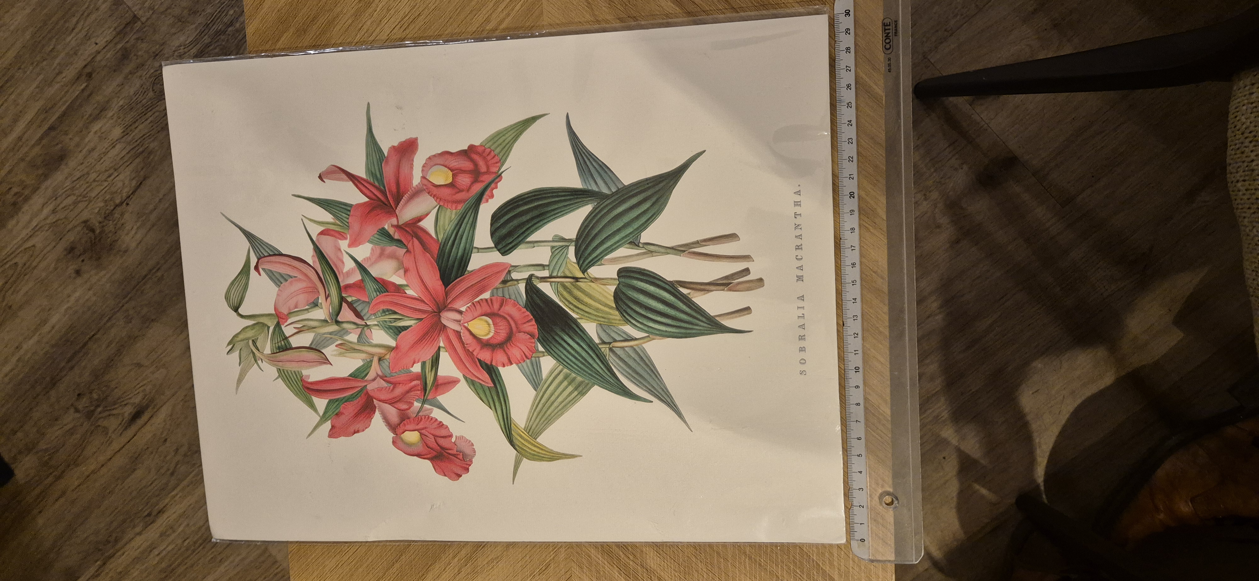 Prachtige botanische print van de Sobralia Macrantha, een elegante orchidee met opvallende rode bloemen en groene bladeren. De illustratie heeft een klassieke, vintage uitstraling en is gedrukt op stevig papier.