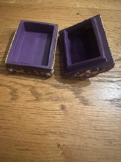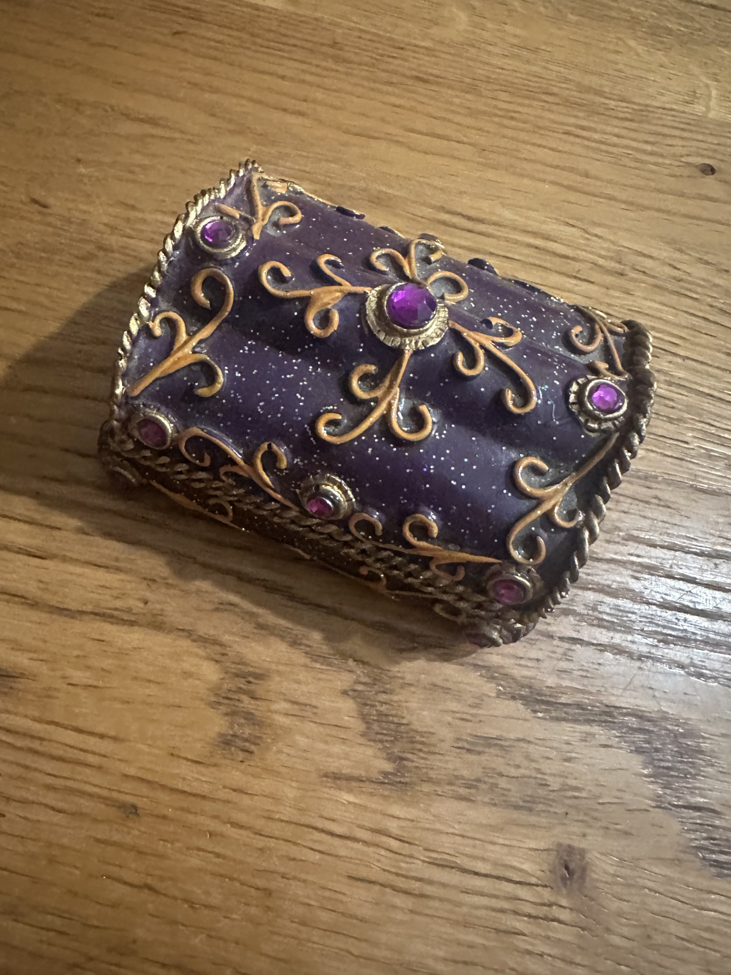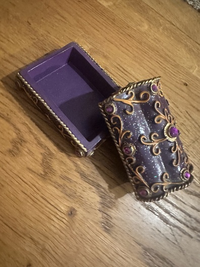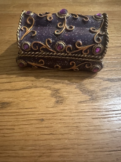 decoratief sieradendoosje in paarse kleur met goudkleurige versieringen en paarse sierstenen.