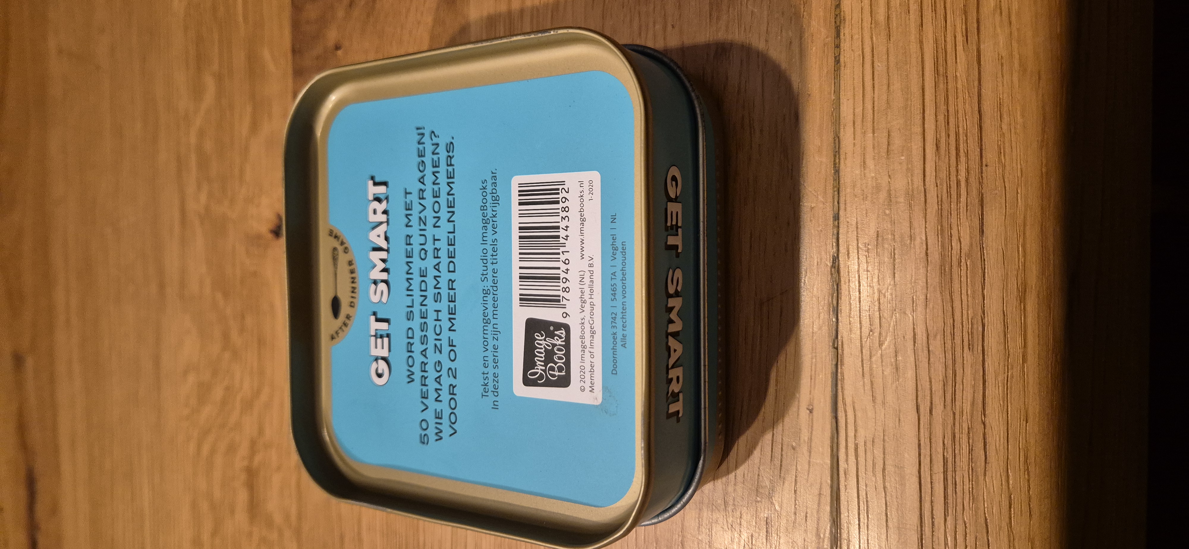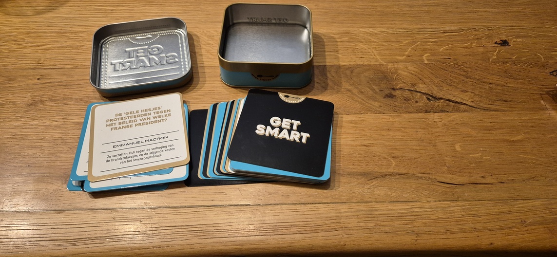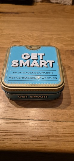 Te koop: het compacte quizspel Get Smart. Een leuk blikje met 50 uitdagende vragen en verrassende weetjes. Ideaal voor een gezellige avond, op reis of als cadeautje.